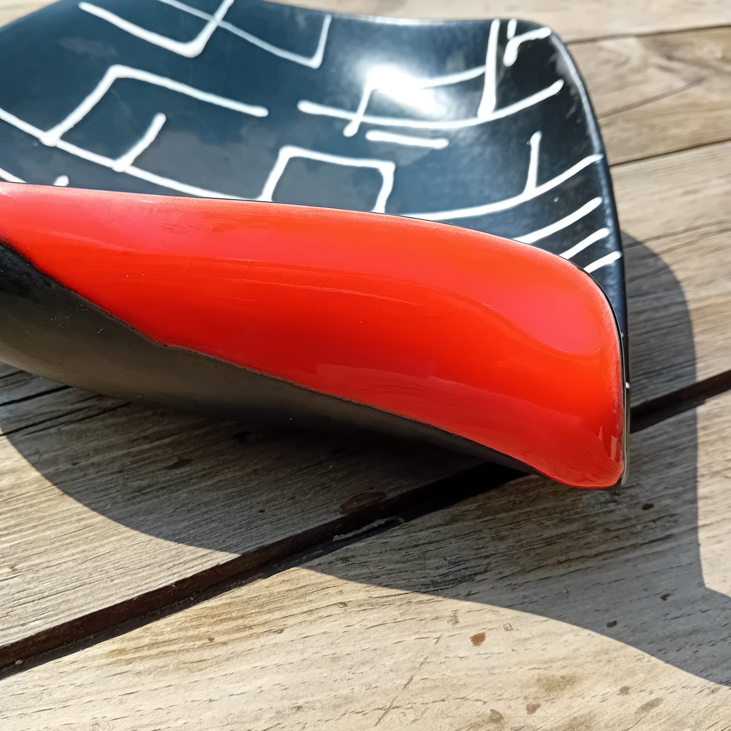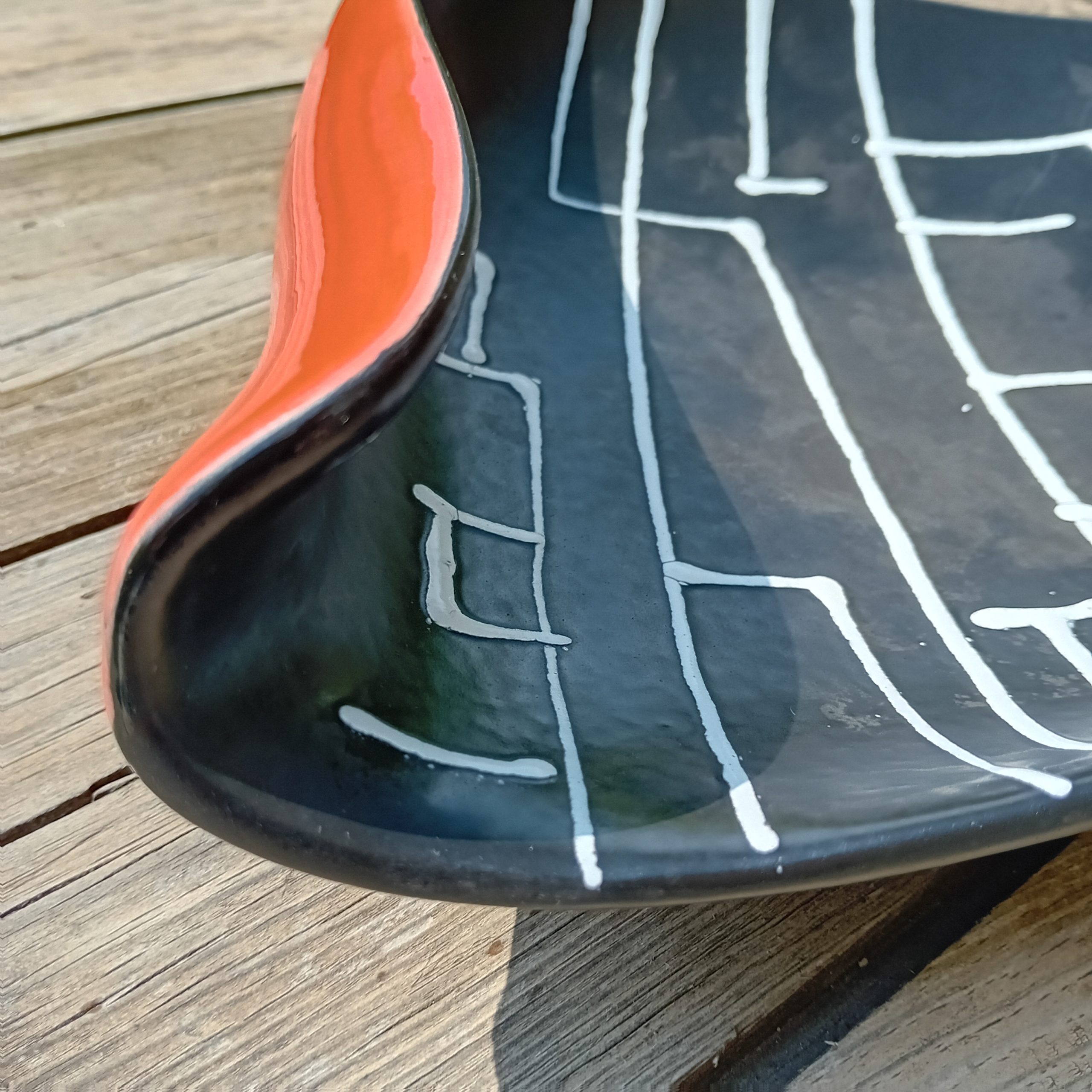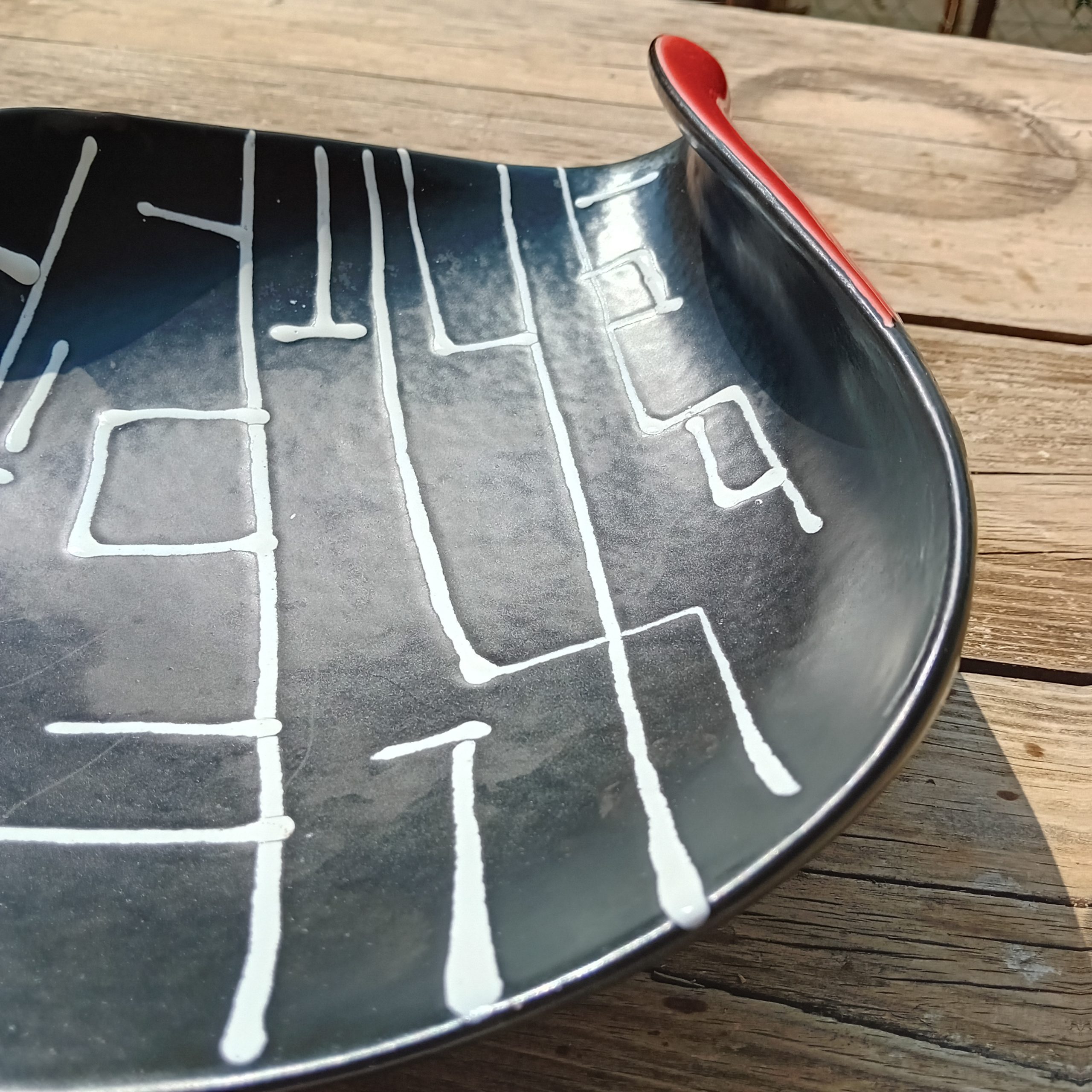 Élégant plat décoratif en céramique émaillée noire, relevé par une bande latérale rouge vif. Le décor abstrait en lignes blanches rappelle l’esthétique moderniste des années 1950/60.