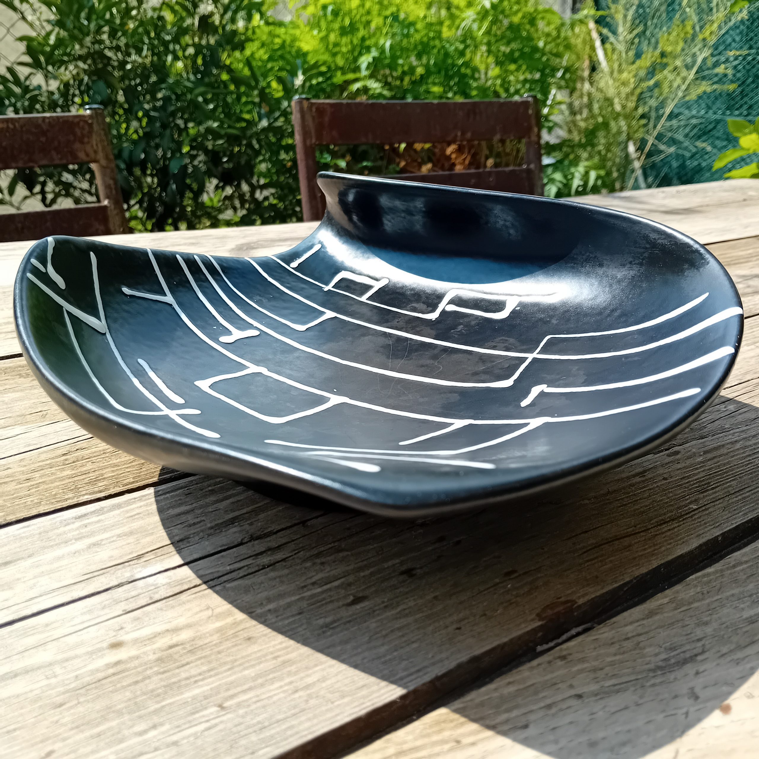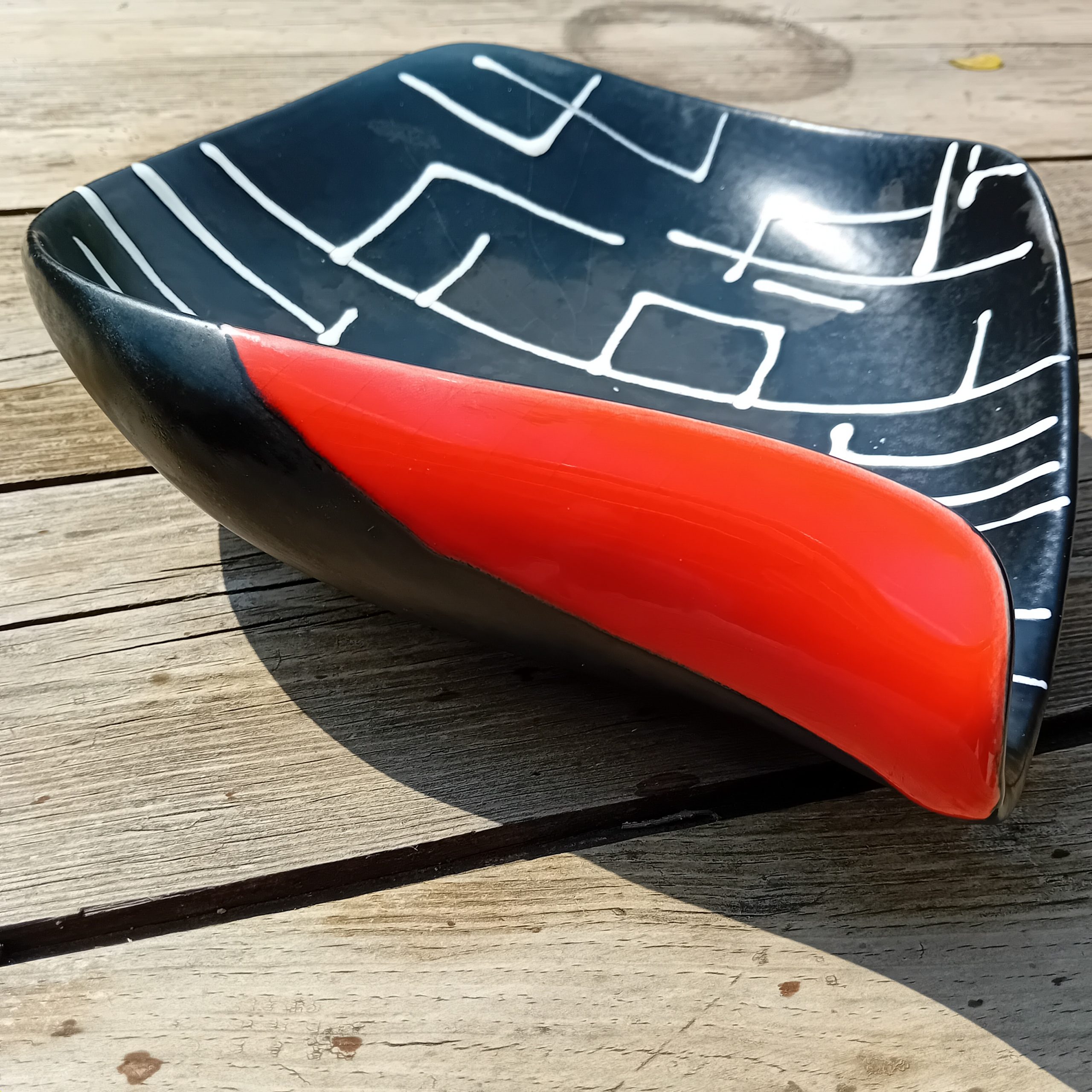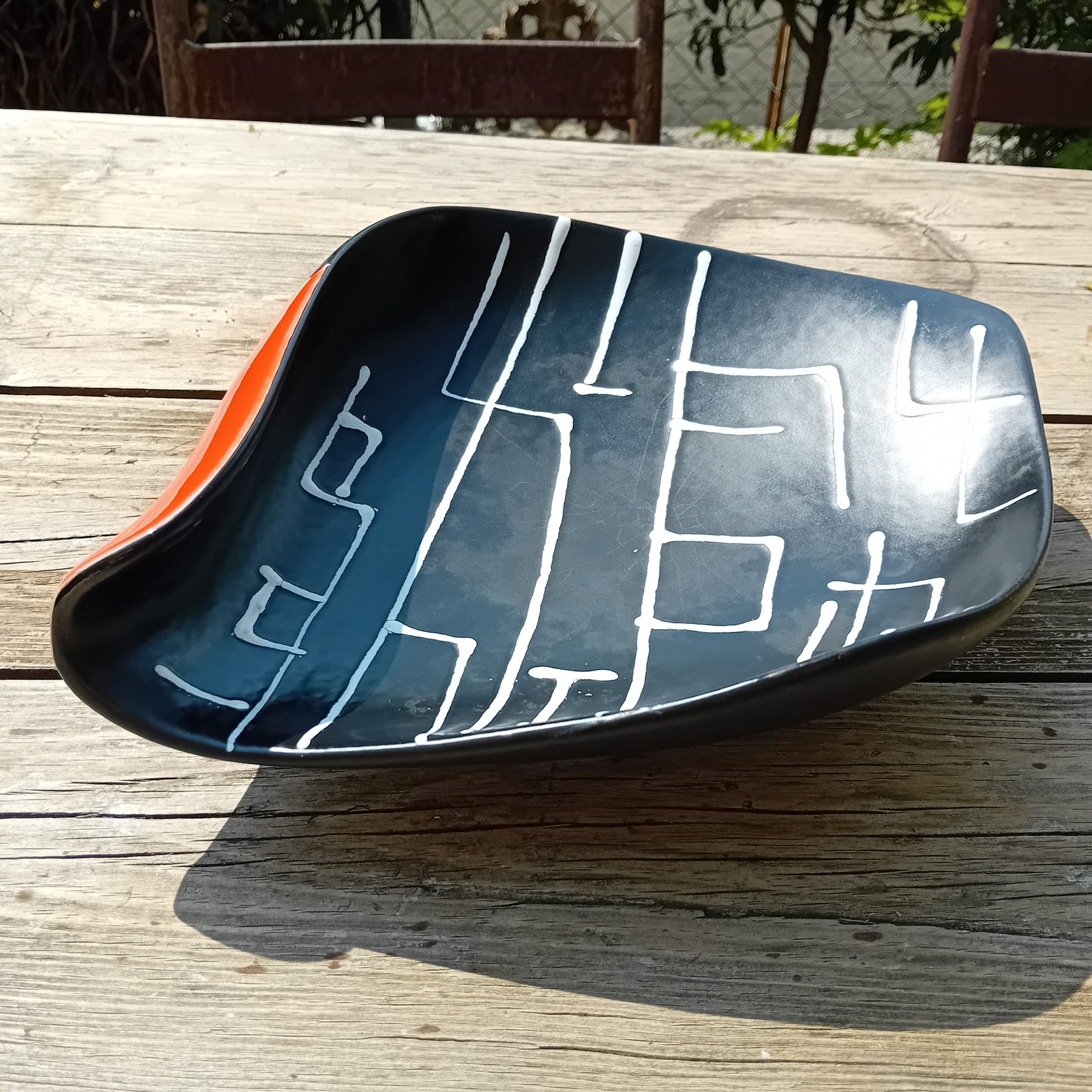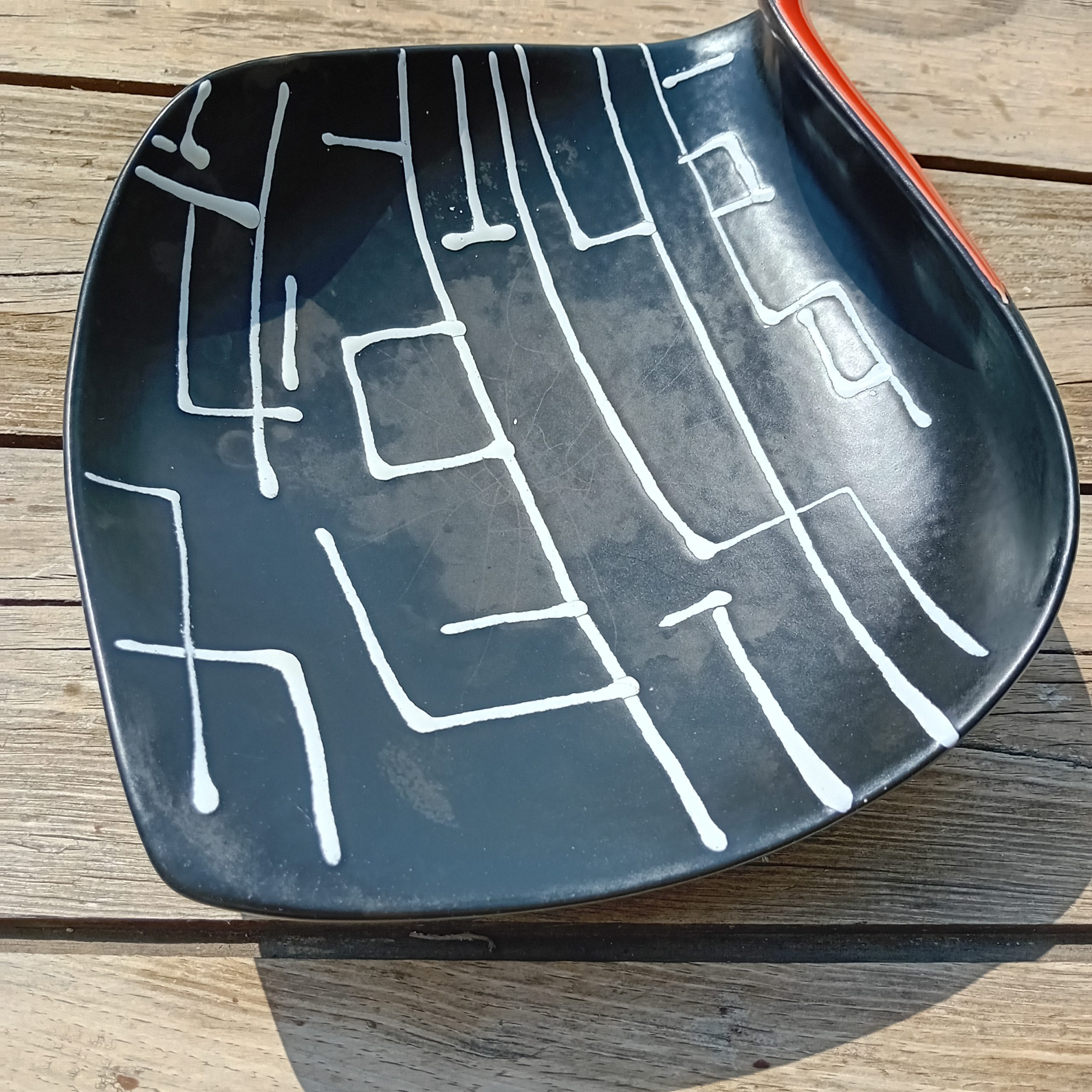 Élégant plat décoratif en céramique émaillée noire, relevé par une bande latérale rouge vif. Le décor abstrait en lignes blanches rappelle l’esthétique moderniste des années 1950/60.