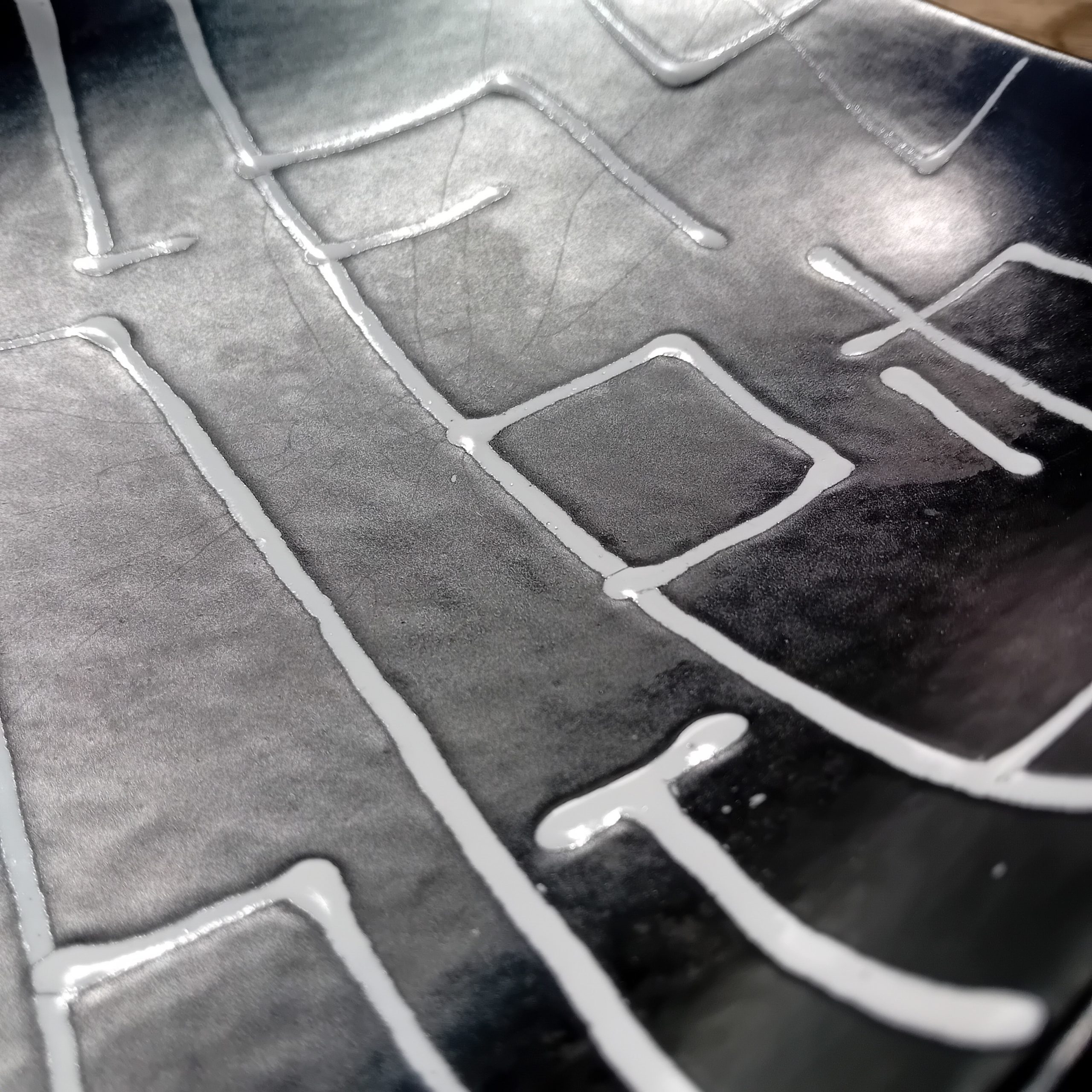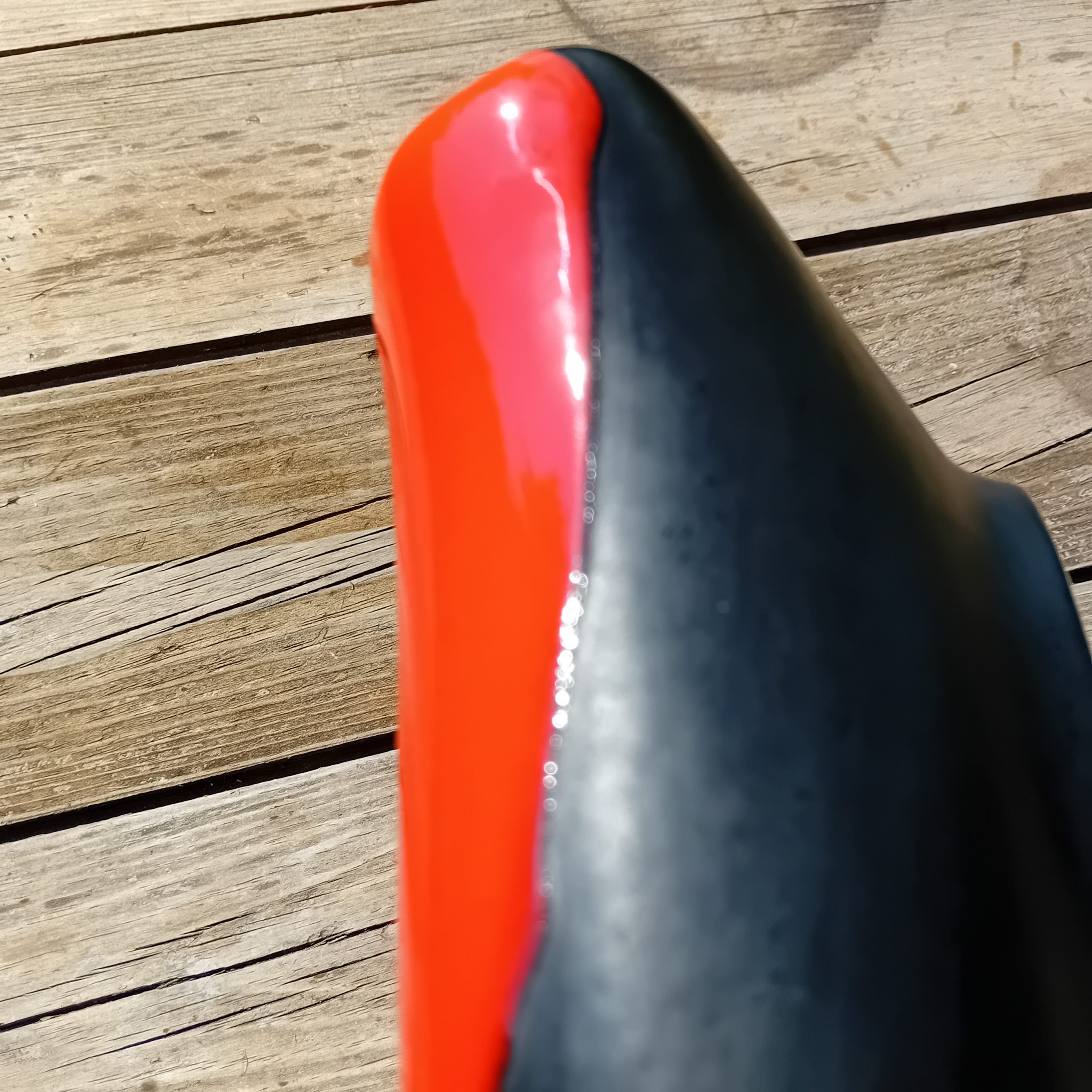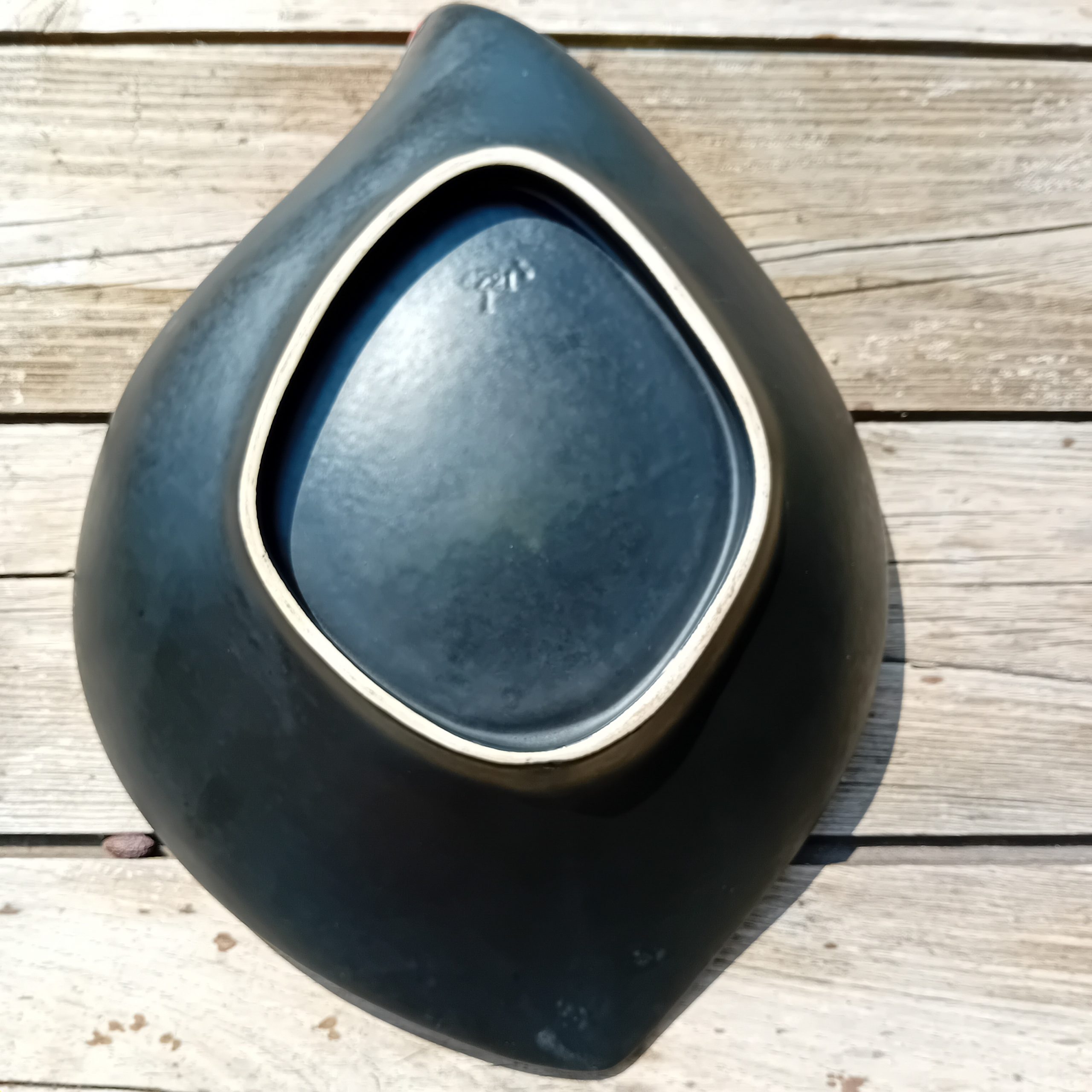 La pièce est numérotée 4221 au revers, ce qui laisse penser à une production limitée ou d’atelier. Sa forme libre, légèrement ondulée, met en valeur le contraste noir/rouge et la décoration graphique.