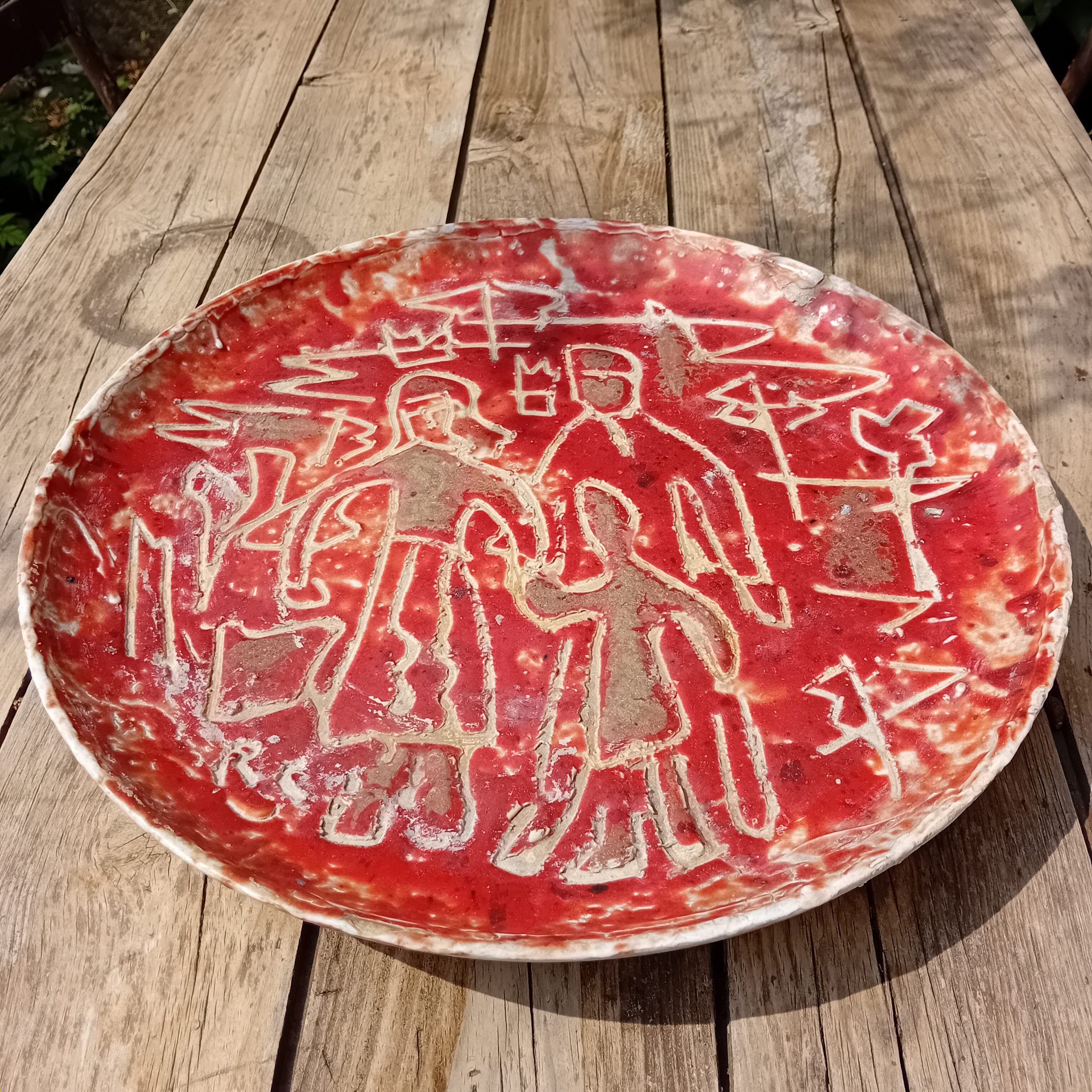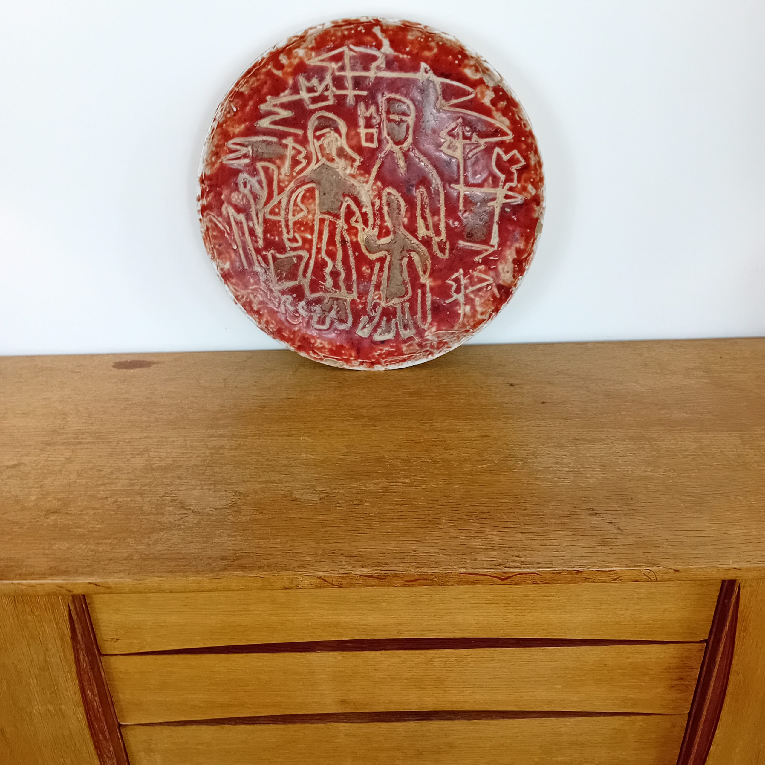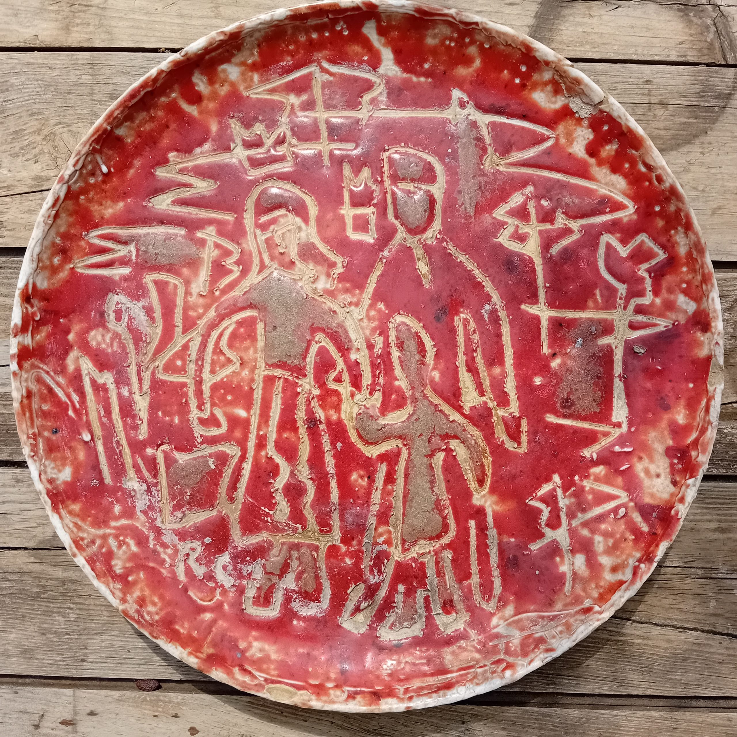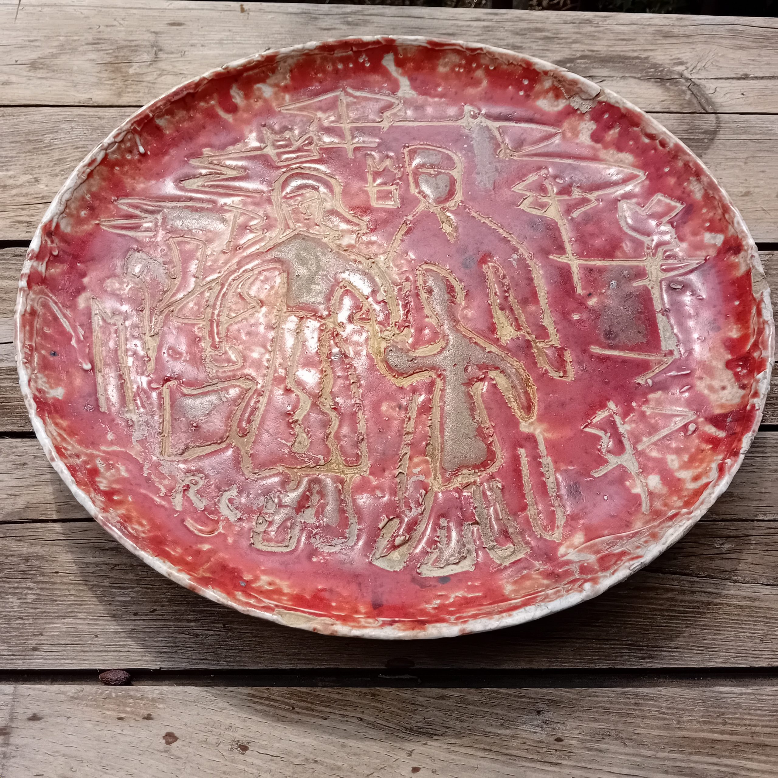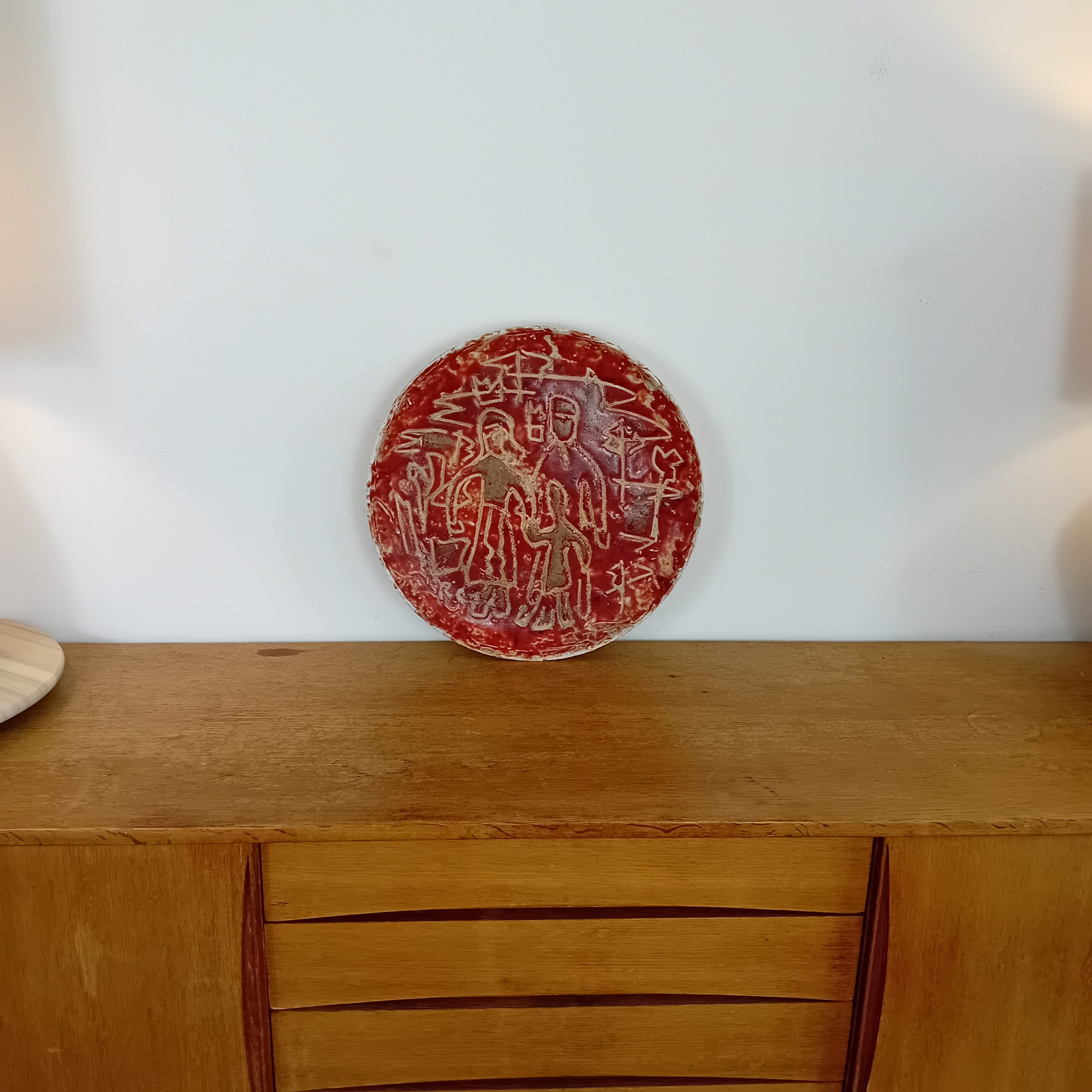 Spectaculaire plat mural en céramique émaillée rouge, signé RC, au décor incisé représentant une scène figurative stylisée. Les silhouettes gravées dans la masse, aux lignes brutes et expressives, rappellent l’art archaïsant et le mouvement brutaliste qui marqua la céramique d’après-guerre.