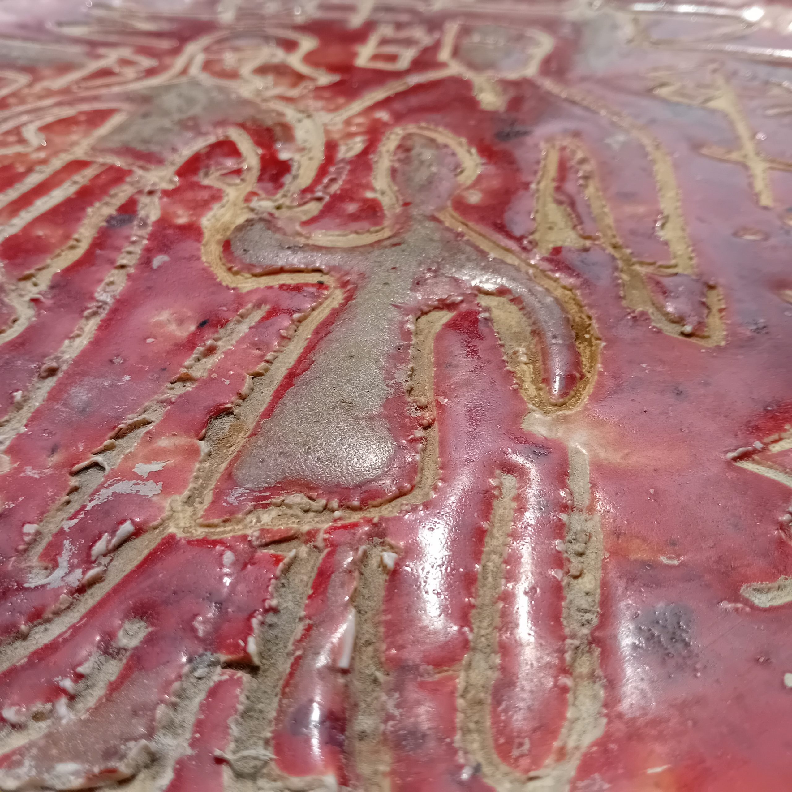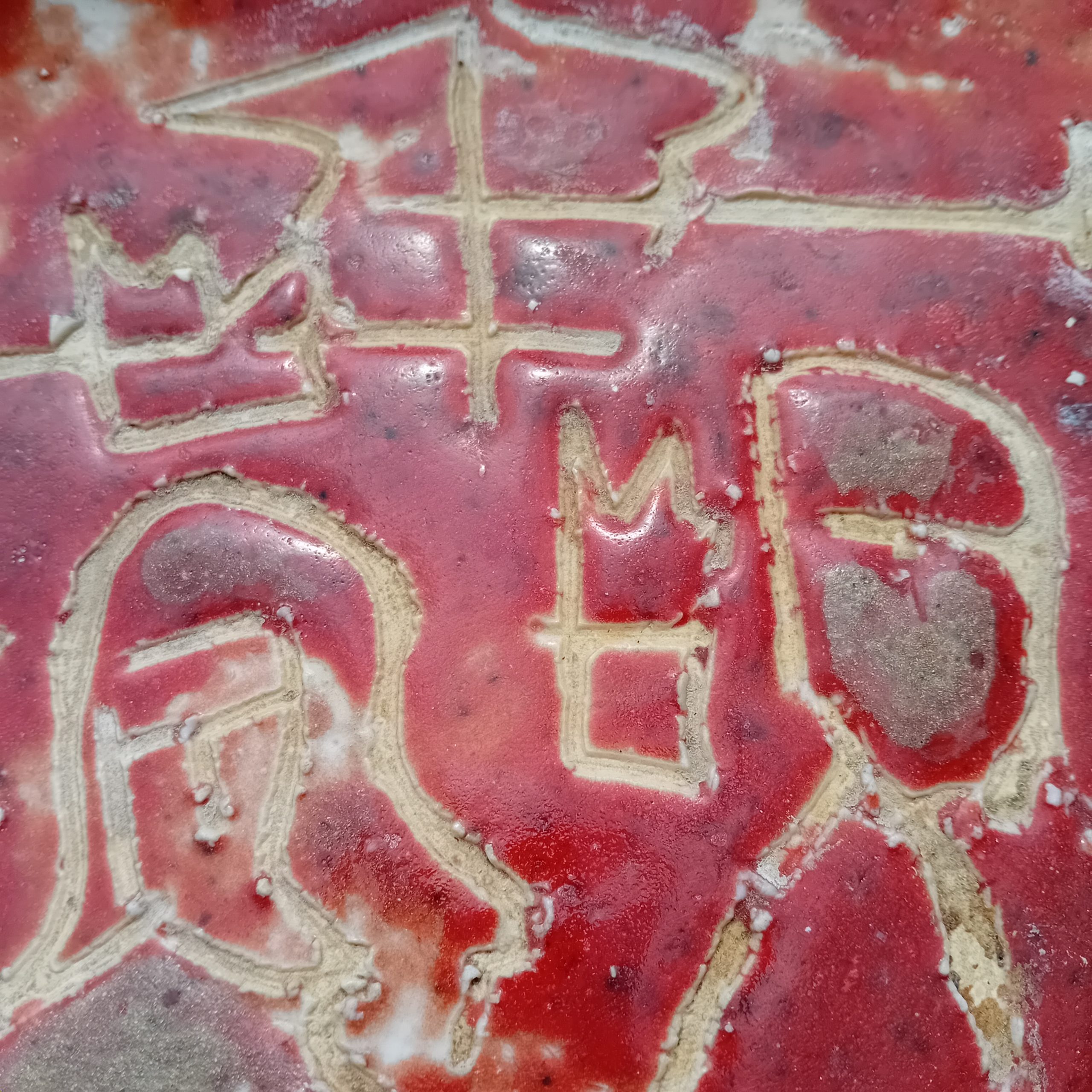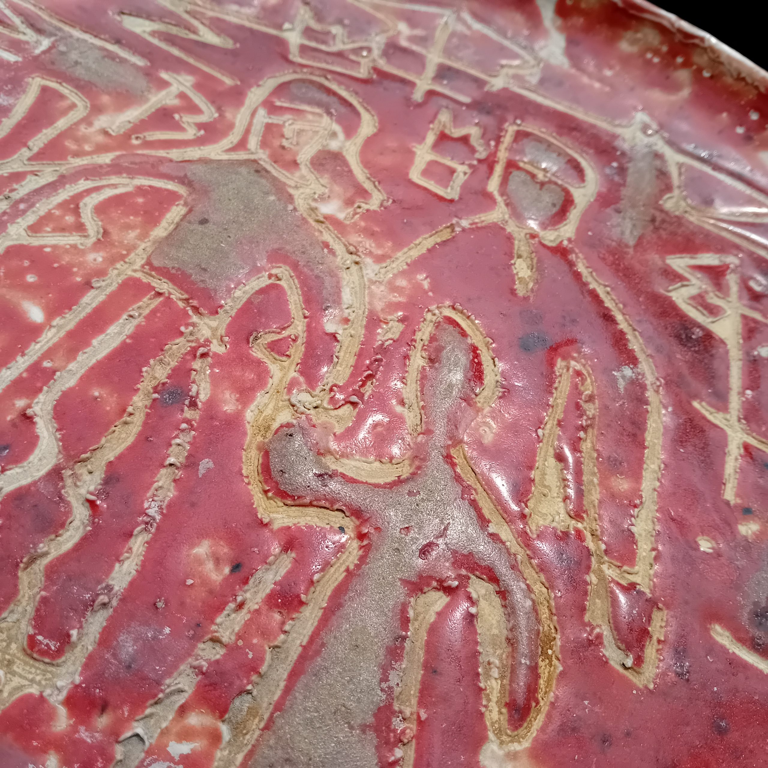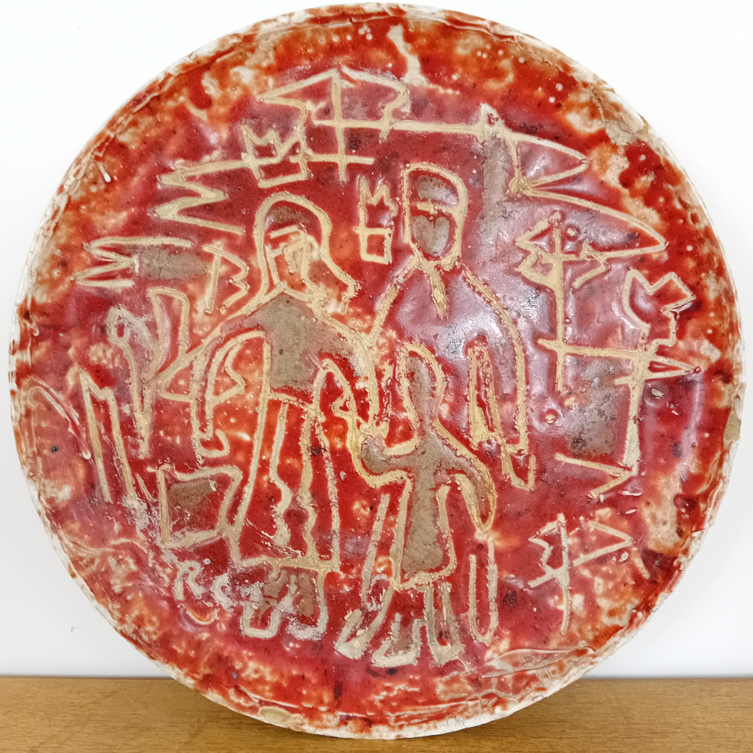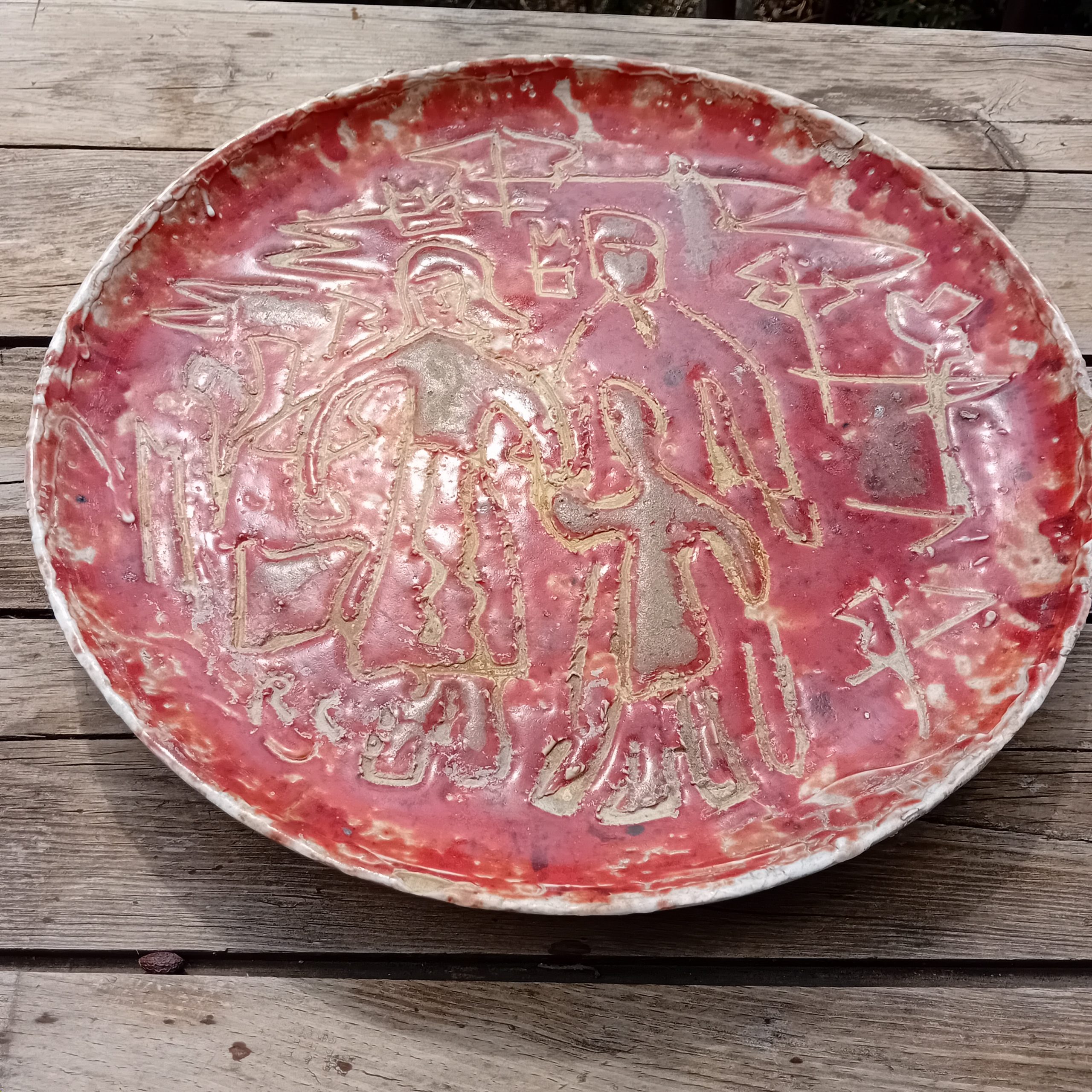 Spectaculaire plat mural en céramique émaillée rouge, signé RC, au décor incisé représentant une scène figurative stylisée. Les silhouettes gravées dans la masse, aux lignes brutes et expressives, rappellent l’art archaïsant et le mouvement brutaliste qui marqua la céramique d’après-guerre.