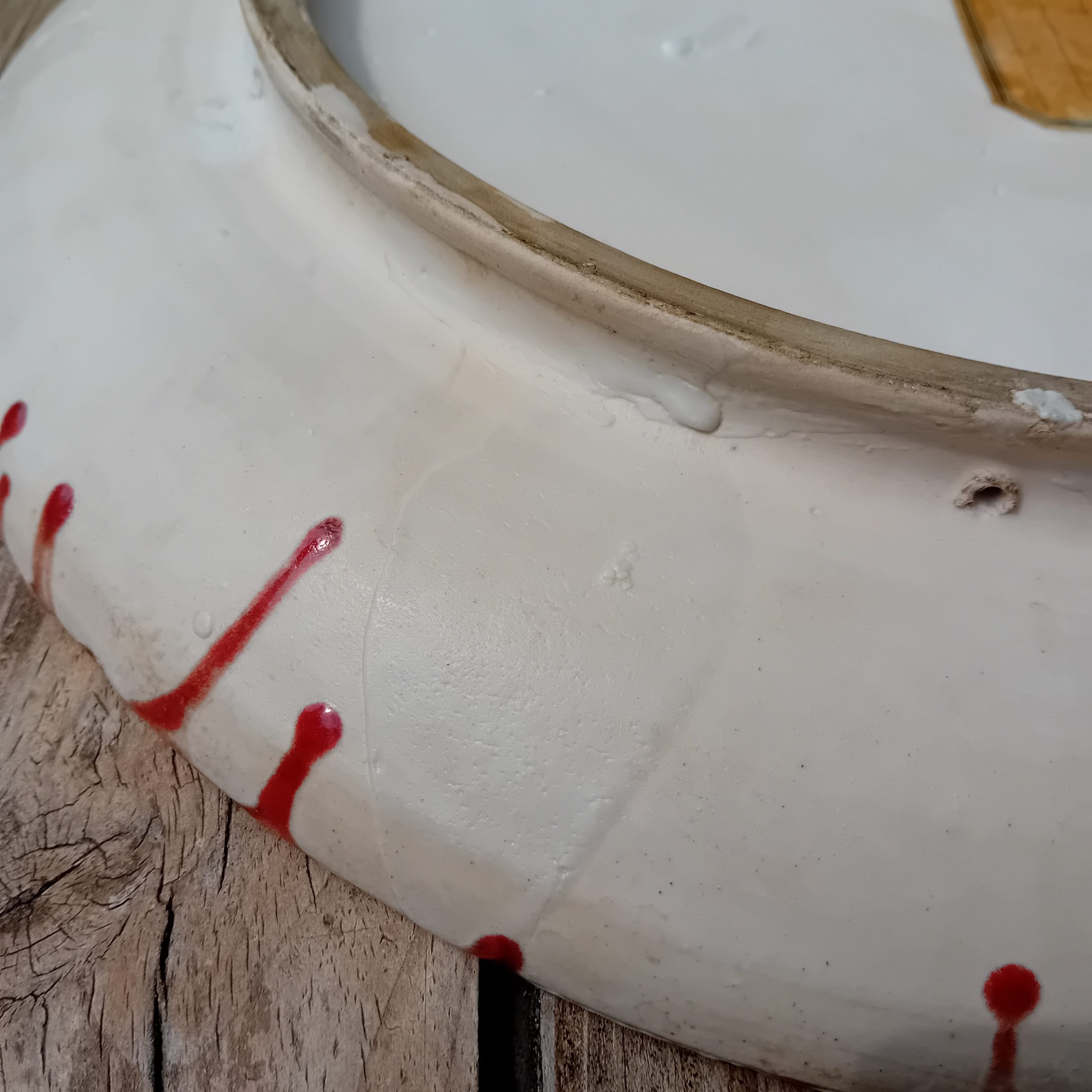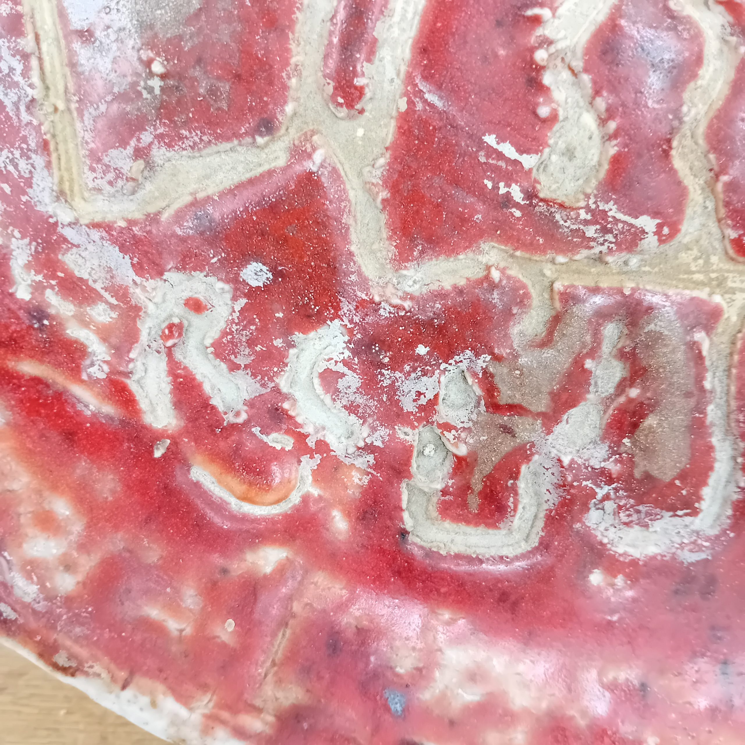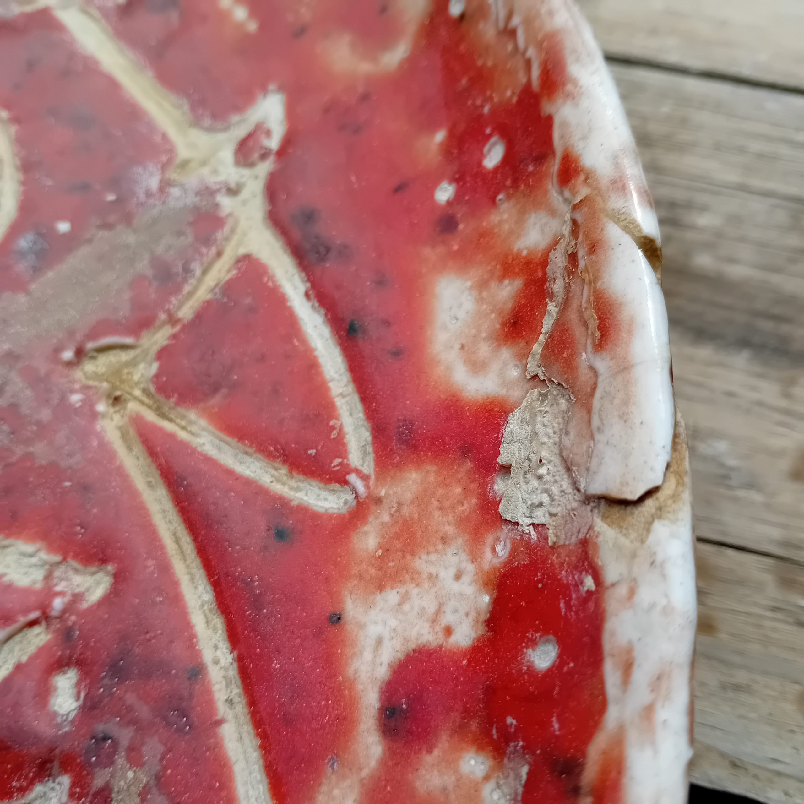 La glaçure rouge intense, ponctuée de variations et d’effets de cuisson, accentue la force dramatique de la scène. Avec son grand format (41 cm), cette pièce s’impose comme une véritable œuvre murale, bien plus qu’un simple objet décoratif.