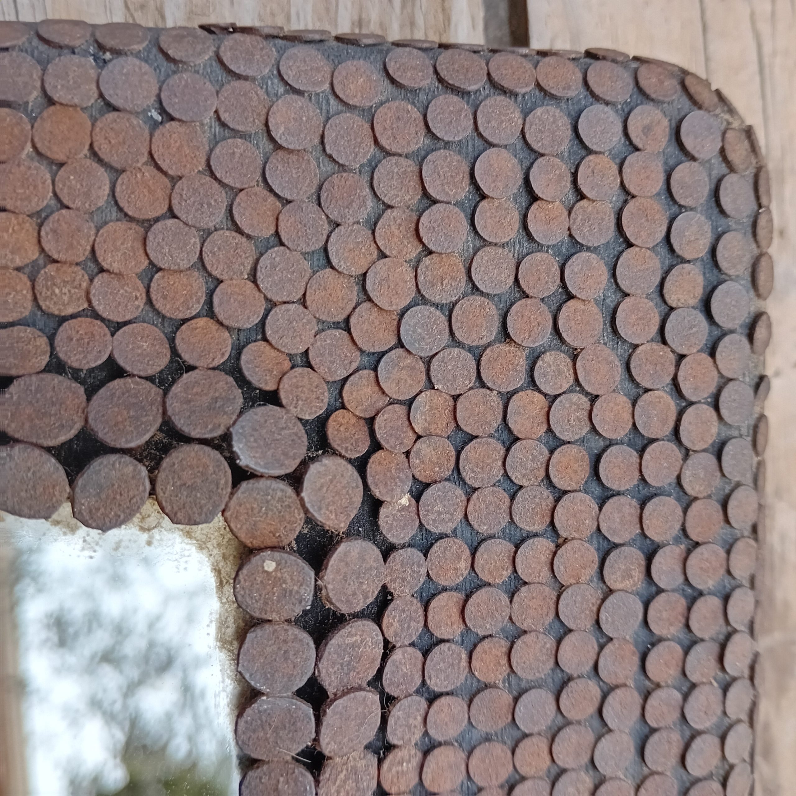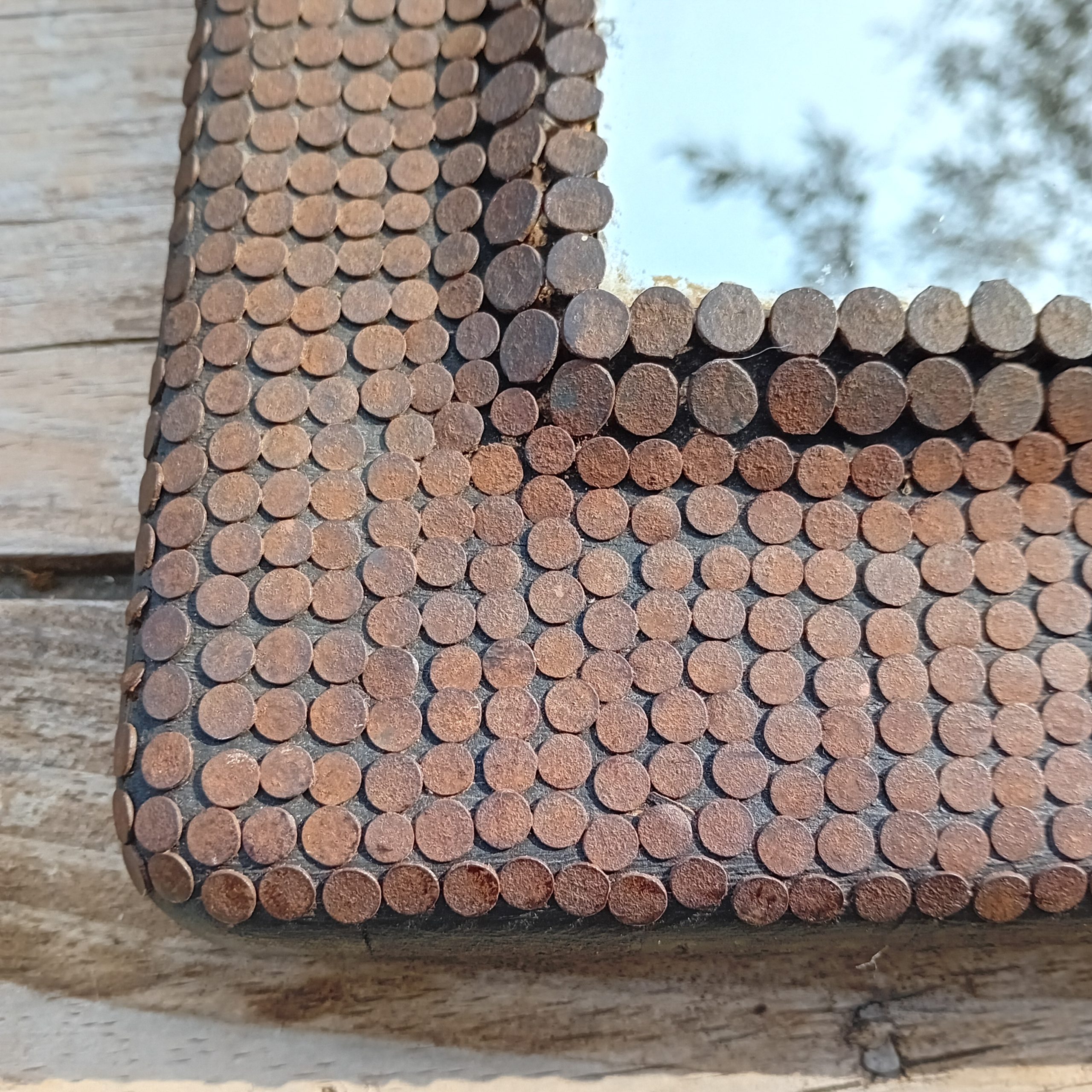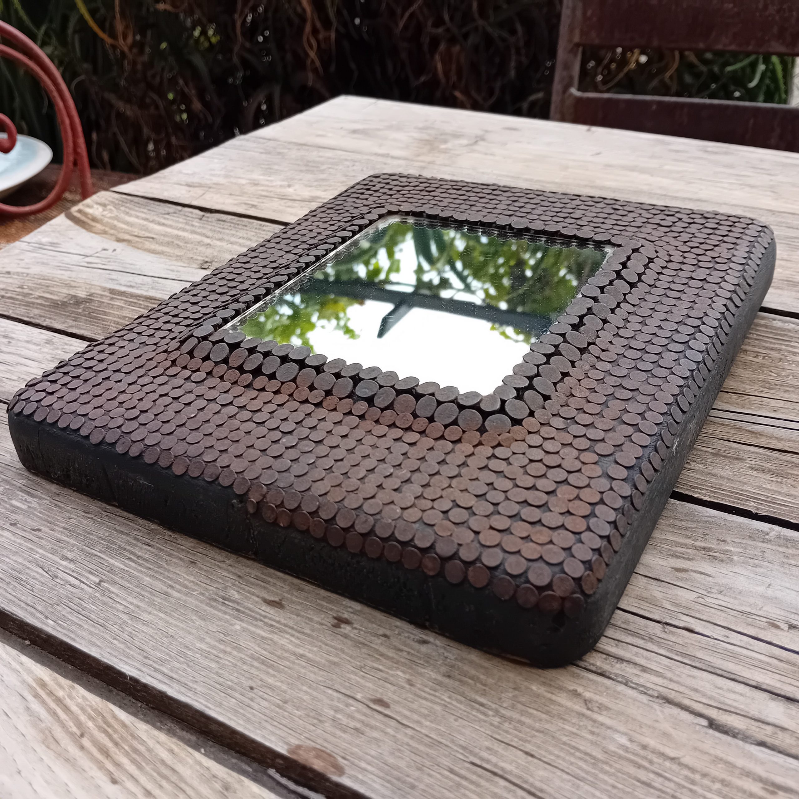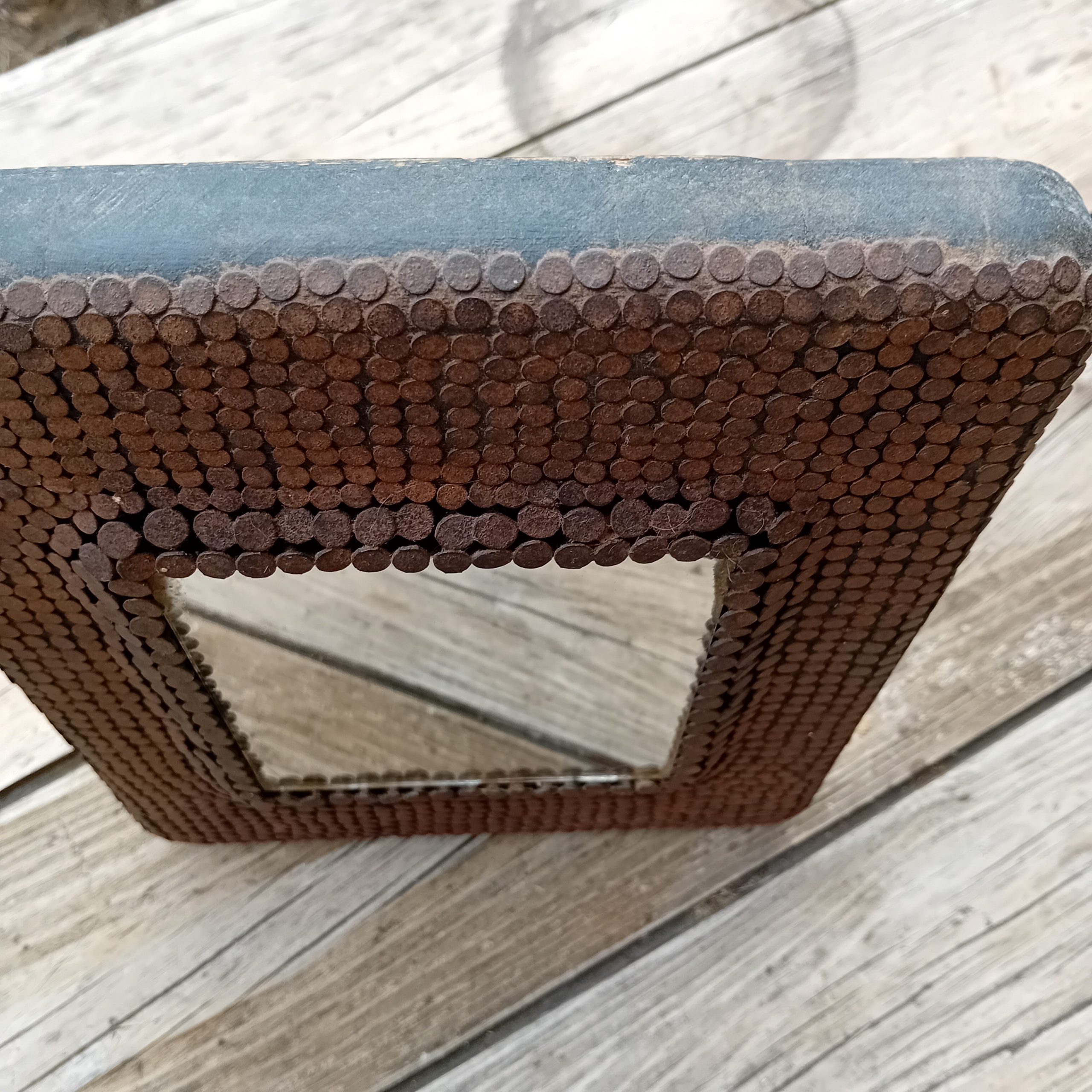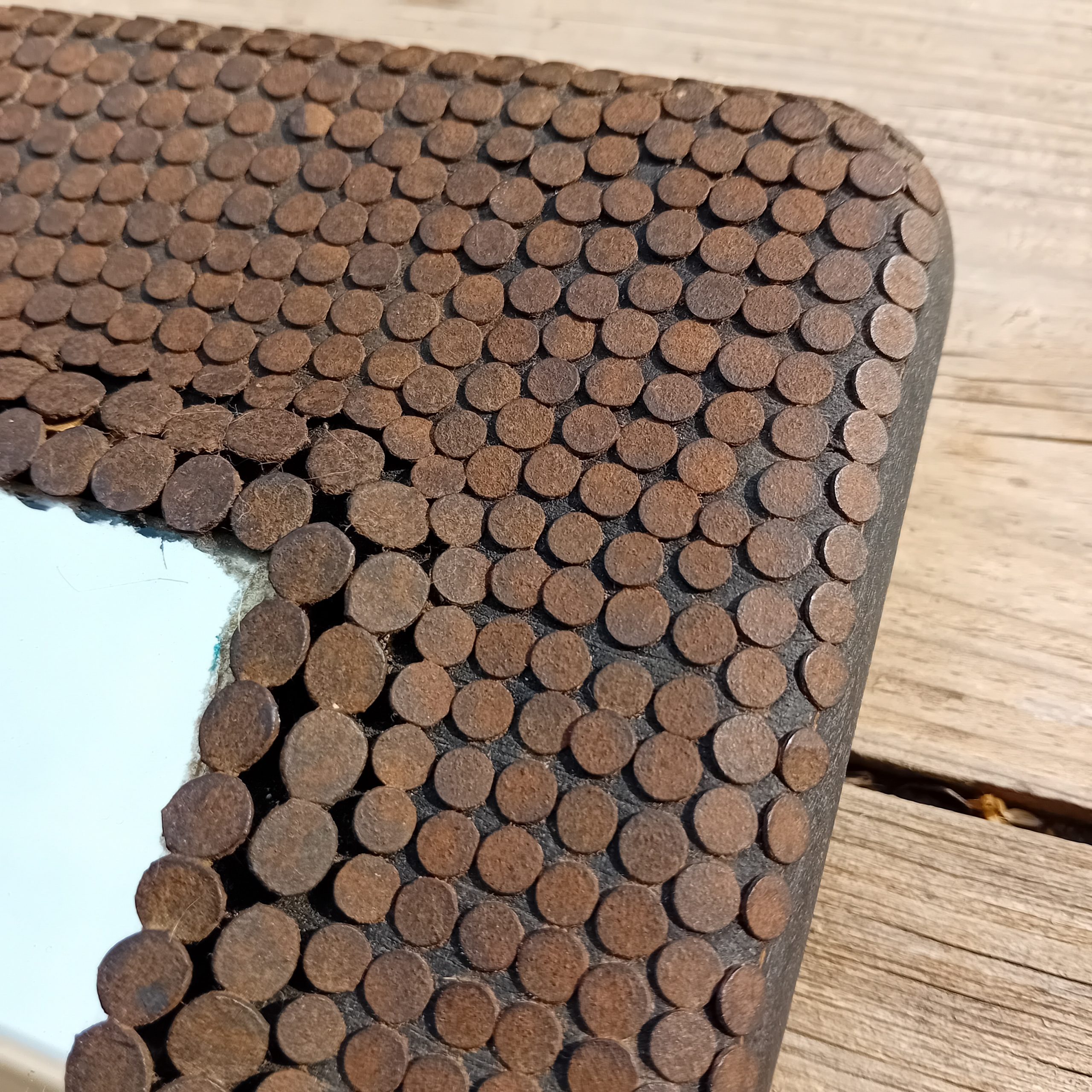 Rare miroir artisanal de forme rectangulaire, réalisé en bois recouvert de centaines de petits clous métalliques martelés un à un. Les clous ont dés dimensions différentes.
