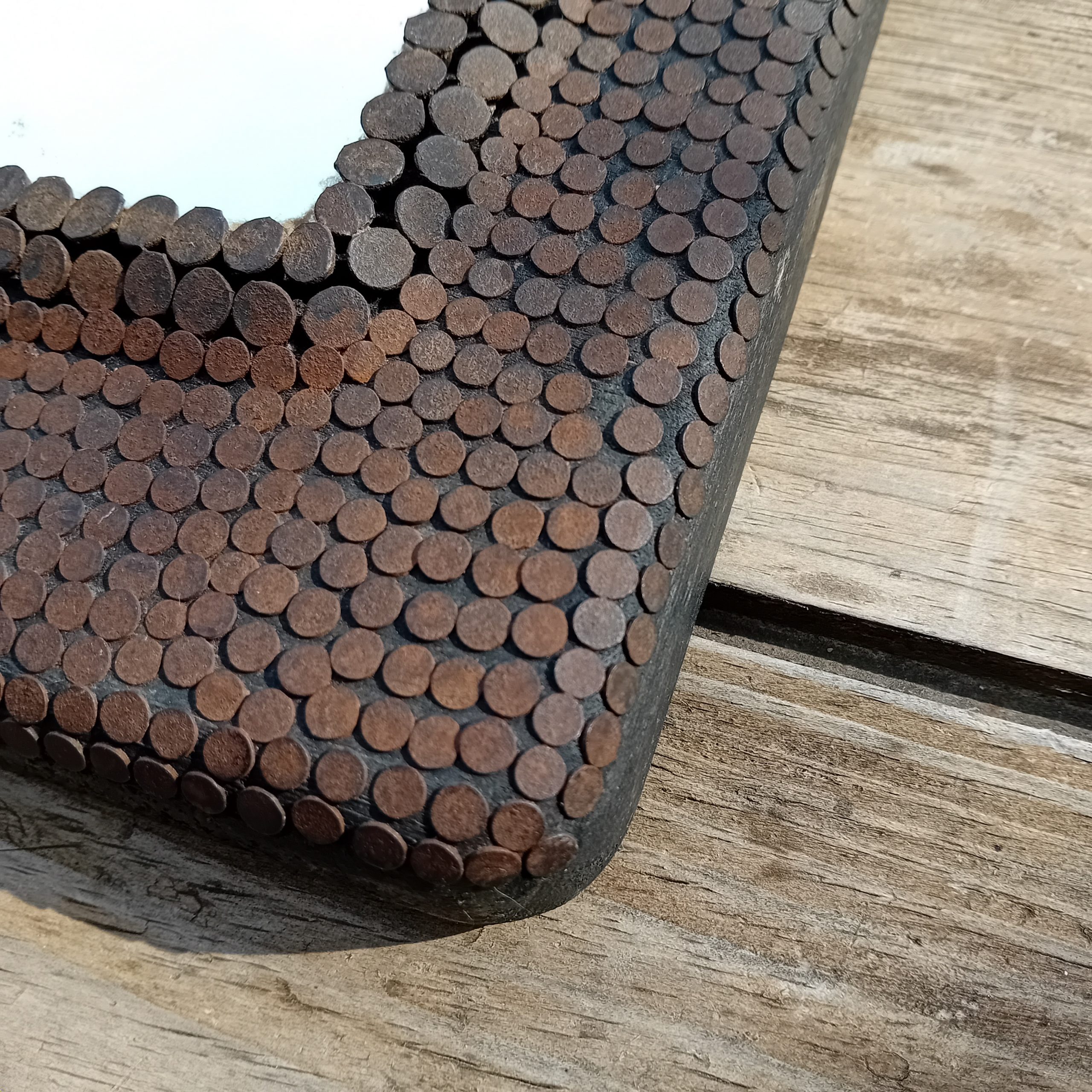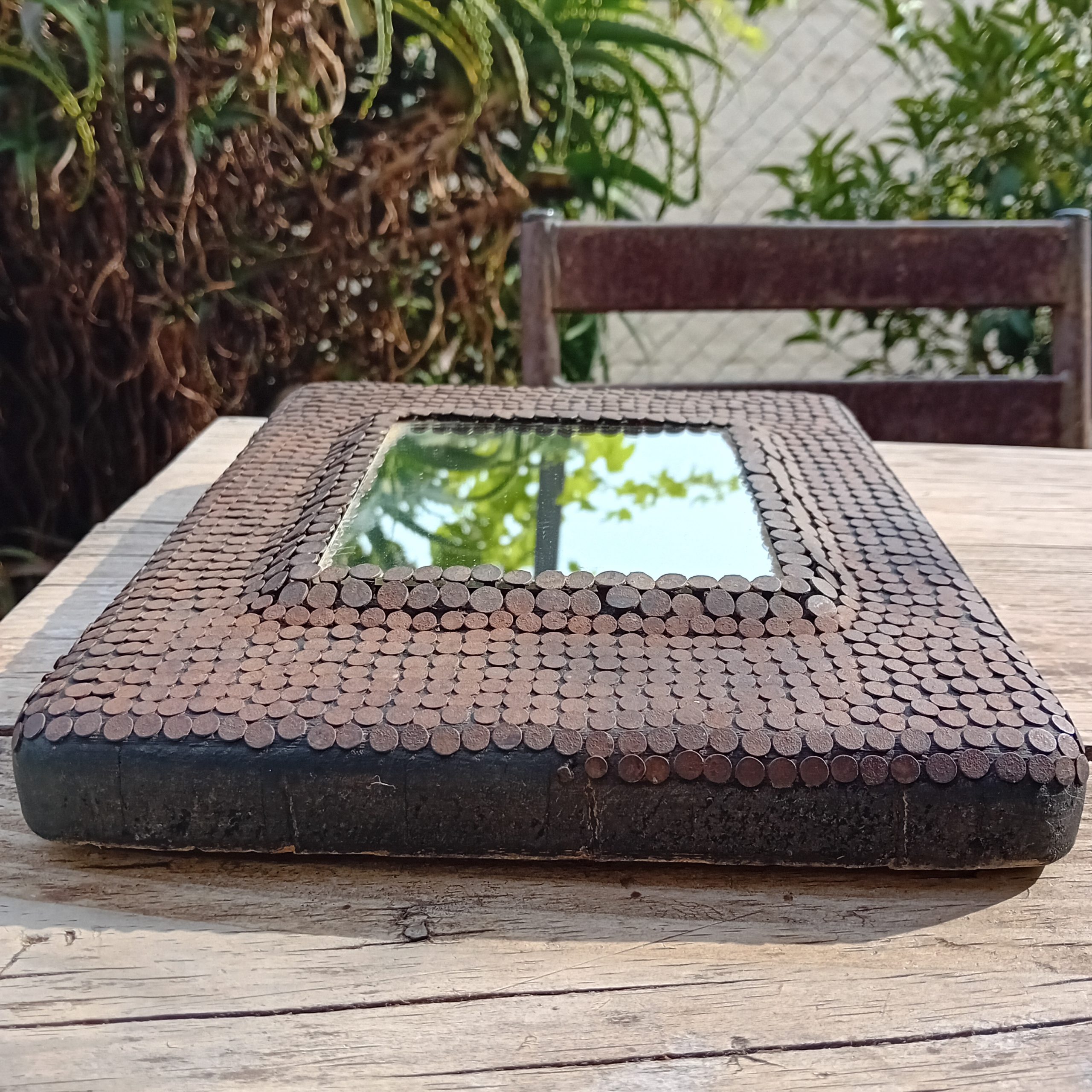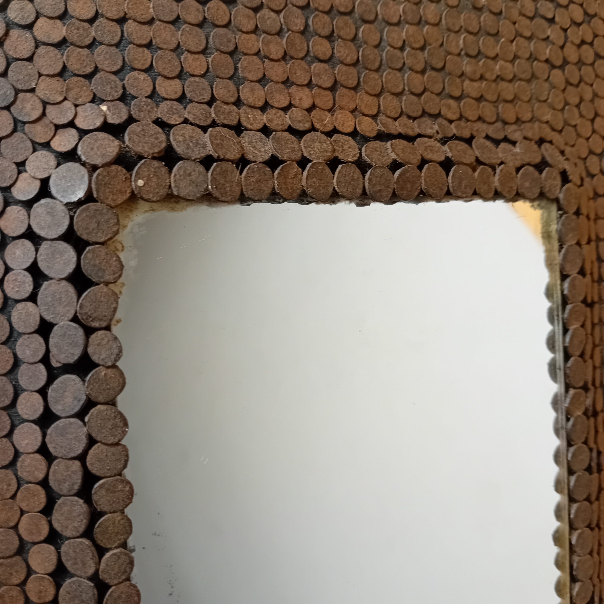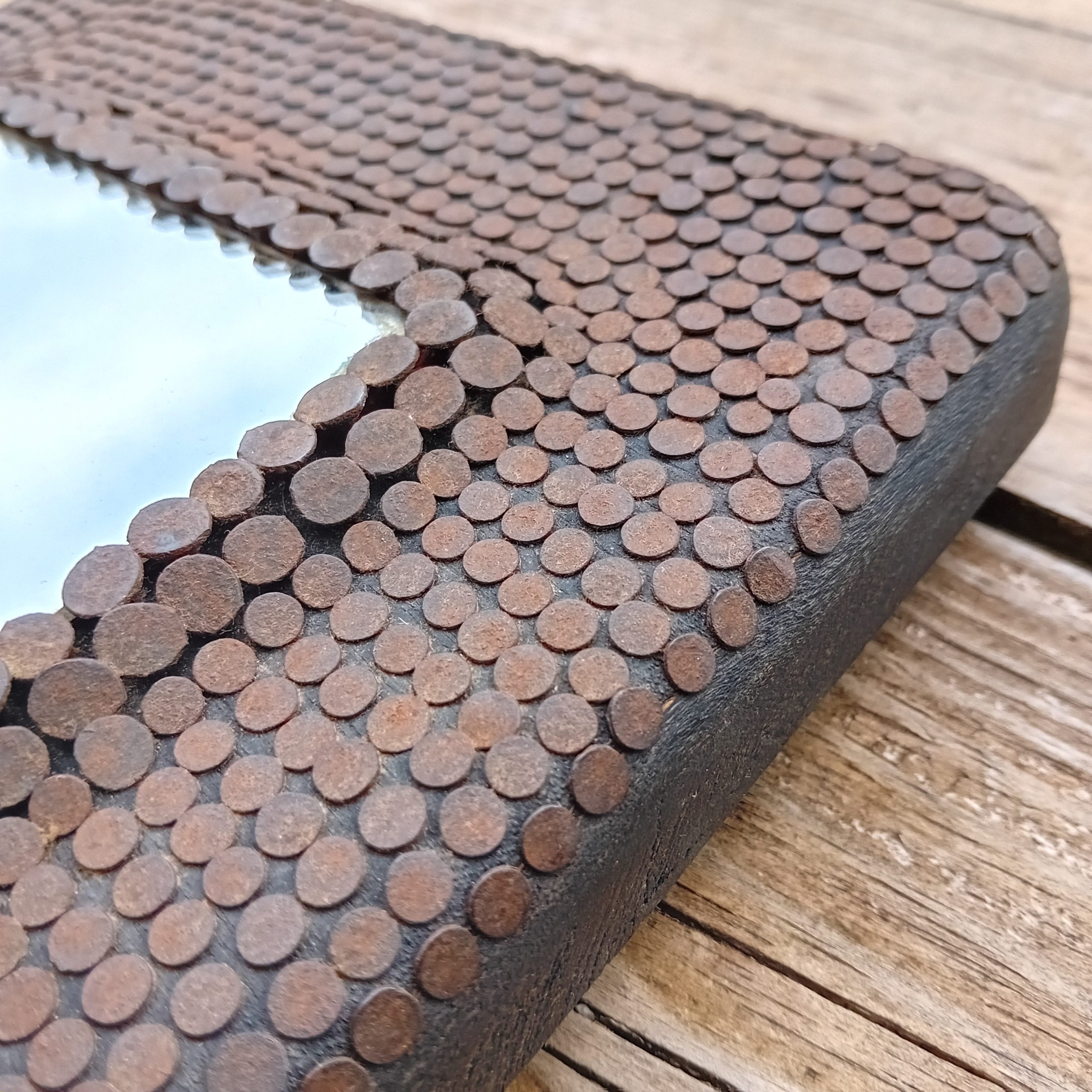 Rare miroir artisanal de forme rectangulaire, réalisé en bois recouvert de centaines de petits clous métalliques martelés un à un. Les clous ont dés dimensions différentes.