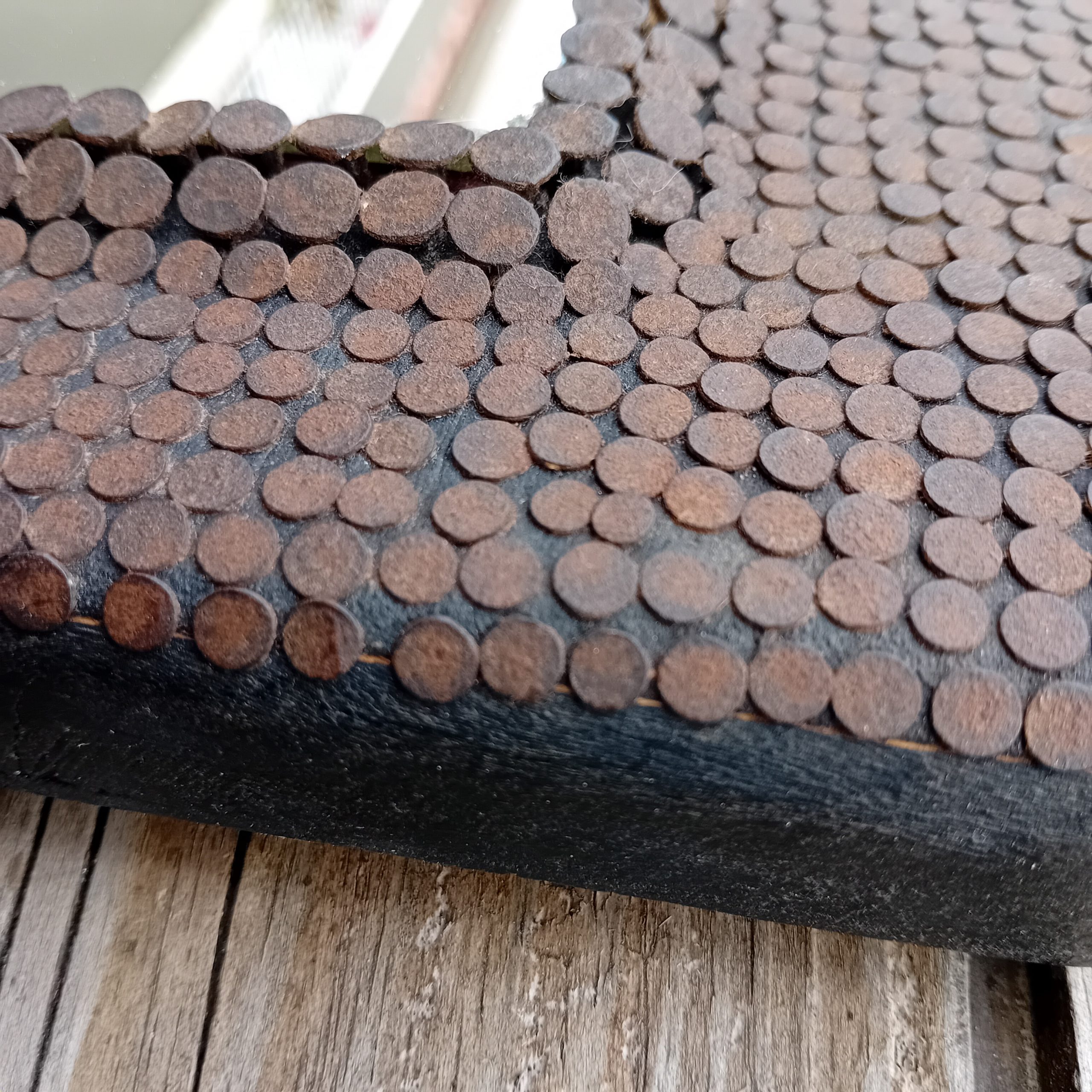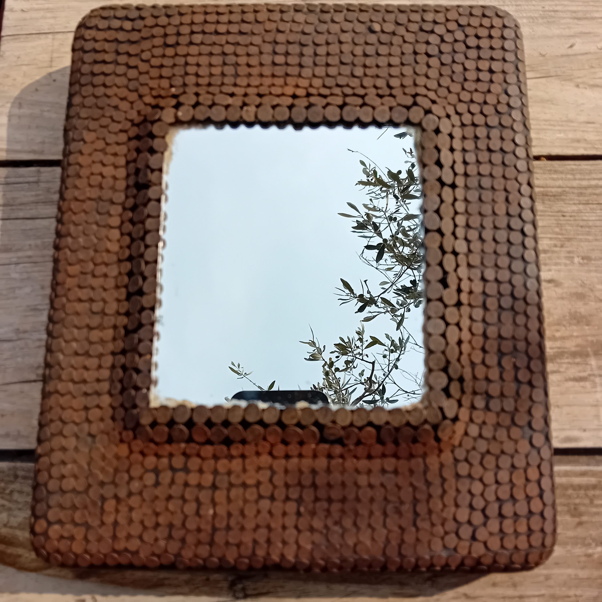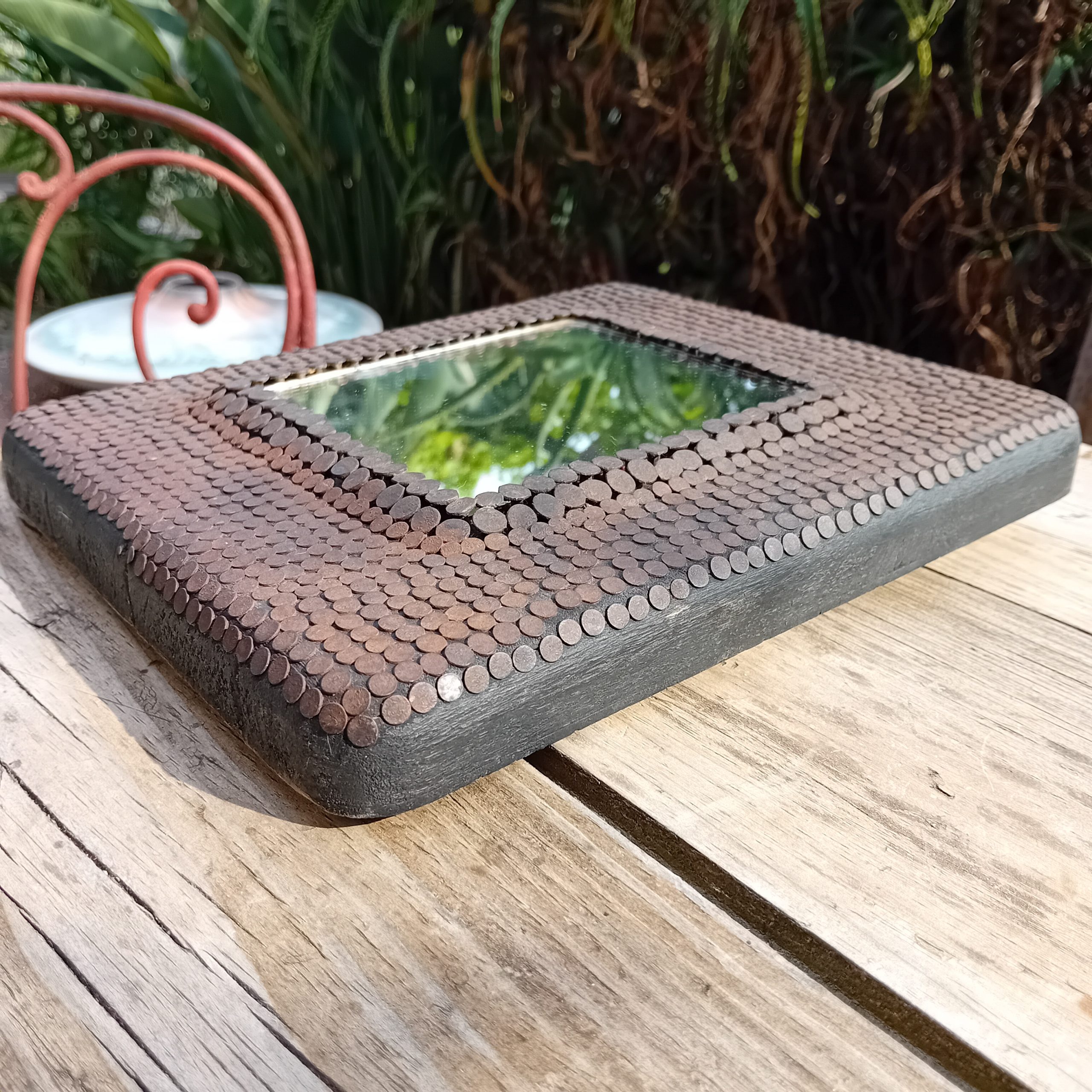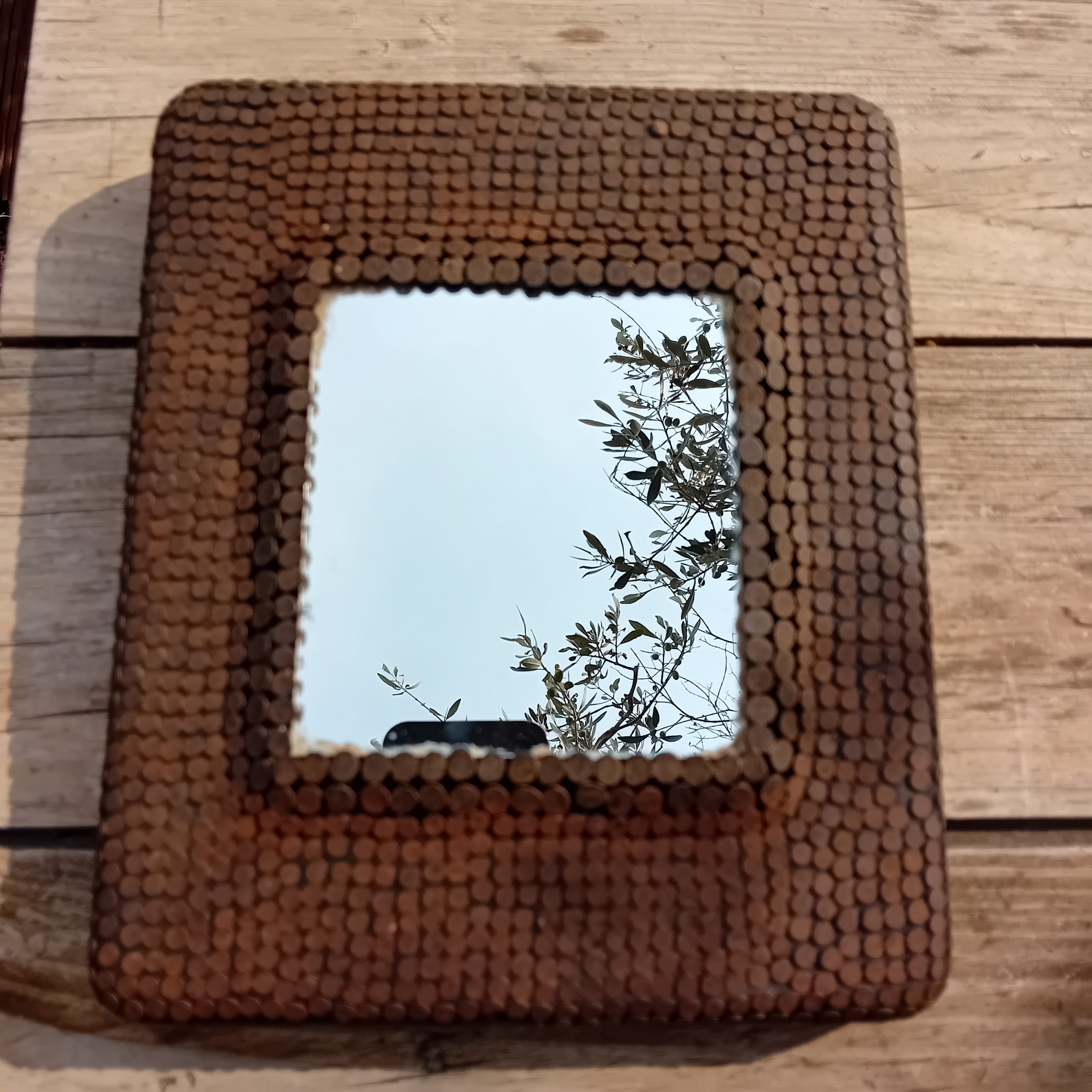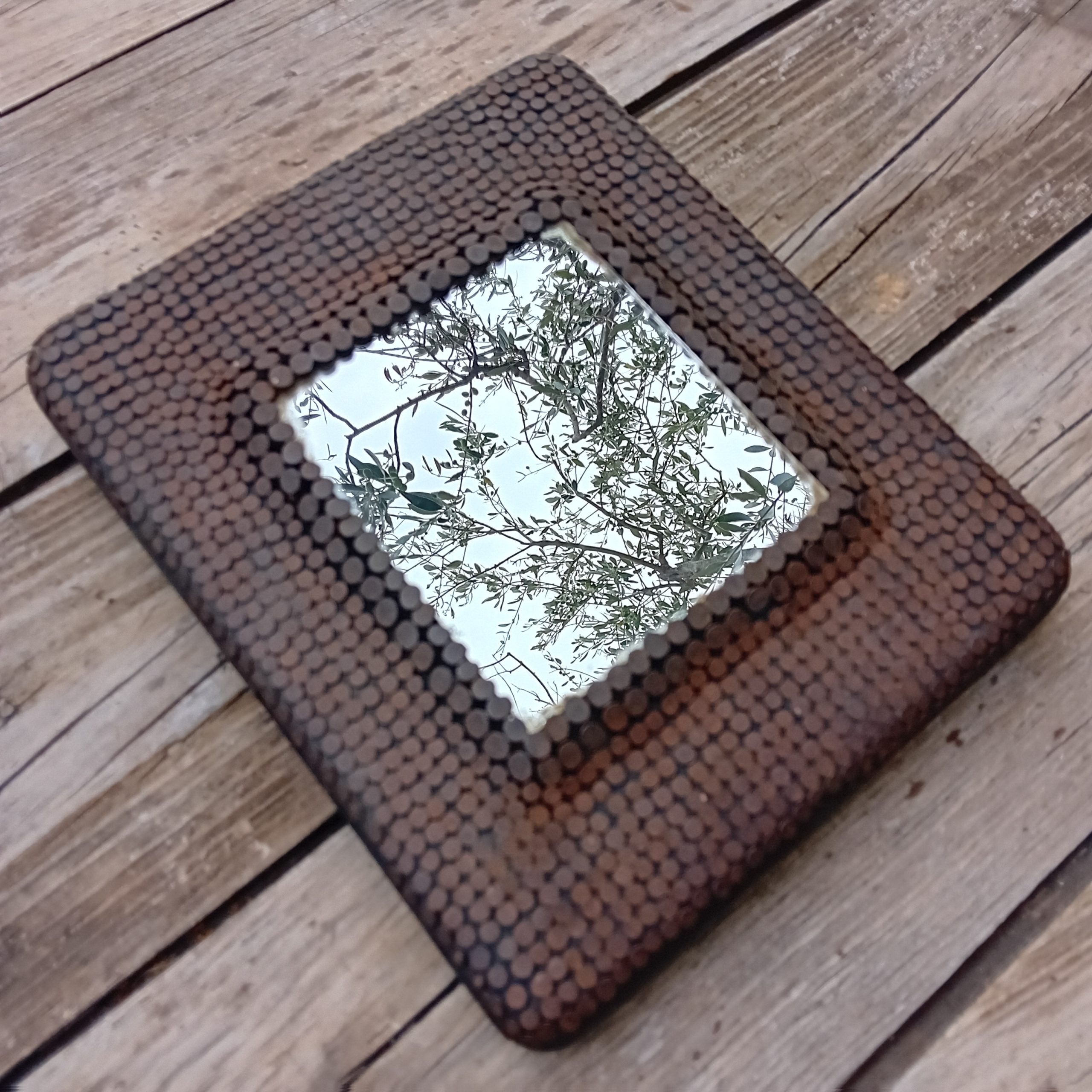 Rare miroir artisanal de forme rectangulaire, réalisé en bois recouvert de centaines de petits clous métalliques martelés un à un. Les clous ont dés dimensions différentes.