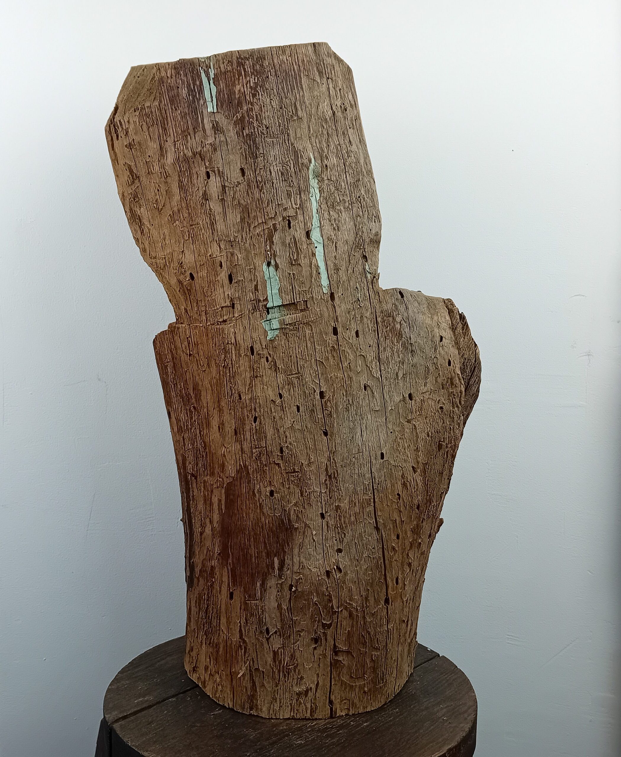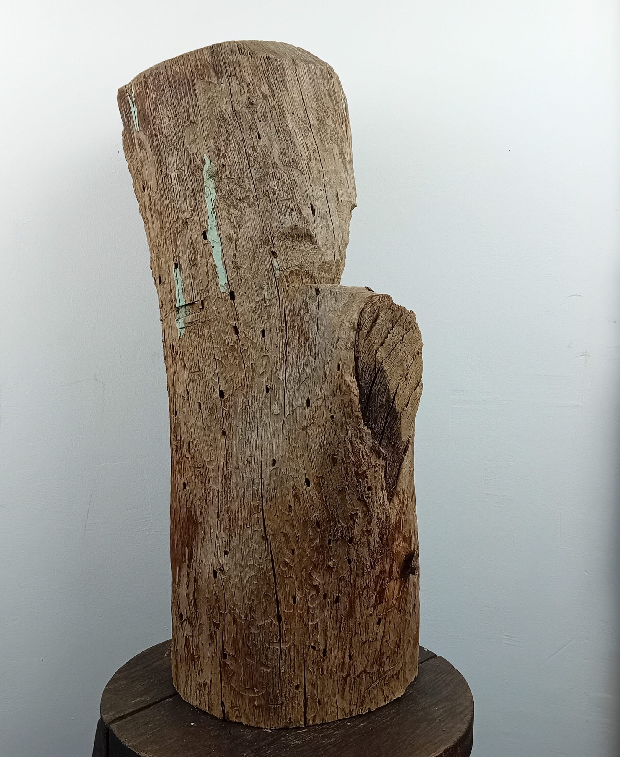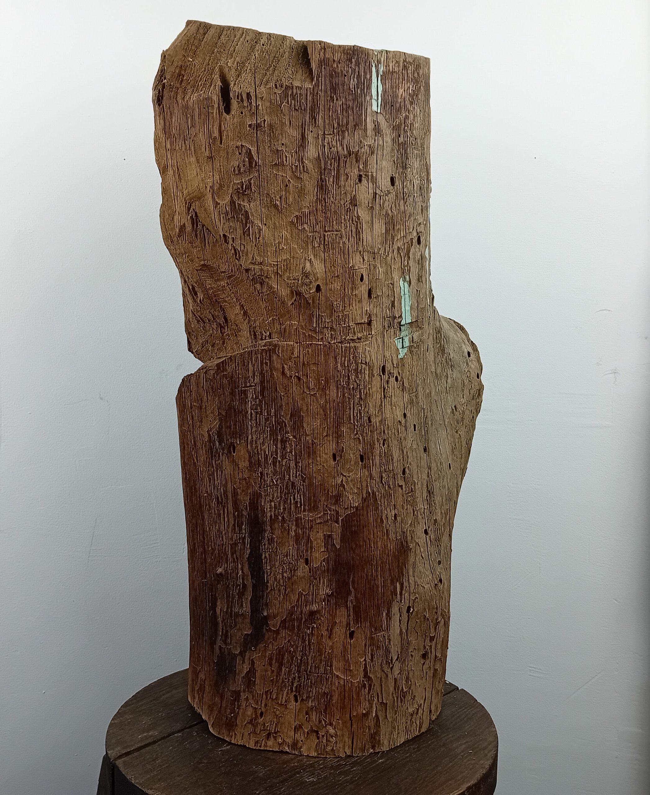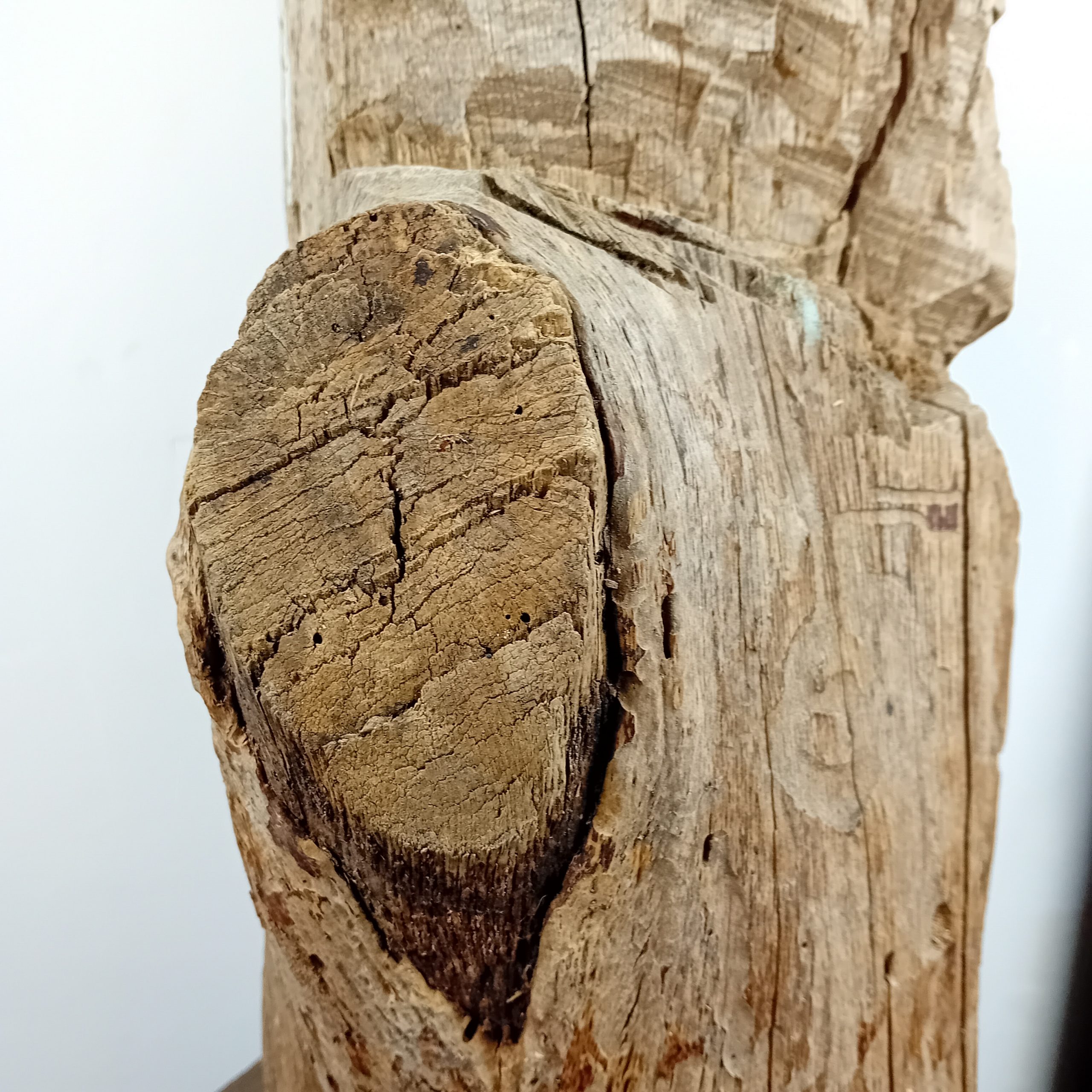 En bois brut lourd, juste traitée et laissée comme trouvée avec ses imperfections.