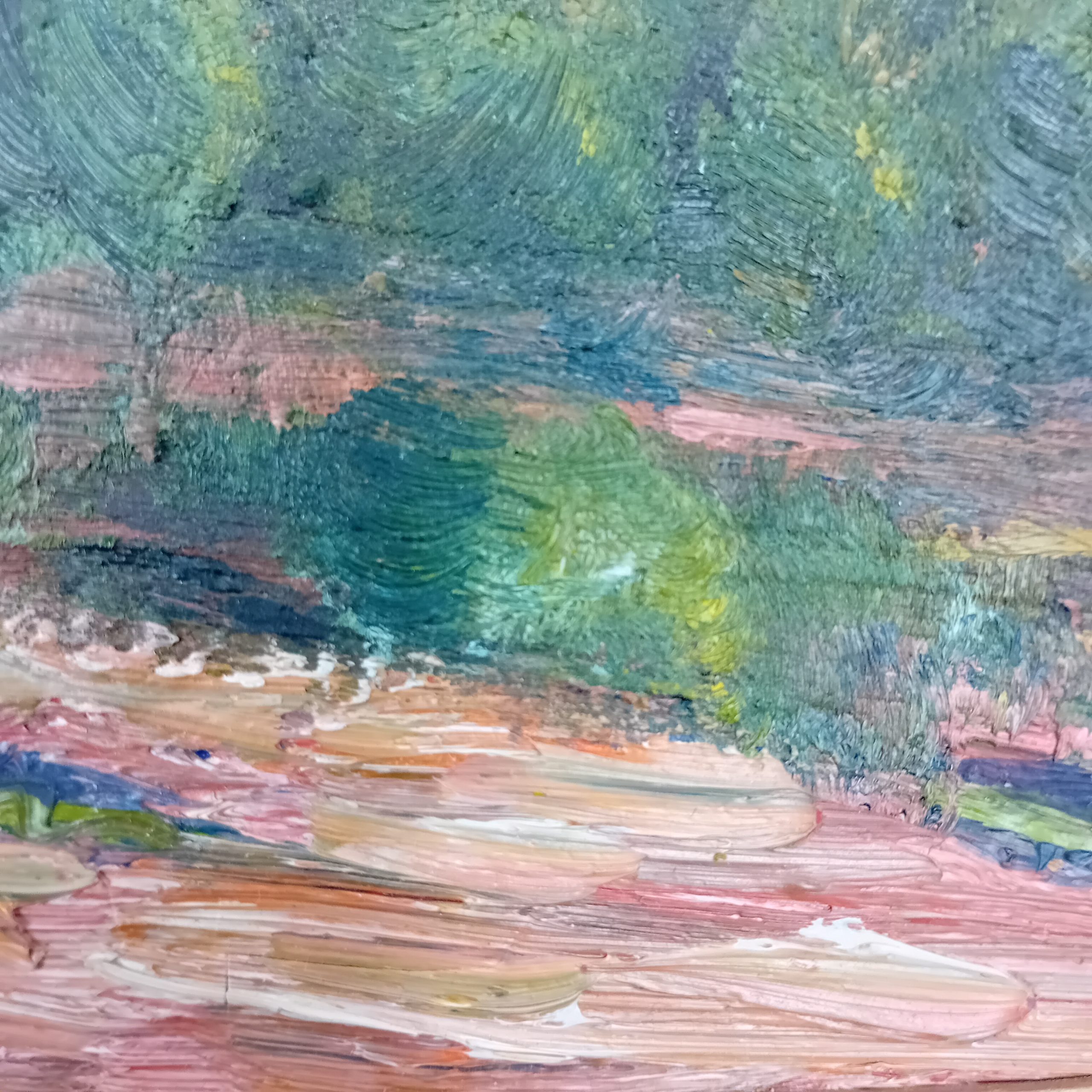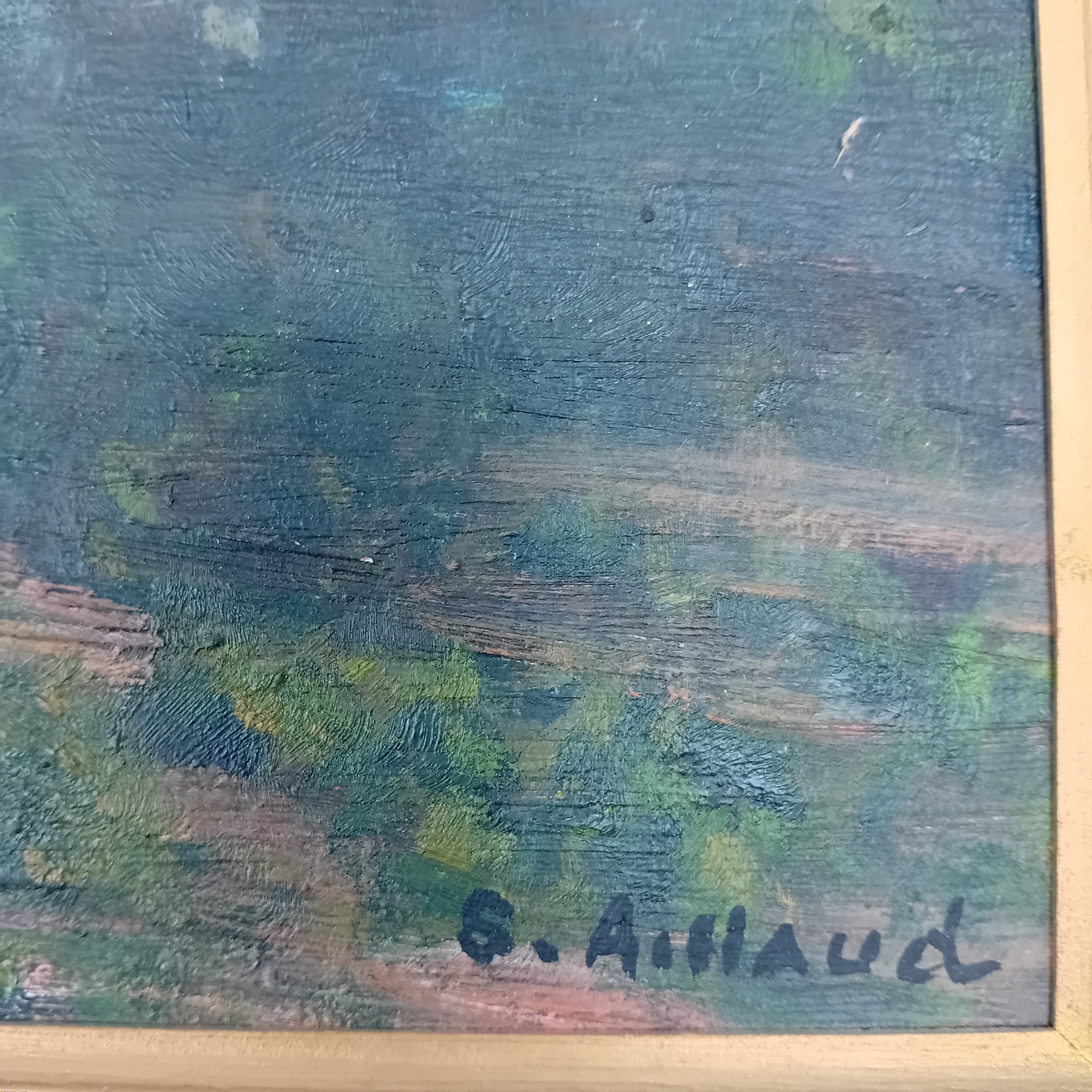 Simone Aillaud peint cette œuvre à l’huile sur panneau de bois, un support exigeant qu’elle maîtrise parfaitement. Le tableau est signé “S. Aillaud” en bas à droite, signature visible sur la face. Ce choix de support apporte une belle densité de matière et une grande stabilité à l’œuvre.