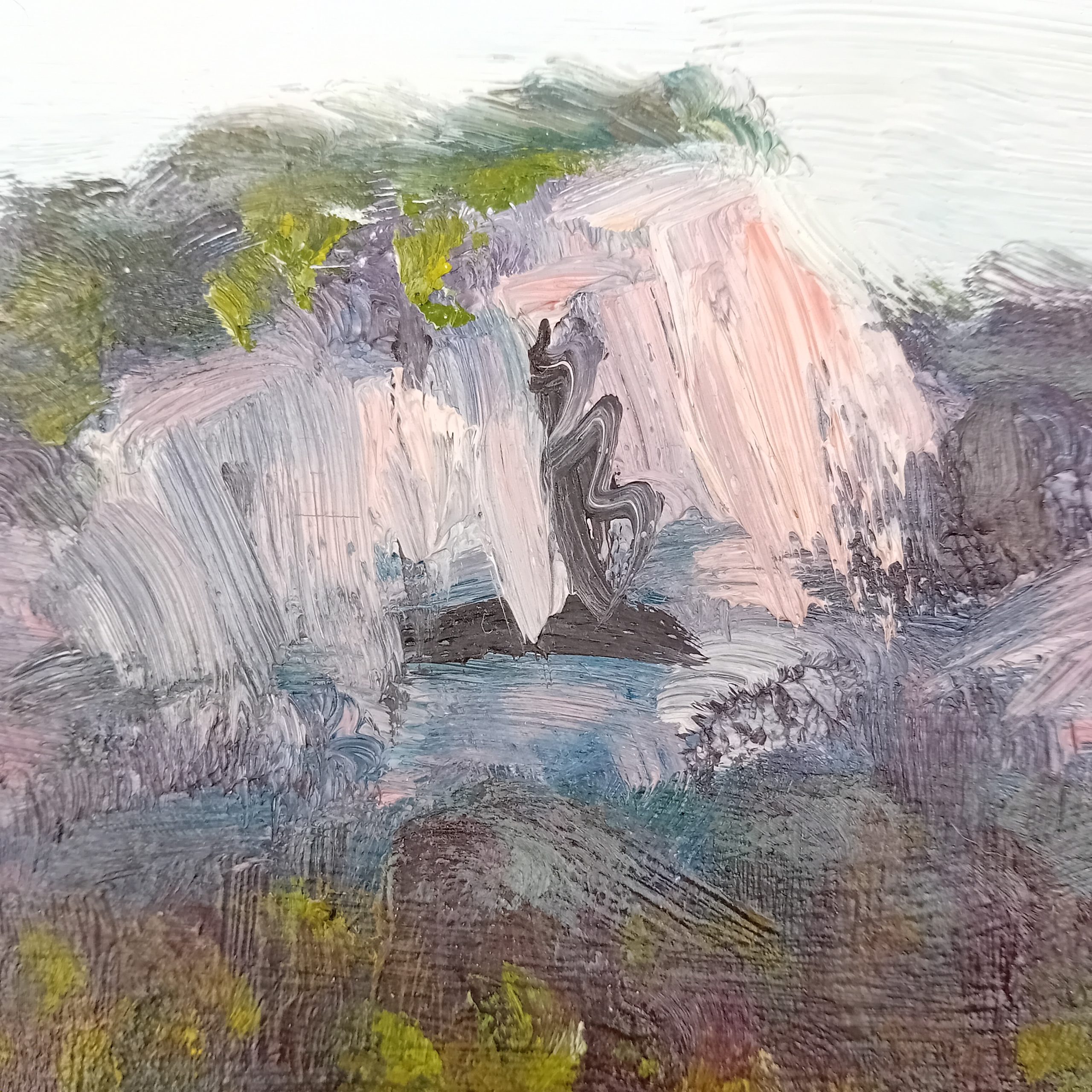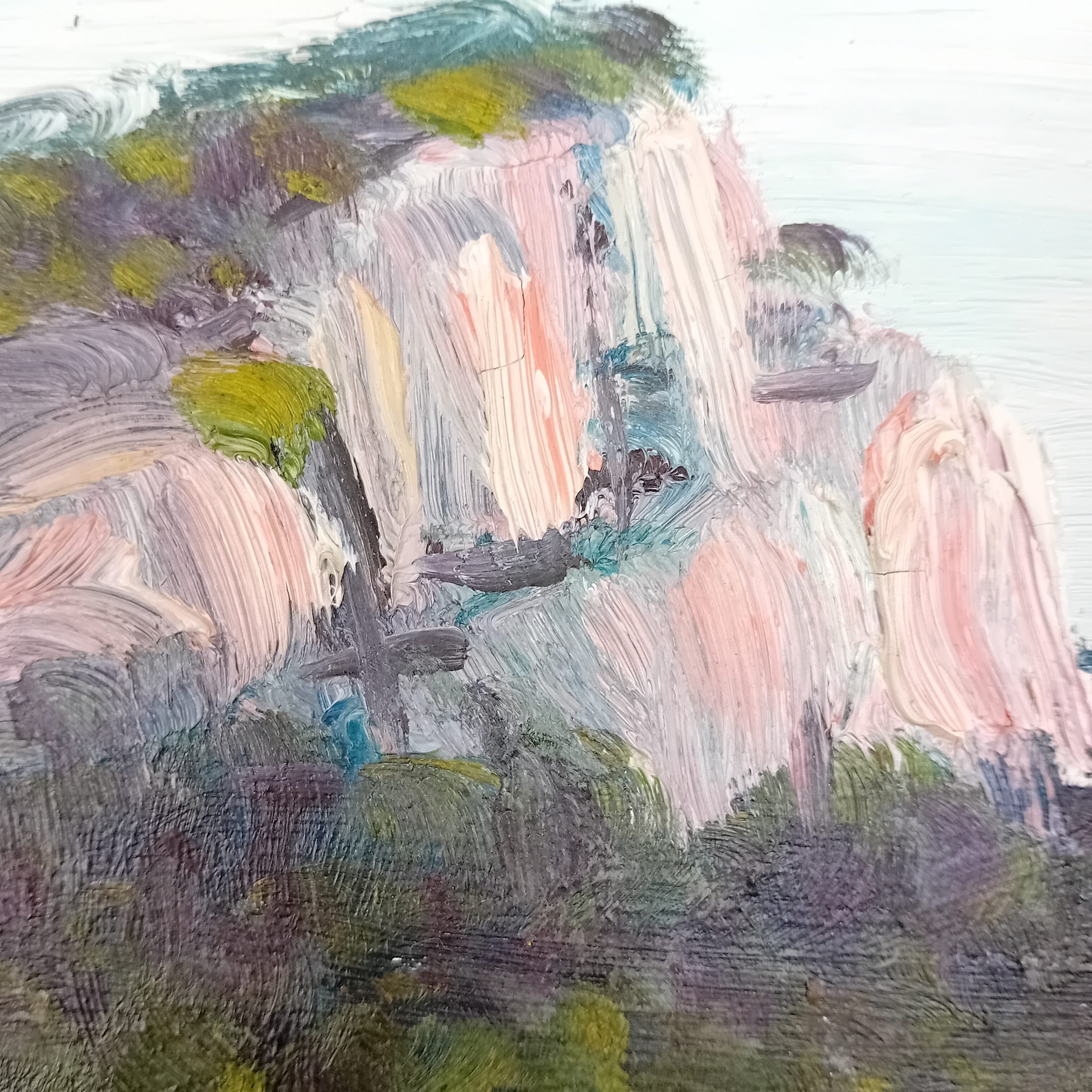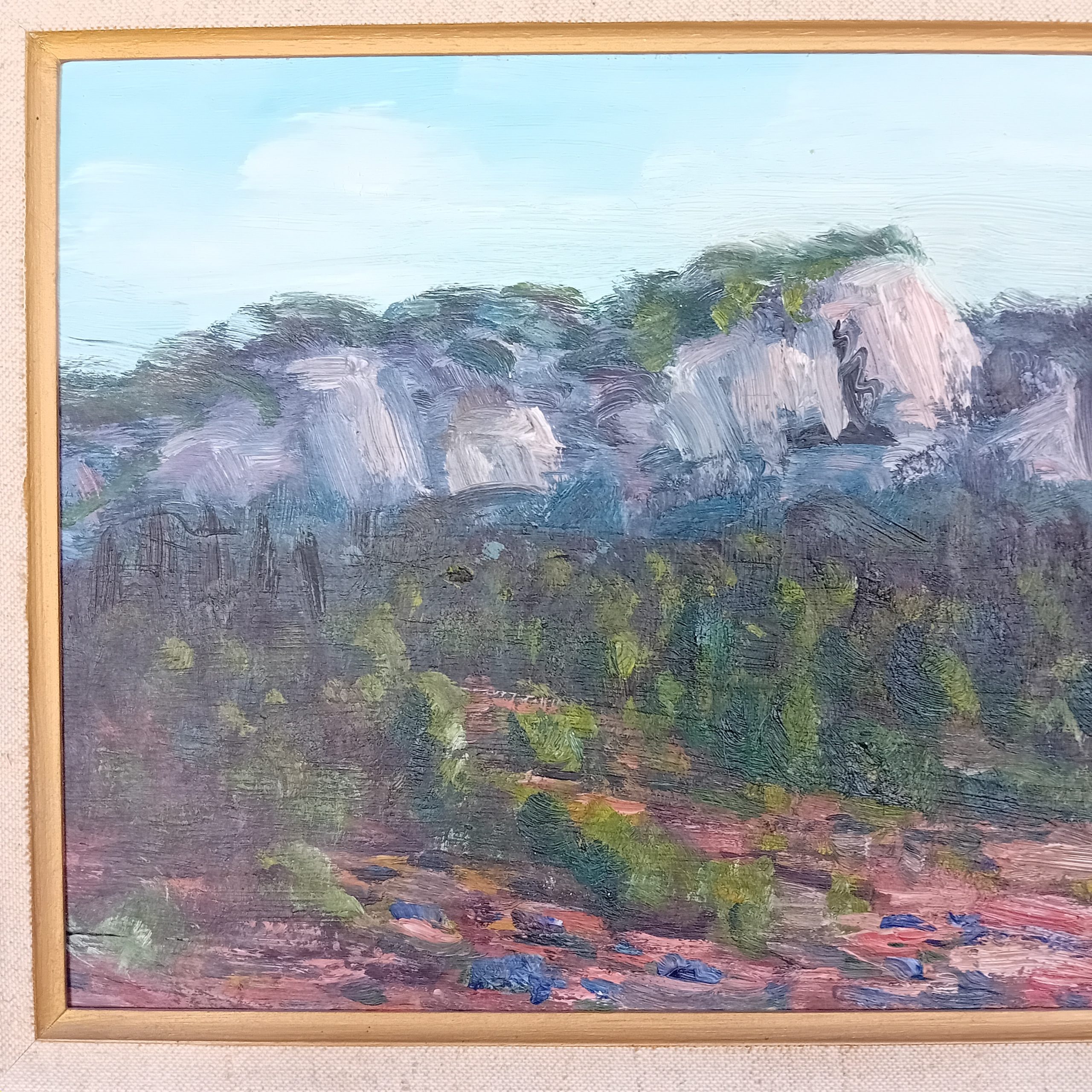 Cette œuvre est une huile sur panneau de bois signée Simone Aillaud, réalisée au début des années 1970. Le tableau représente un paysage méditerranéen structuré autour de masses rocheuses et de végétation dense, traité avec une touche libre et vibrante. L’artiste privilégie ici une palette subtile mêlant verts profonds, bleus, roses et ocres, typique de son travail mature.