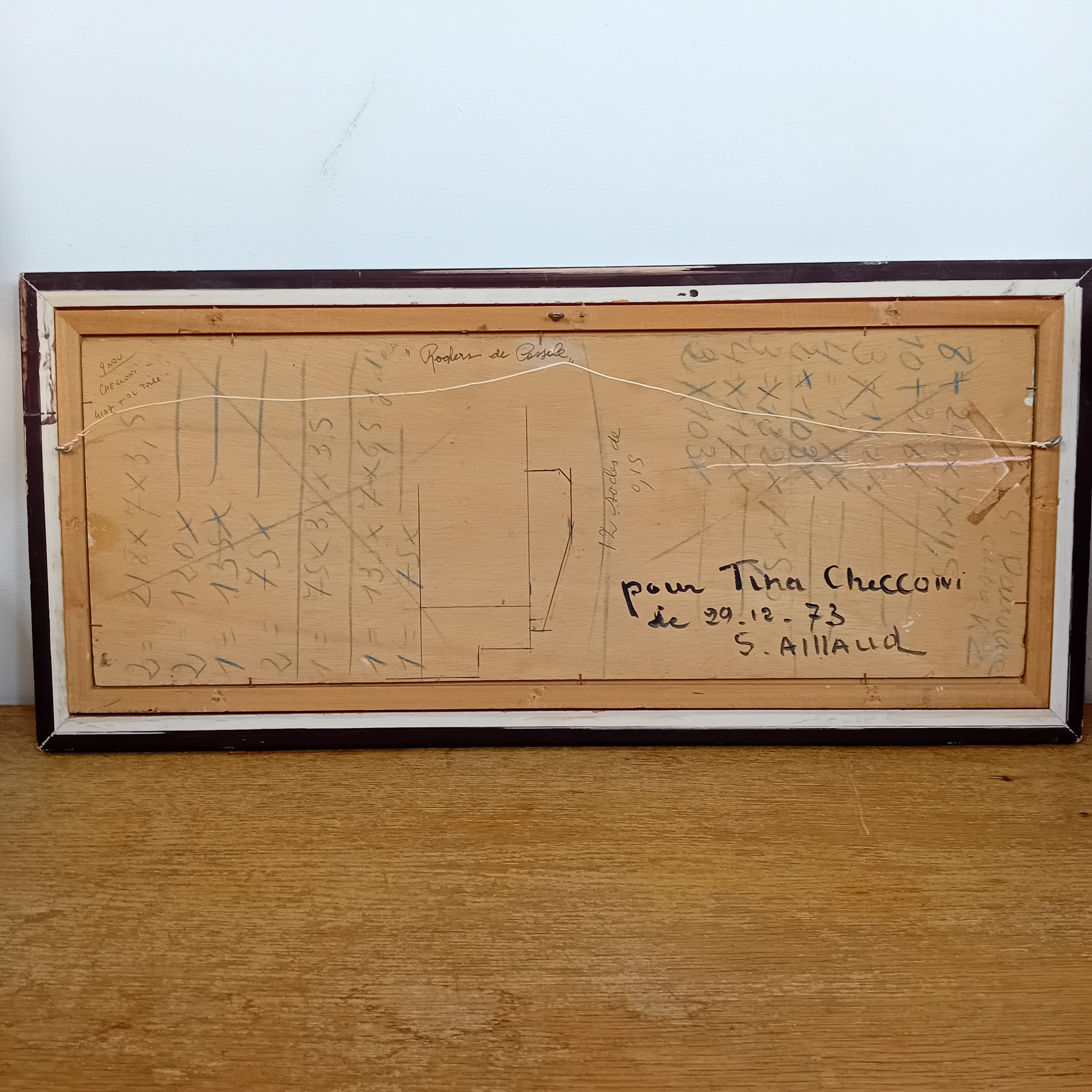 Au dos du panneau figure la mention manuscrite “Rocher de Cessole ?”, ainsi qu’une dédicace datée de 1972. Ces éléments permettent de situer précisément l’œuvre au début des années 1970, période particulièrement appréciée dans la production de Simone Aillaud.