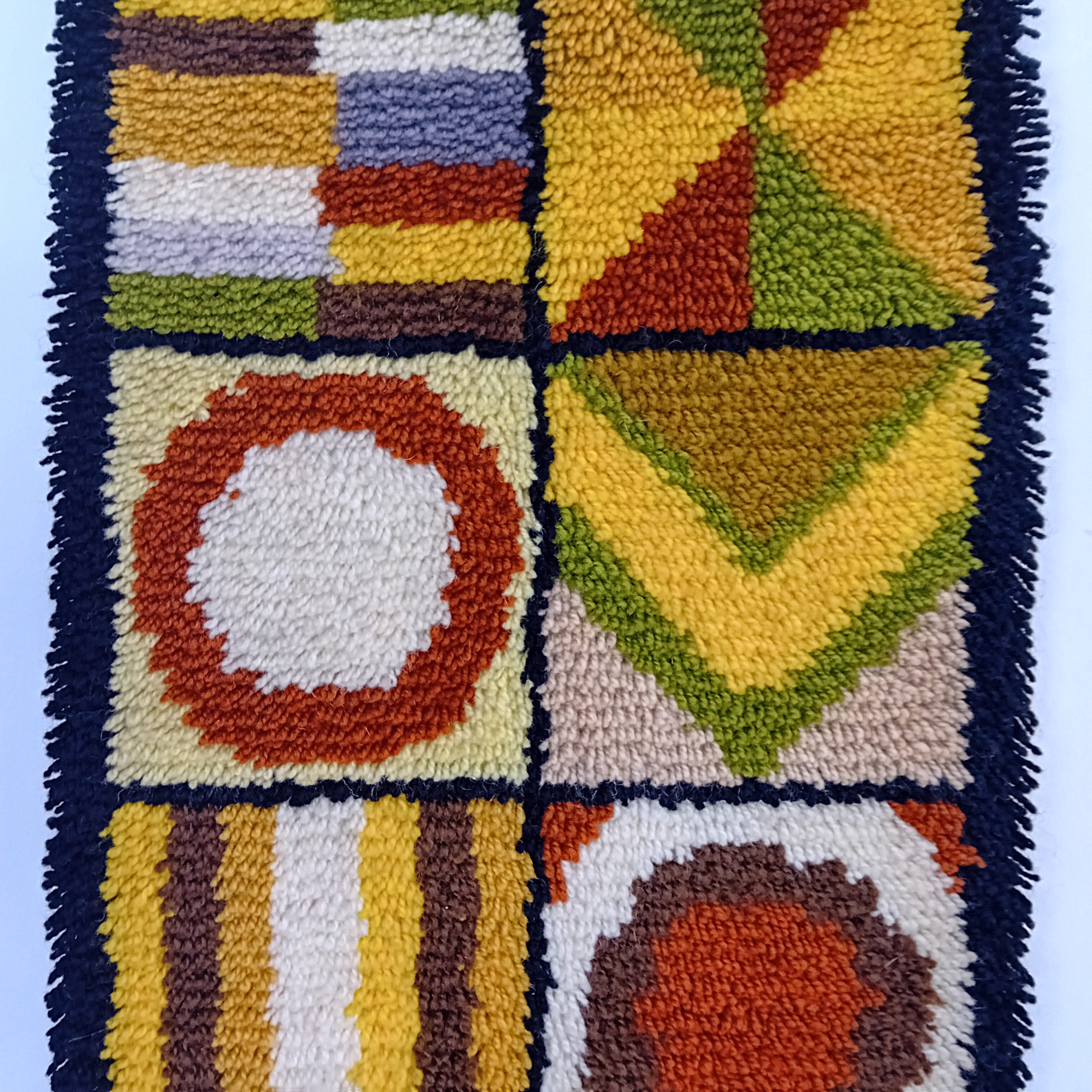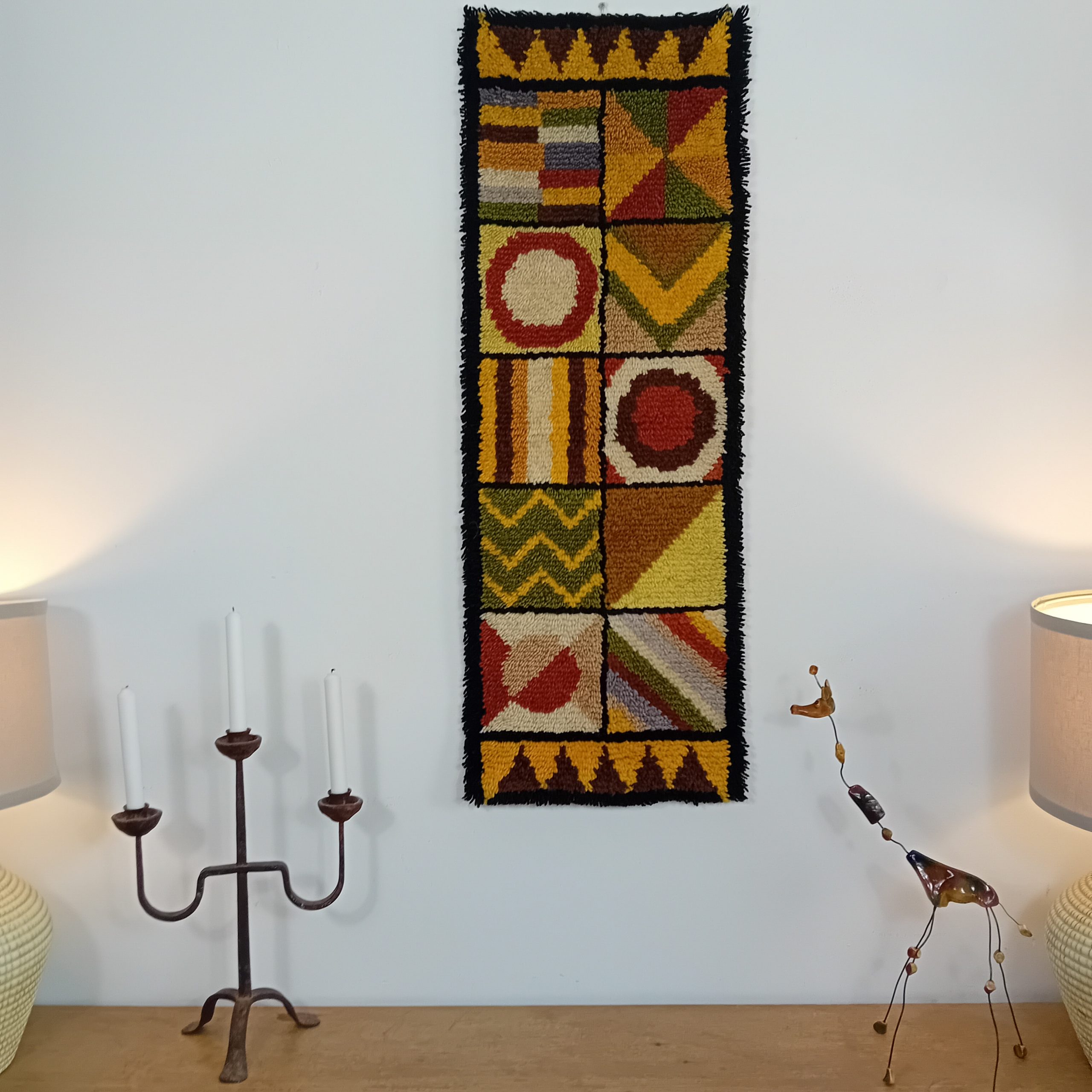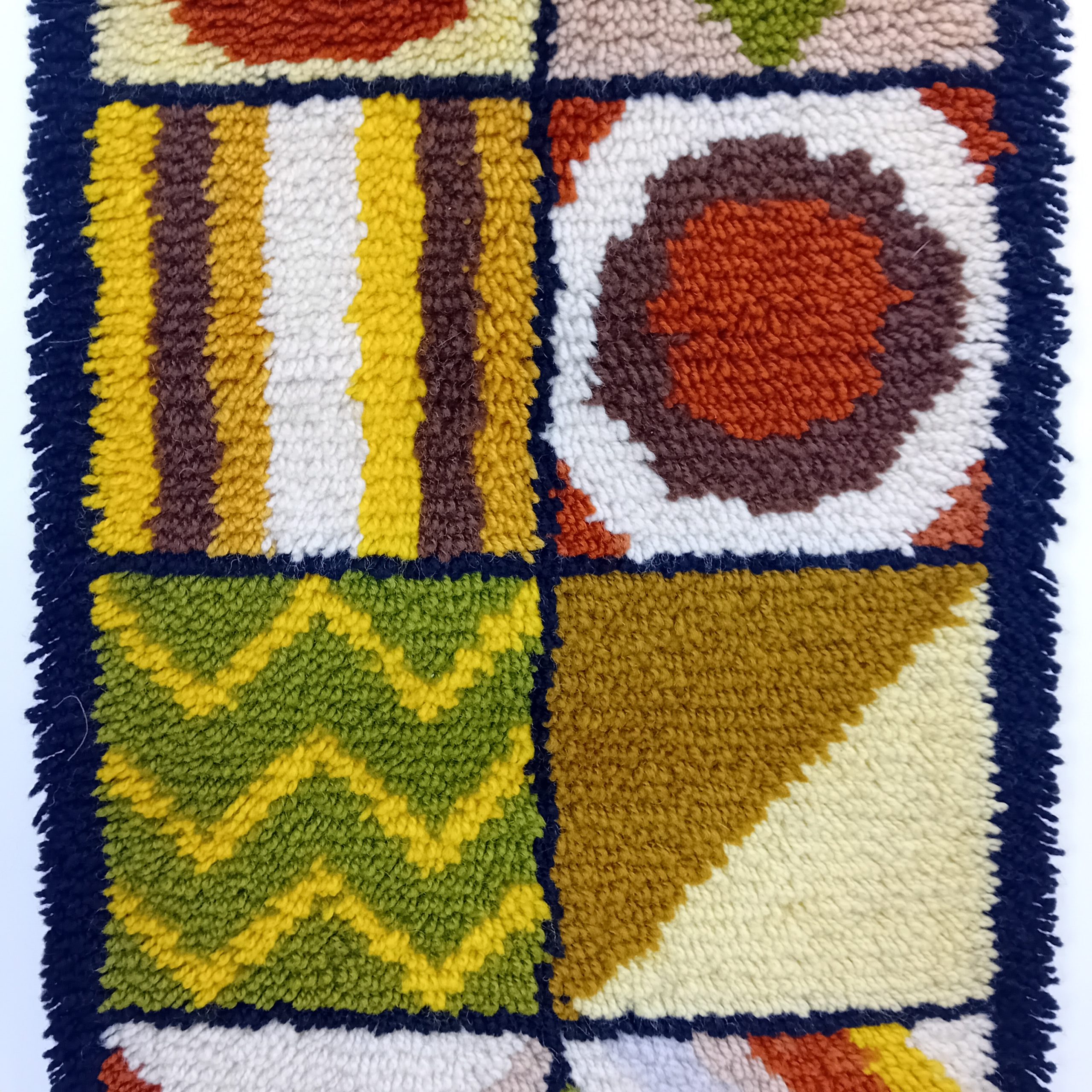 Une belle tapisserie Vintage aux couleurs marrons, jaunes, vertes et beiges.