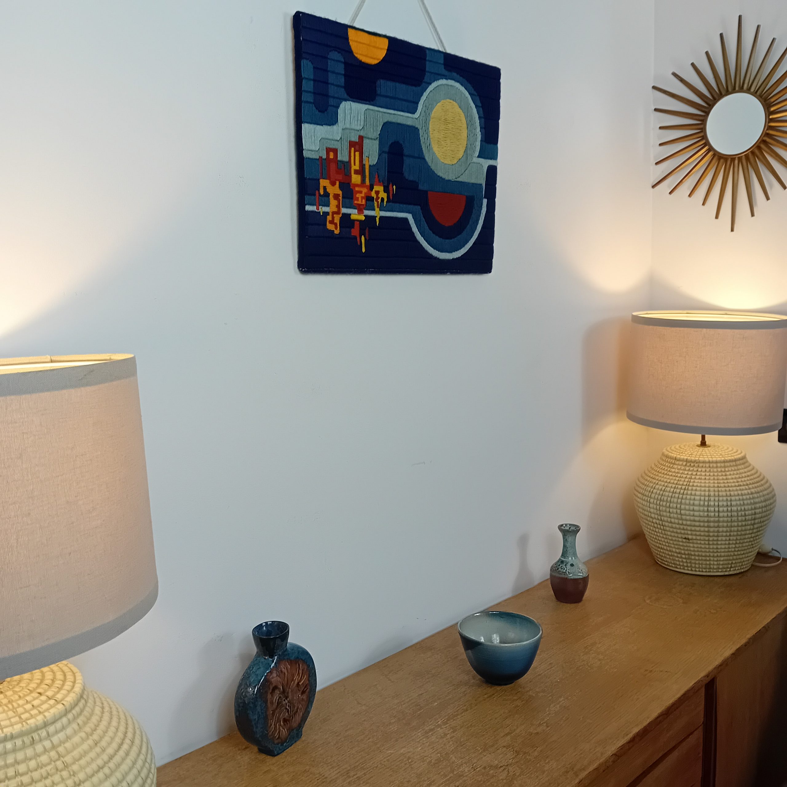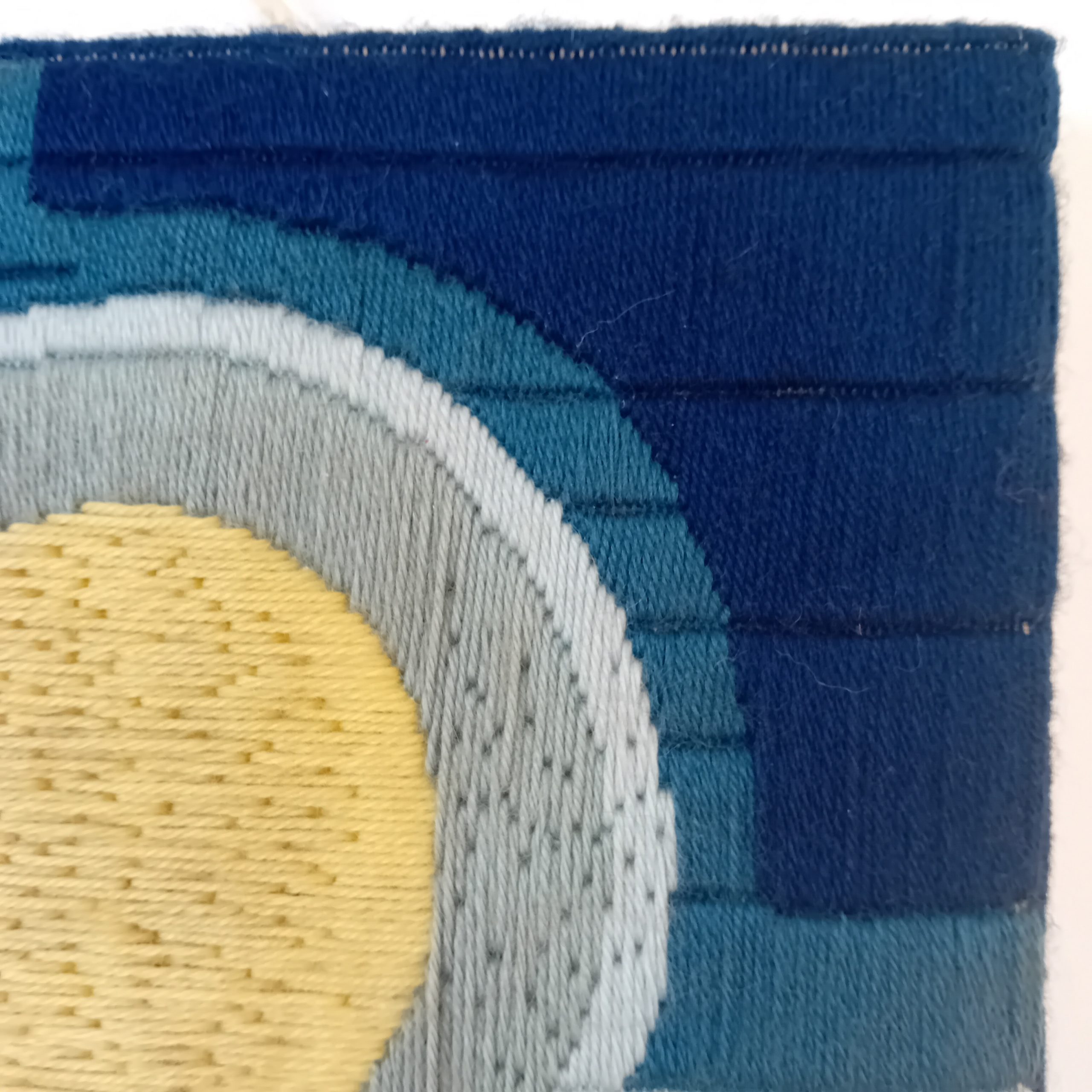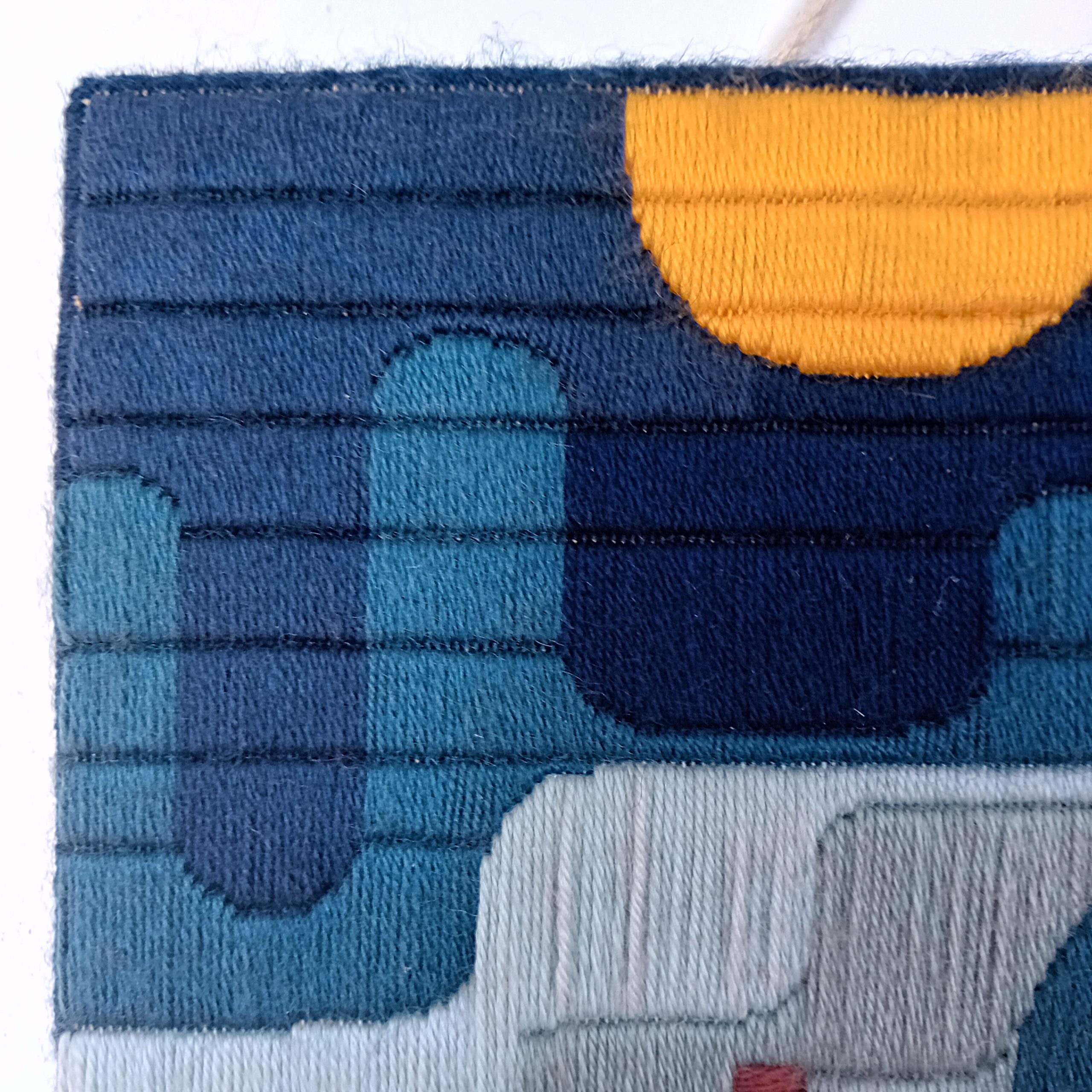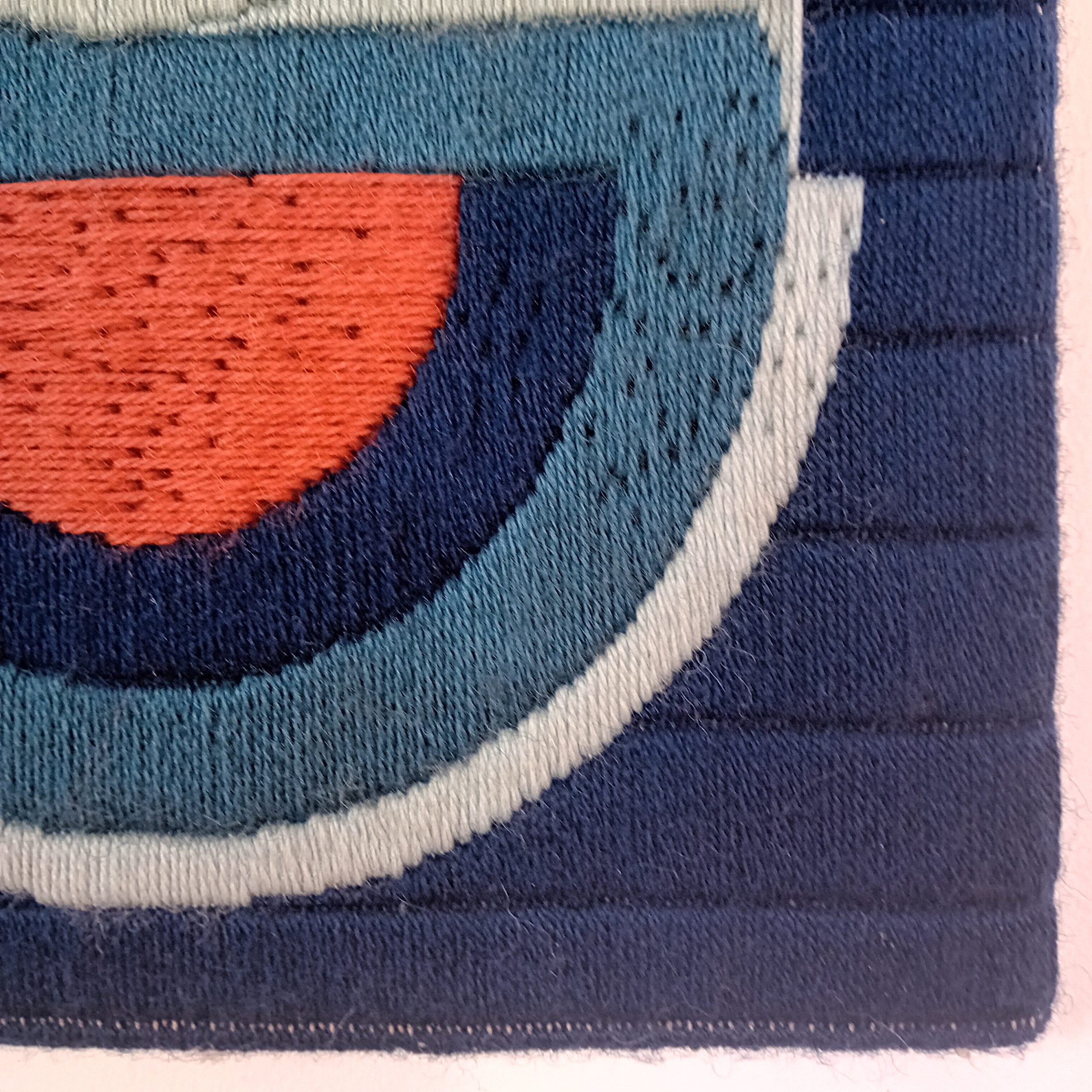 Une belle tapisserie au point lancé Vintage aux couleurs bleues, oranges, jaunes, ocres et beiges.