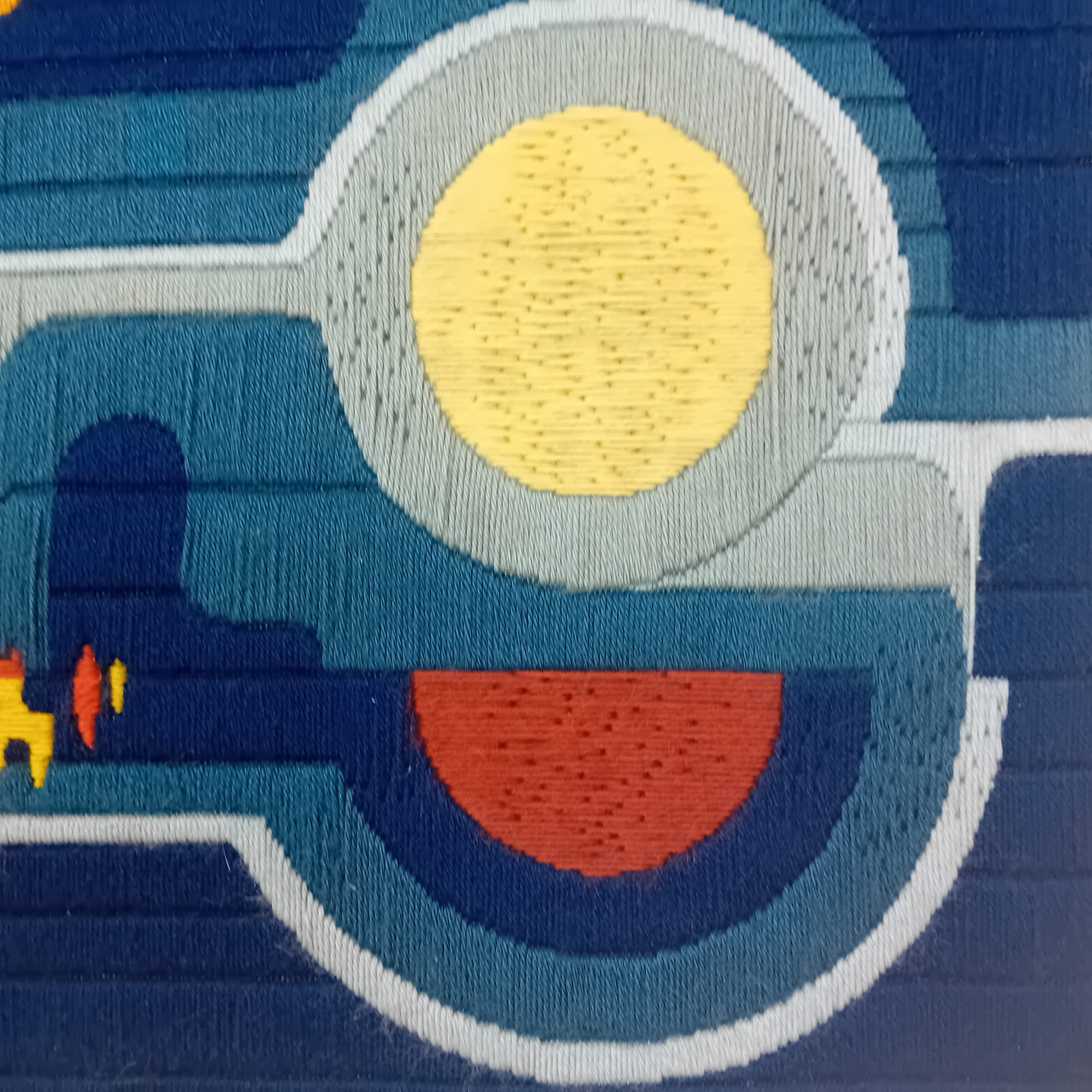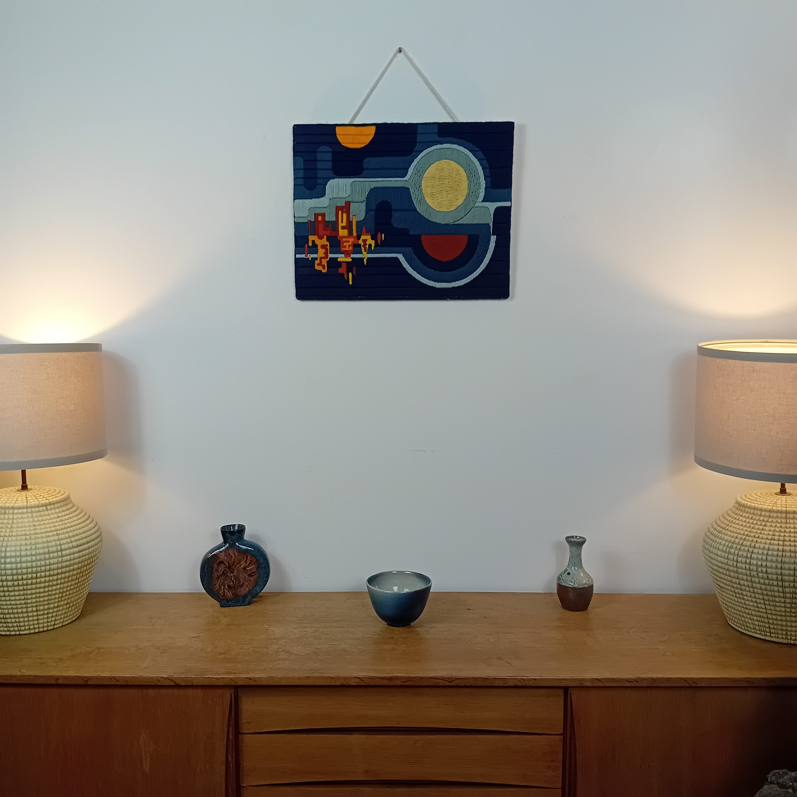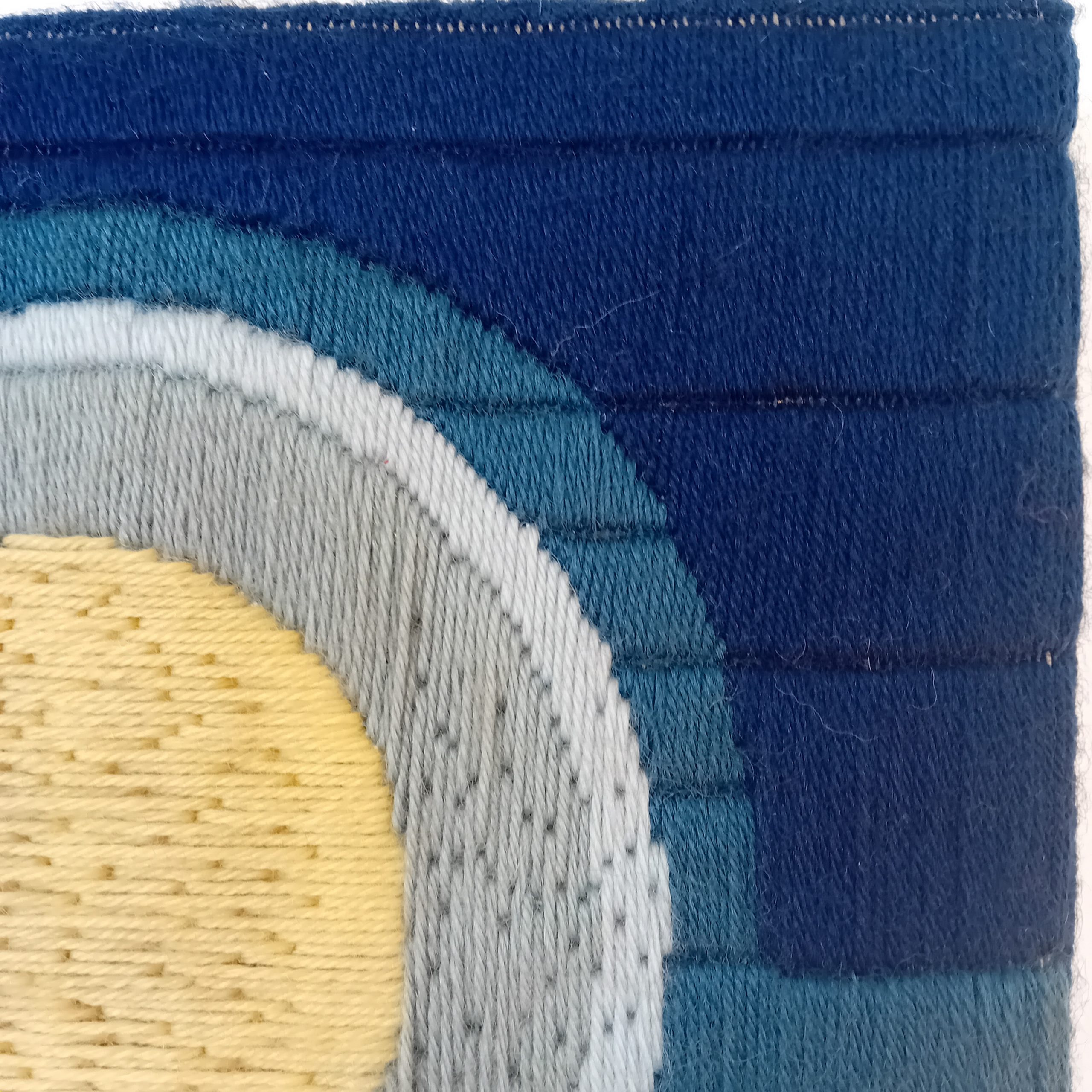 Une belle tapisserie au point lancé Vintage aux couleurs bleues, oranges, jaunes, ocres et beiges.
