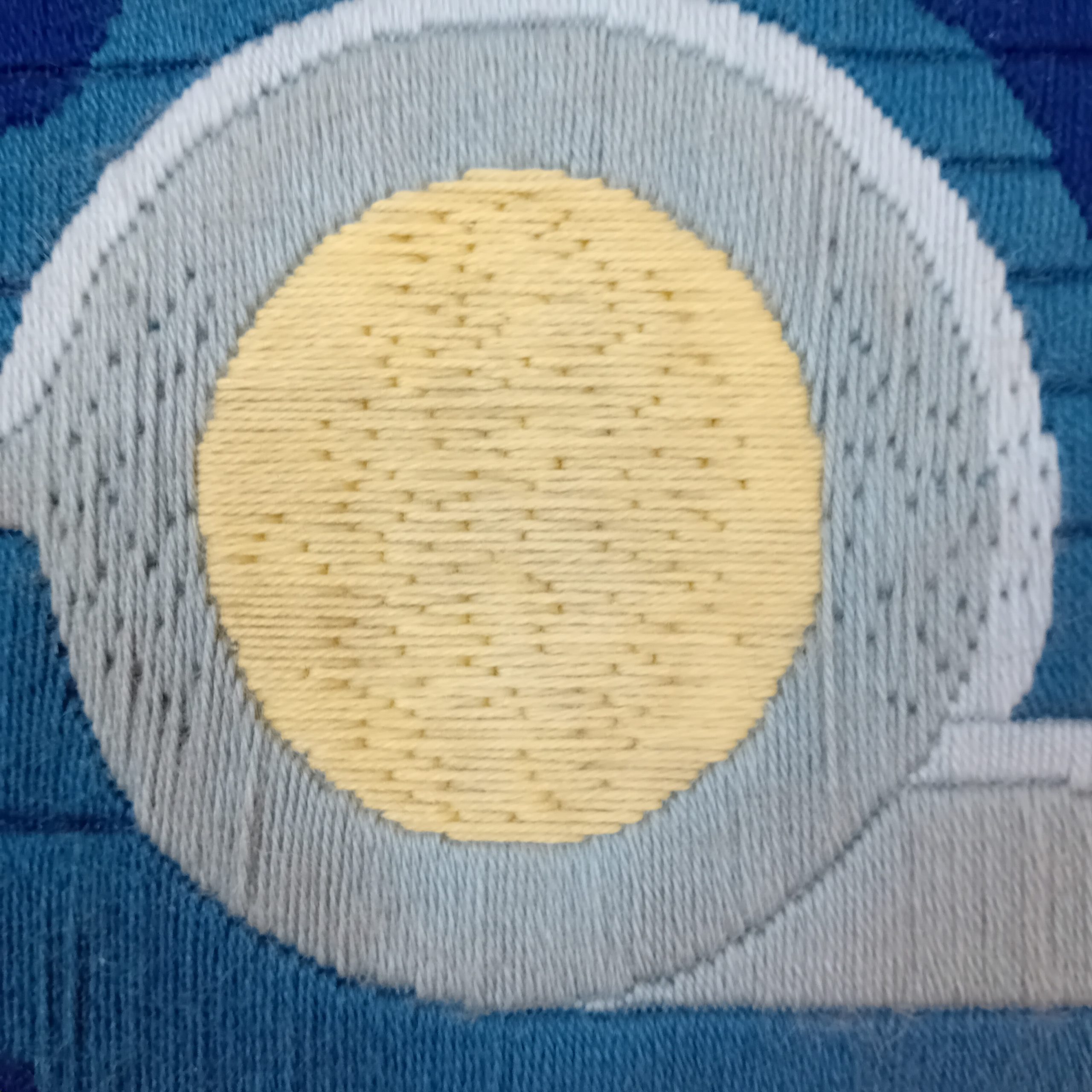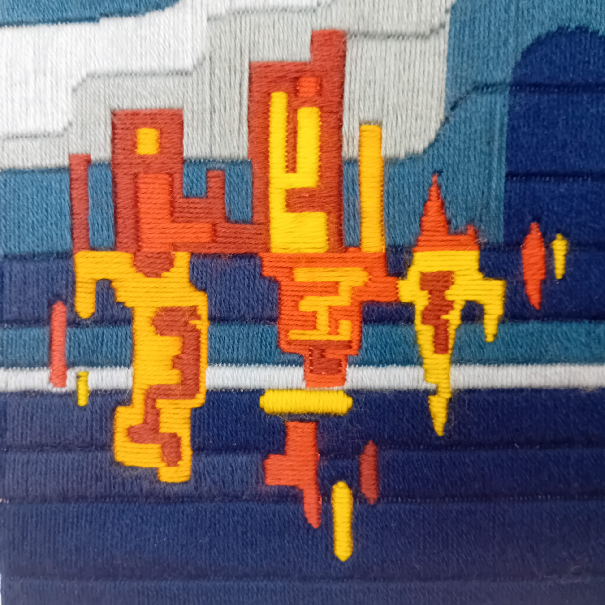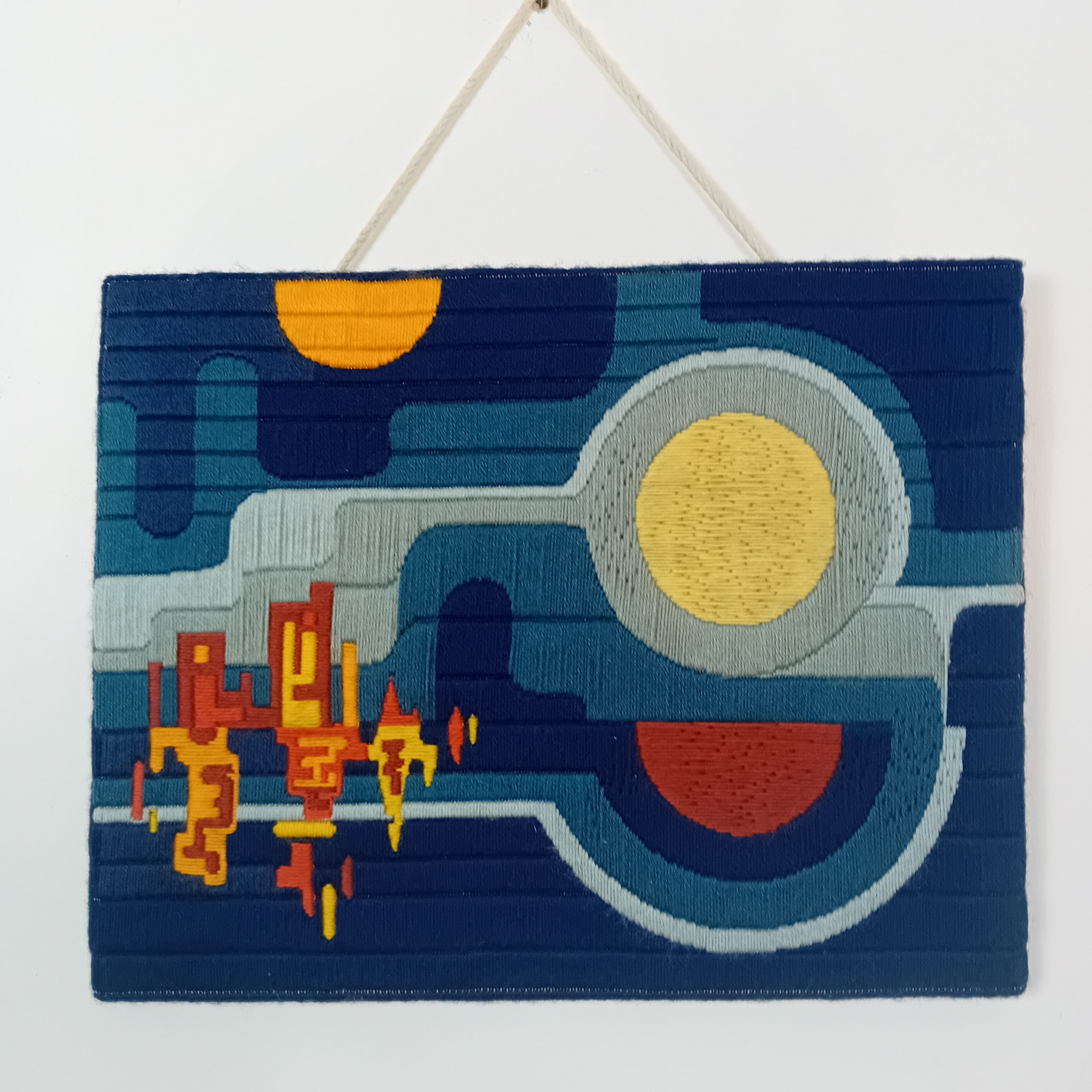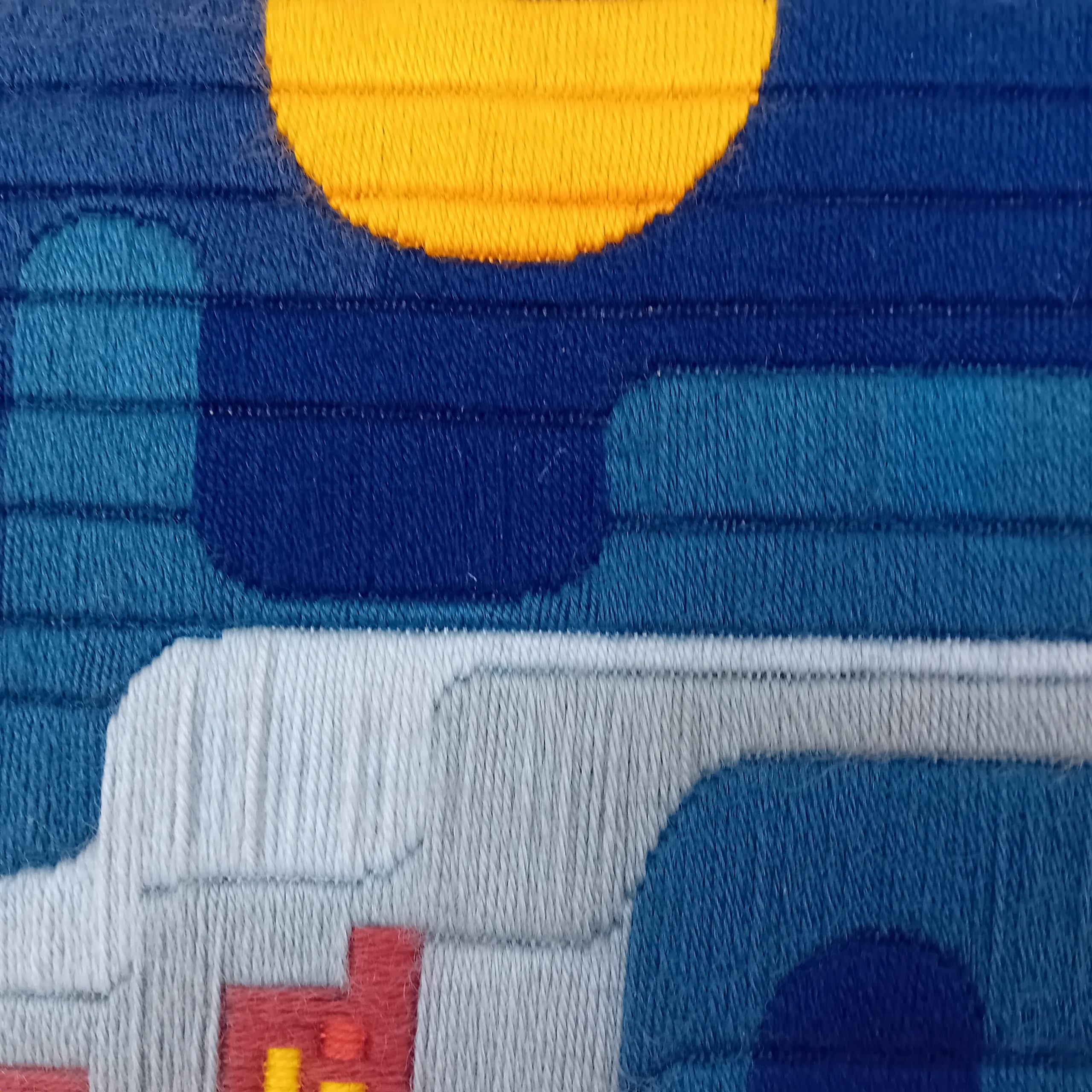 Une belle tapisserie au point lancé Vintage aux couleurs bleues, oranges, jaunes, ocres et beiges.