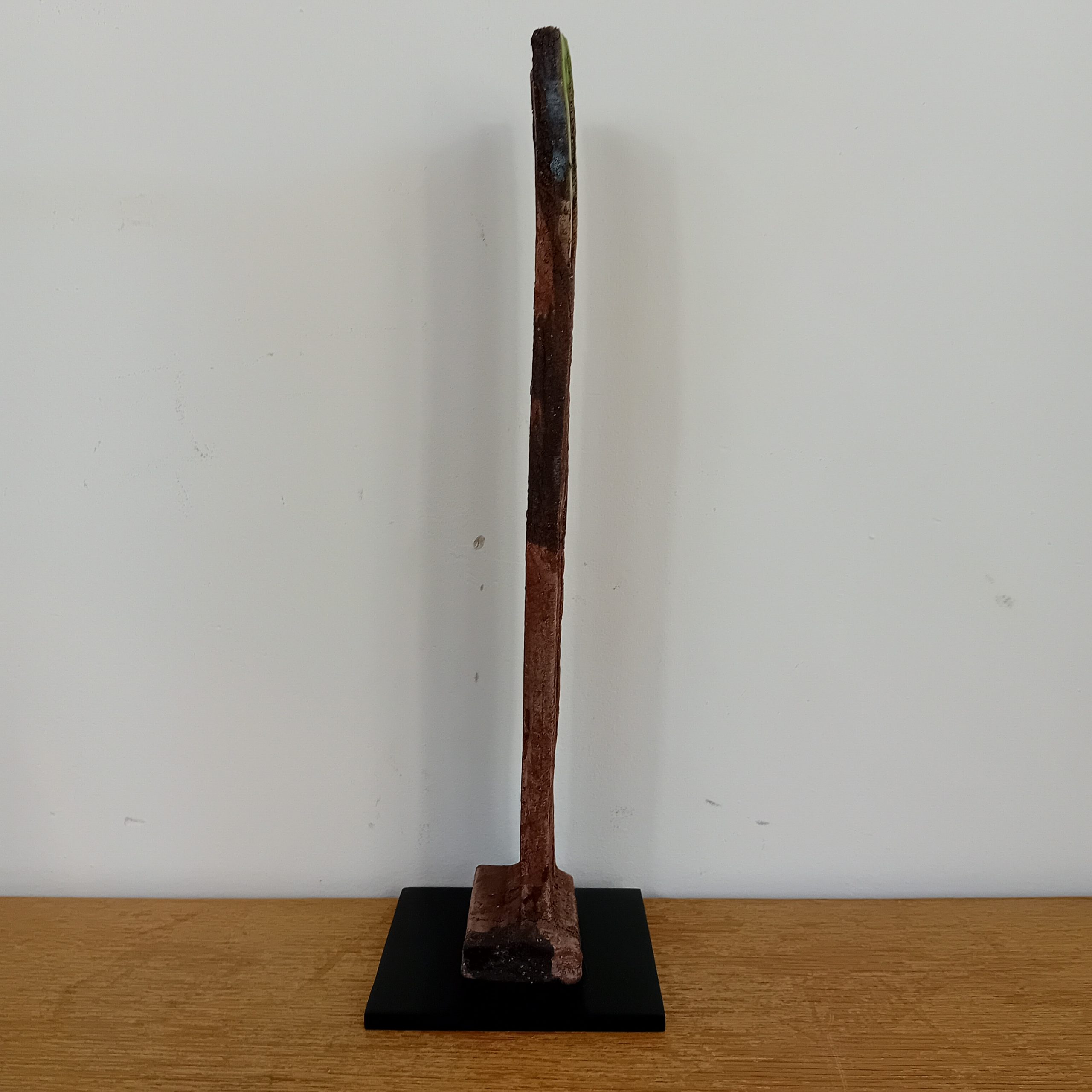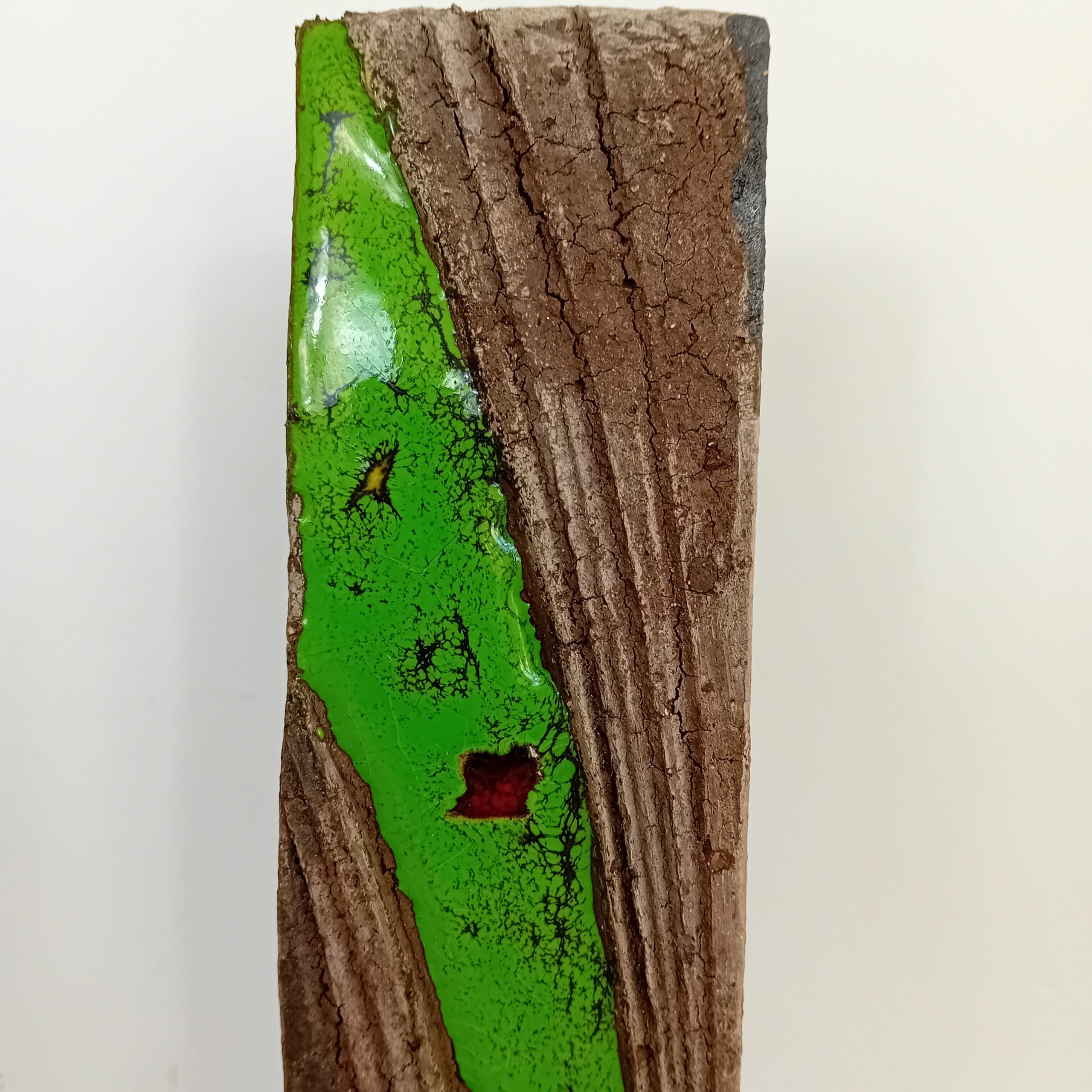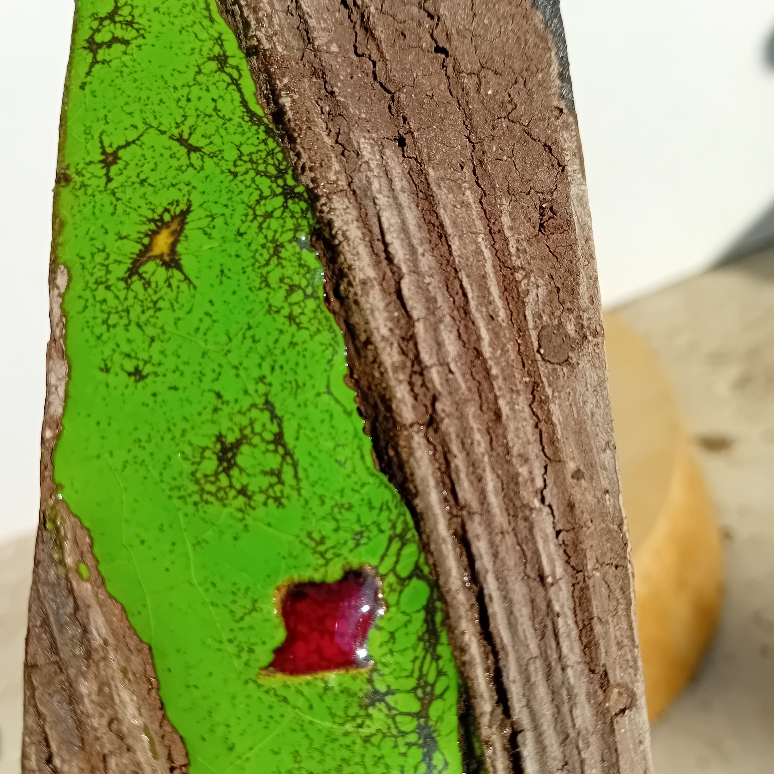 La pièce se distingue par sa forme élancée et la profondeur de sa texture naturelle, contrastée par un ruban d’émail vert vif ponctué d’un accent rouge.