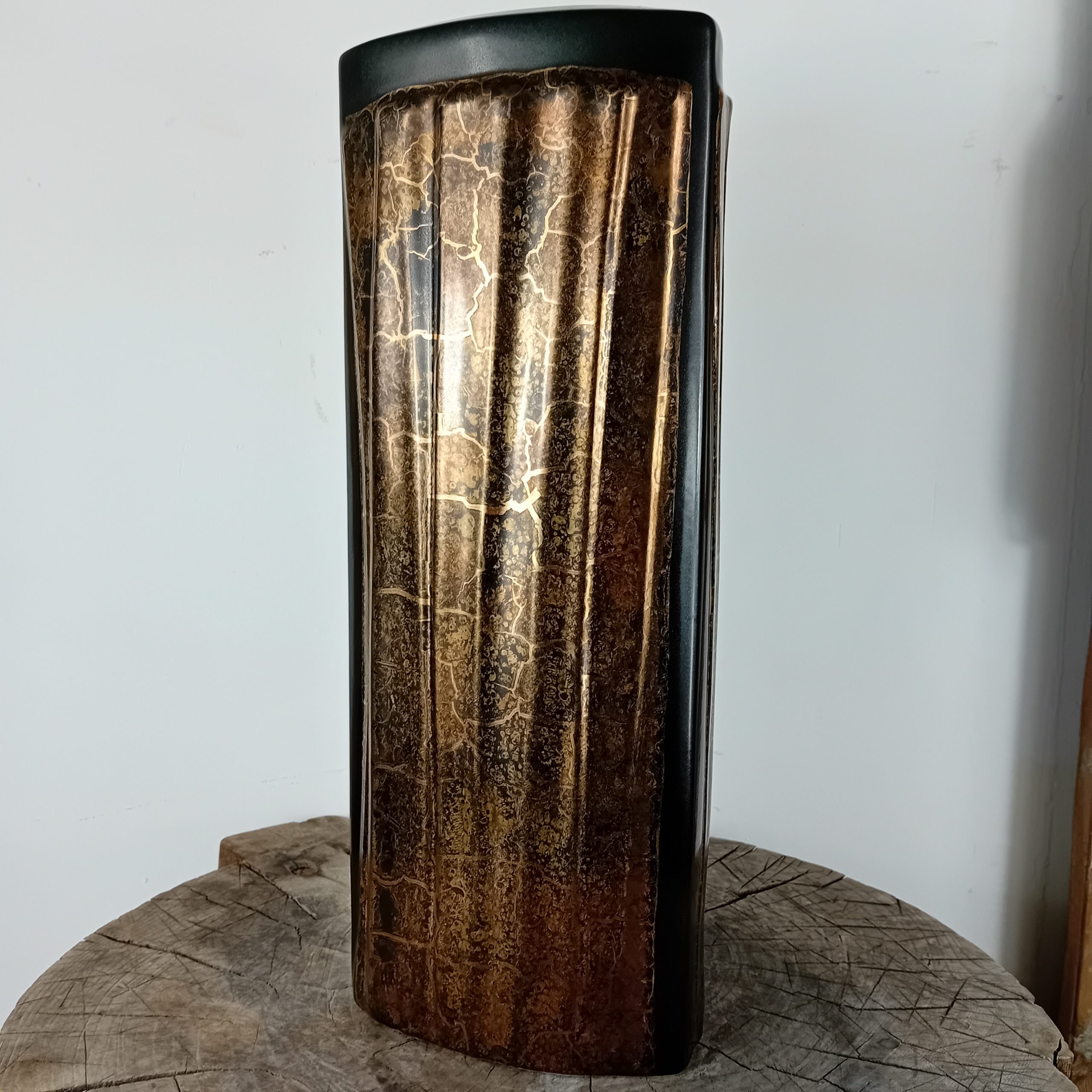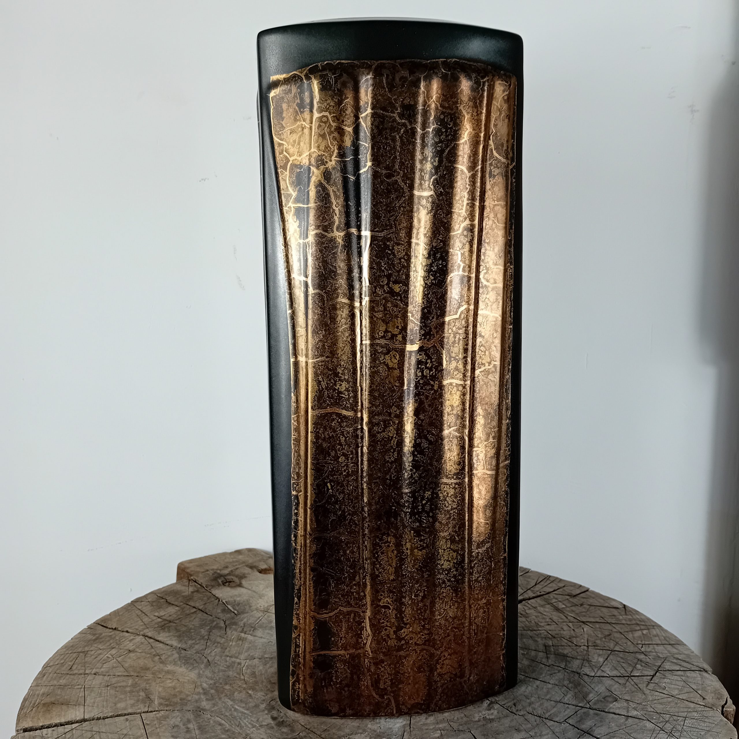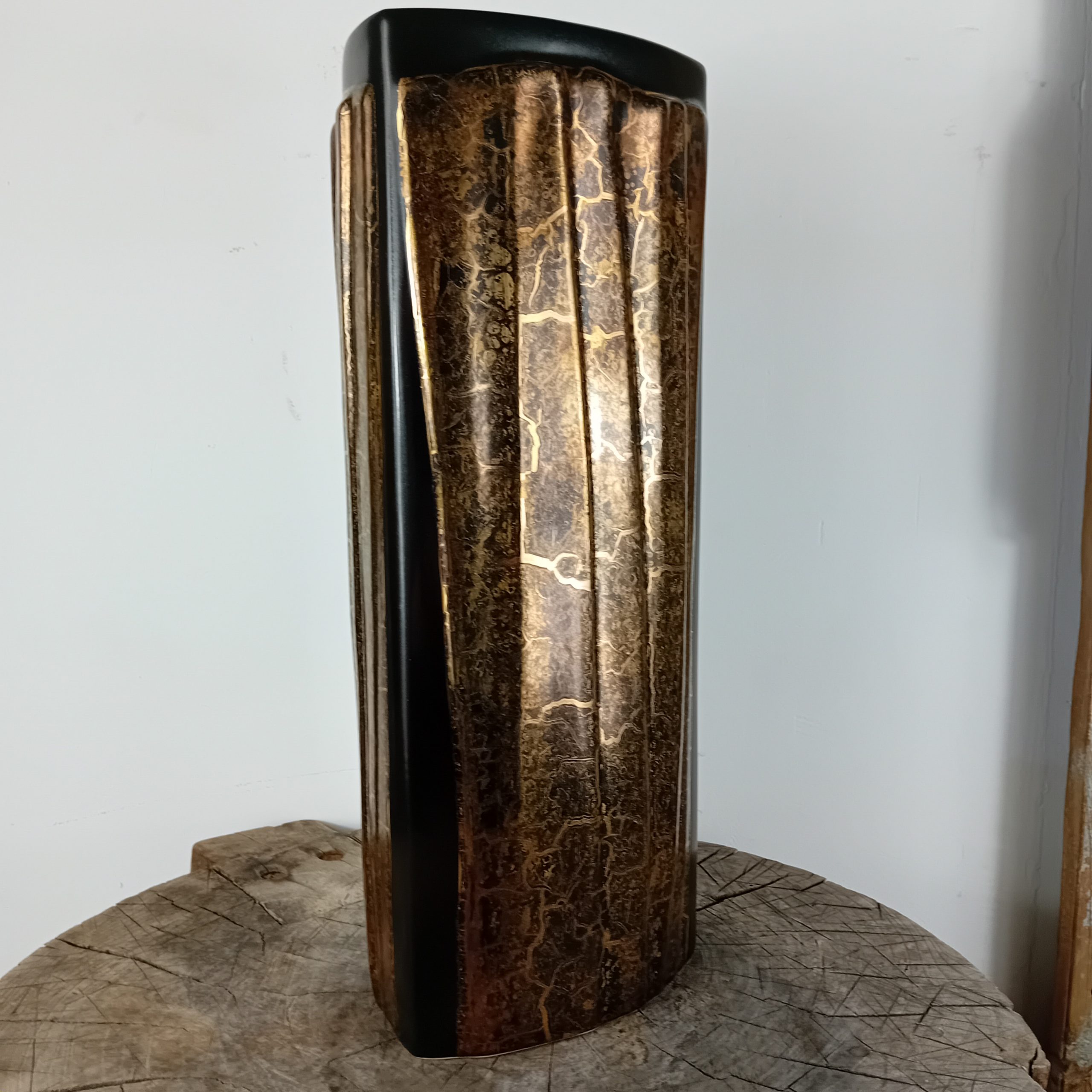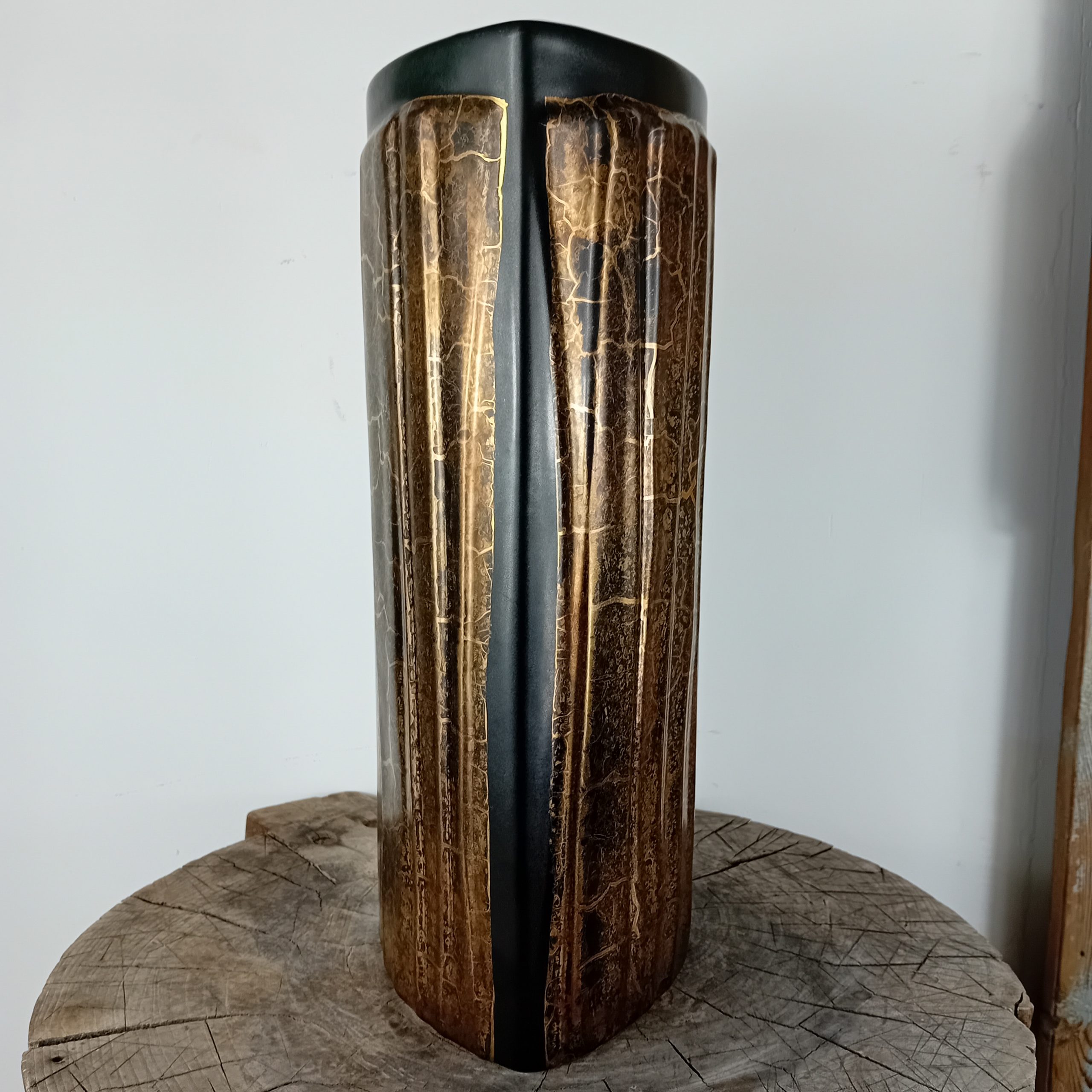Un grand vase noir mat et or huilé de la céramiste Canadienne Pauline Pelletier.