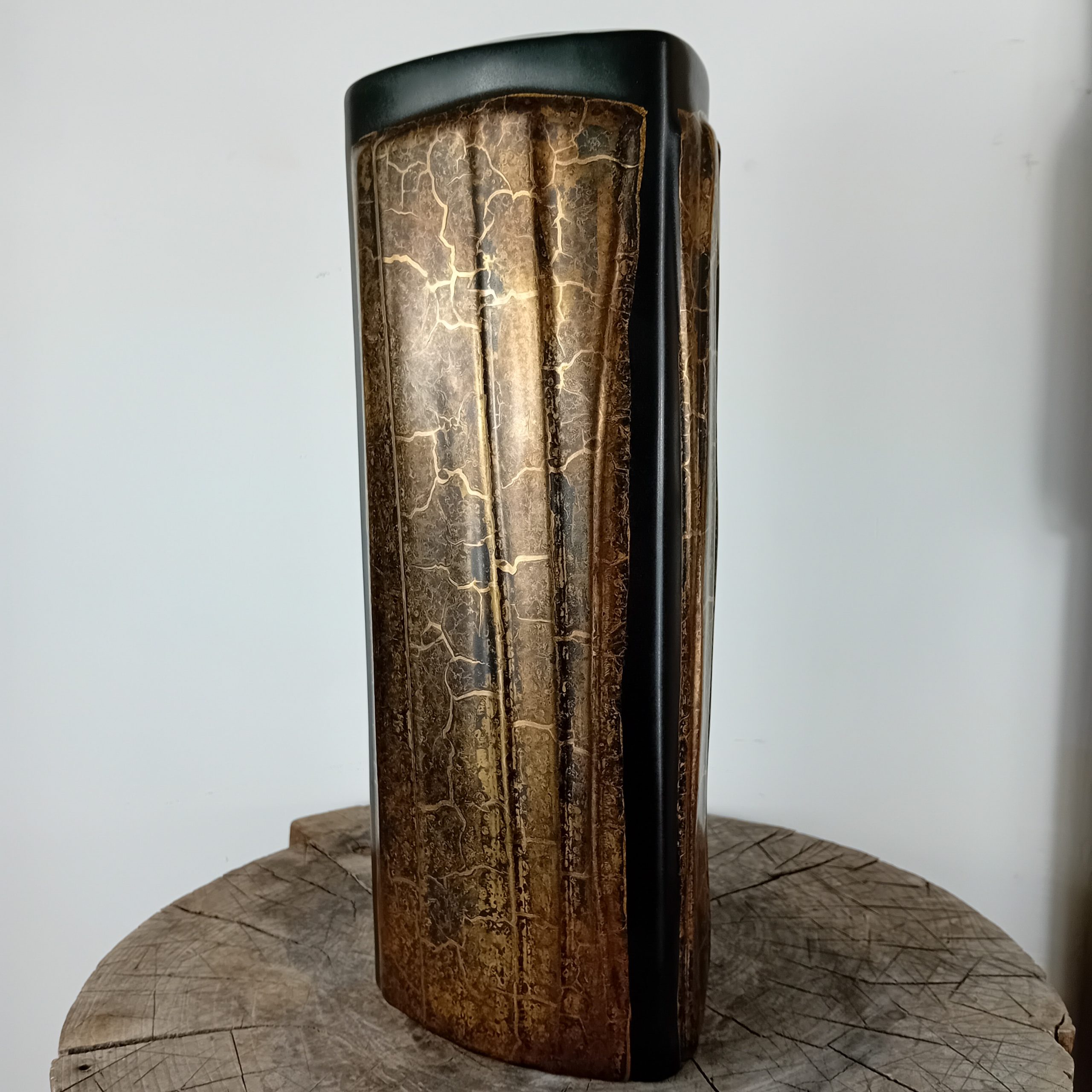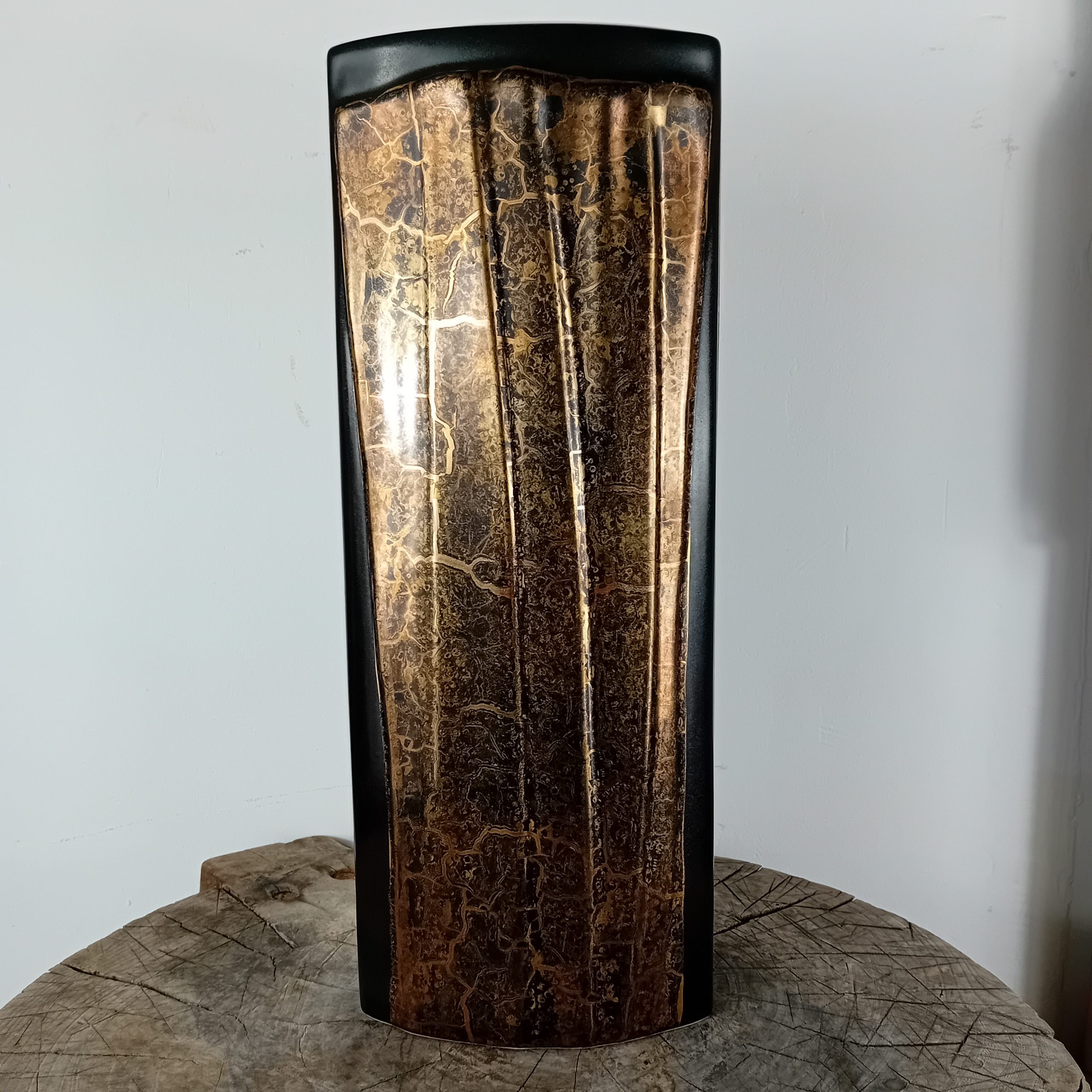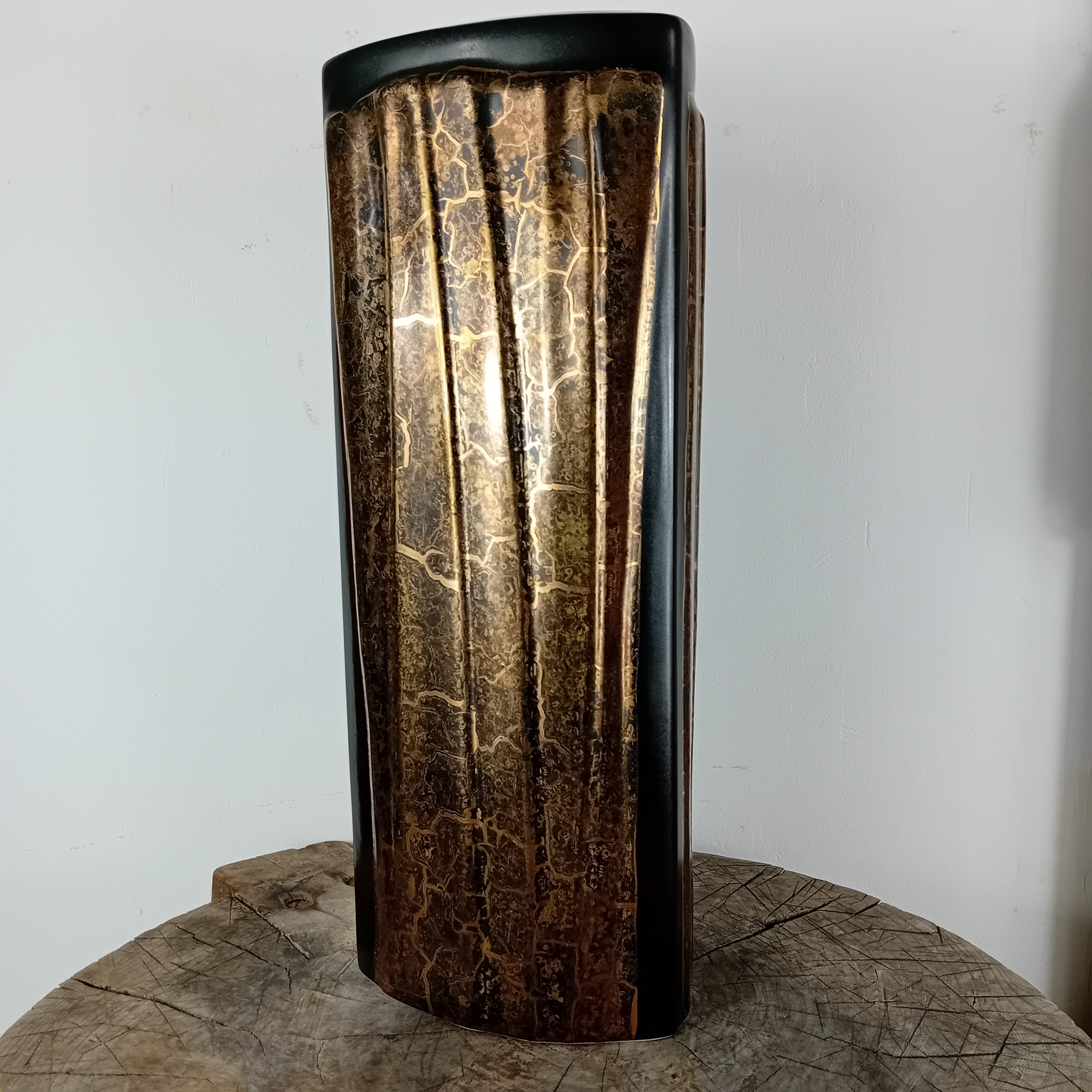 Un grand vase noir mat et or huilé de la céramiste Canadienne Pauline Pelletier.