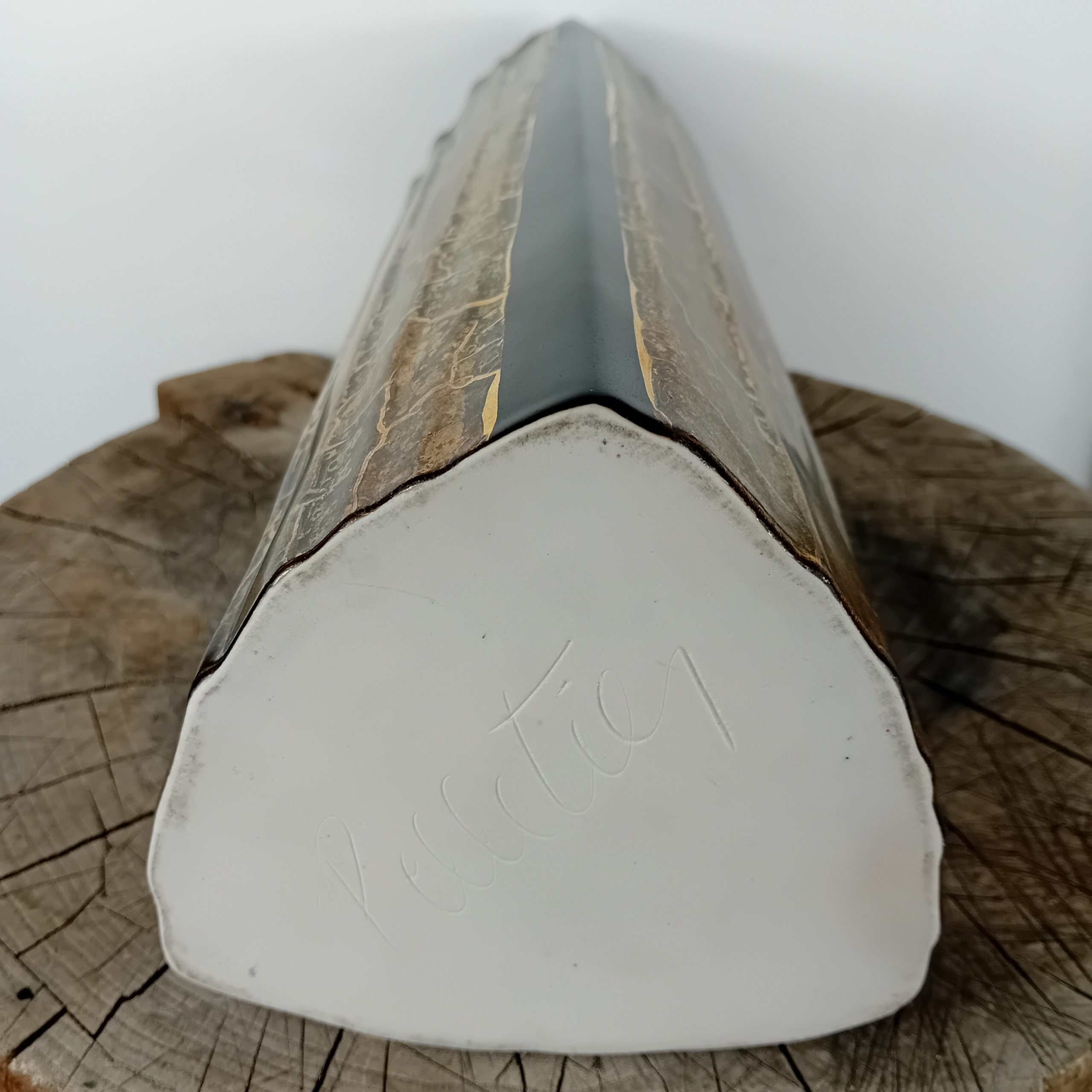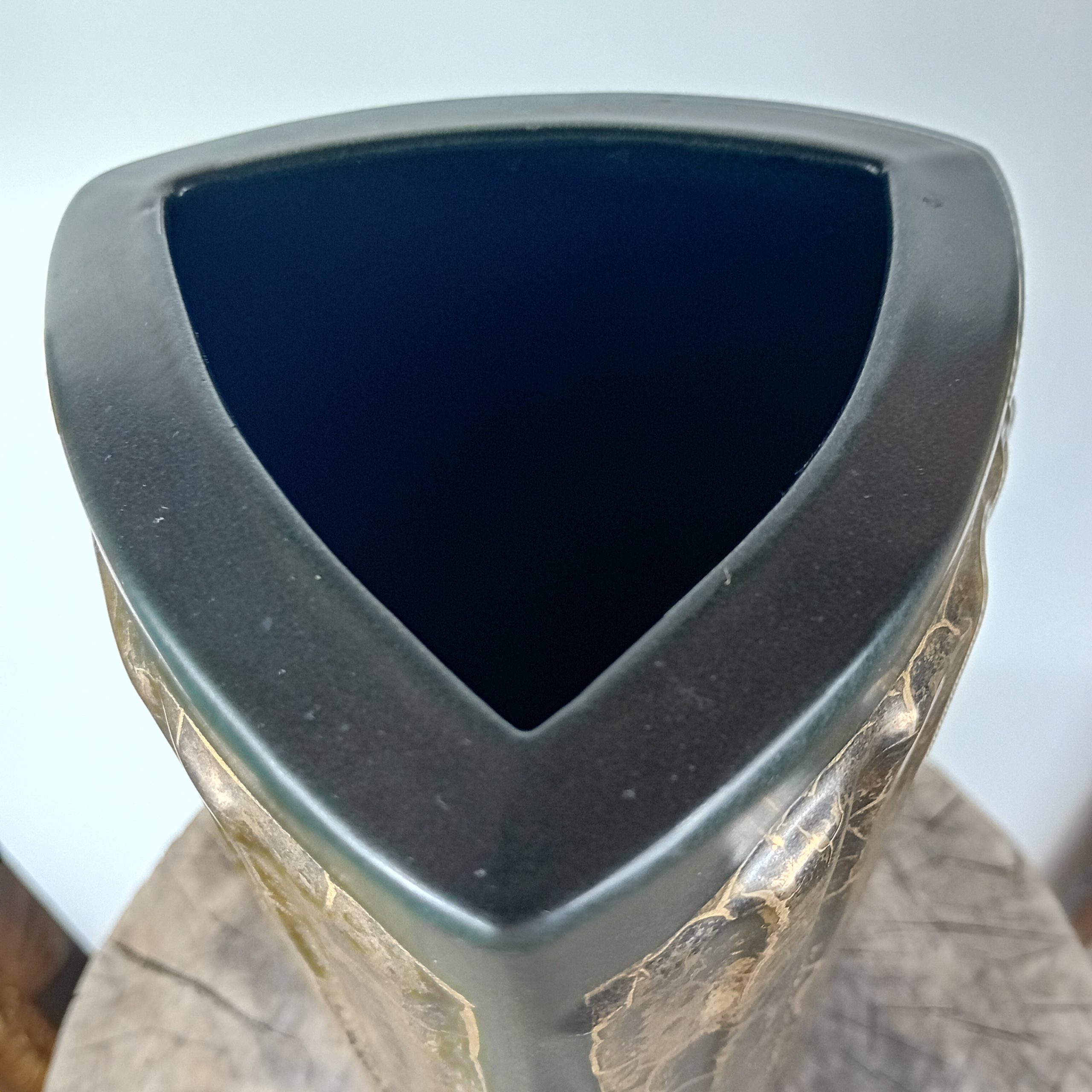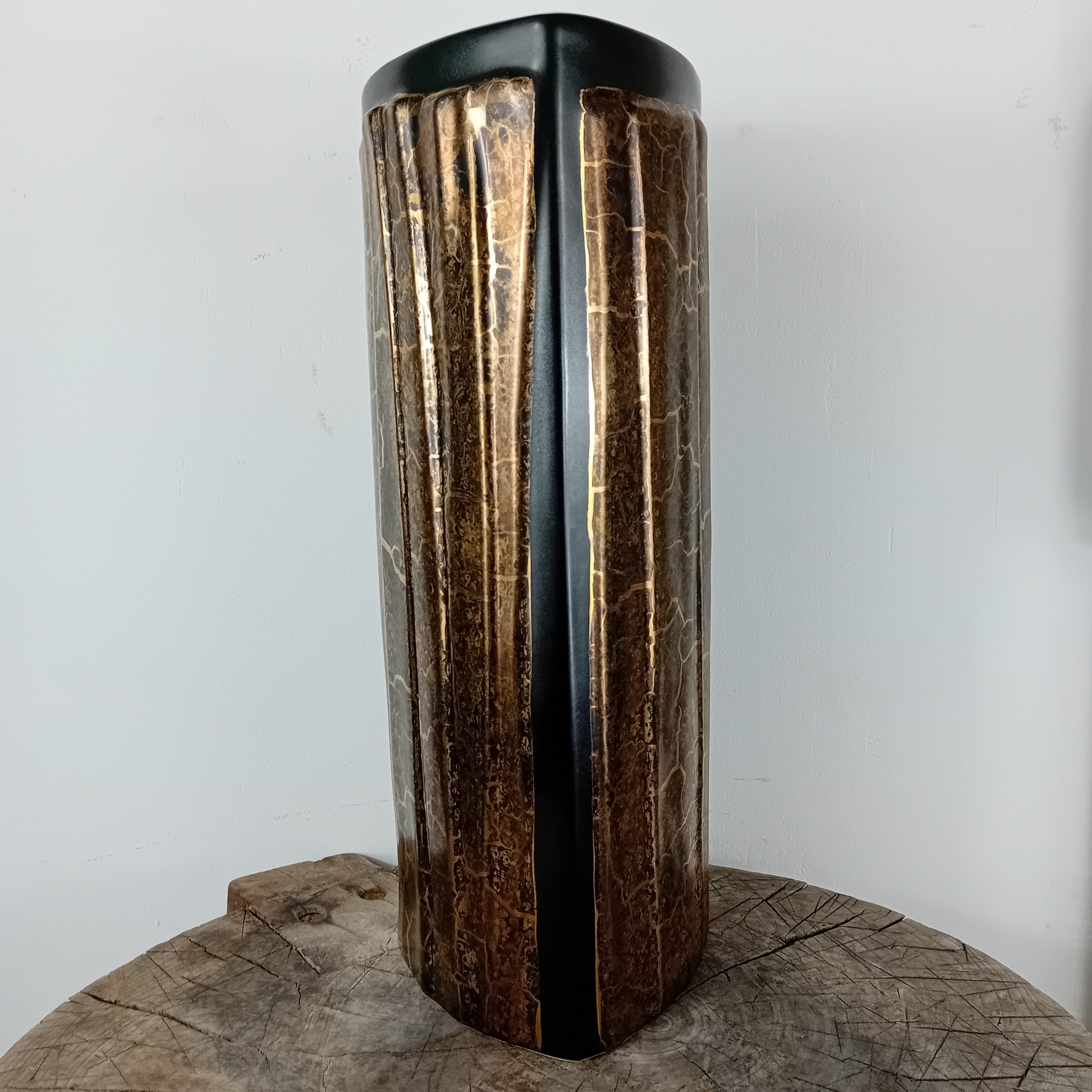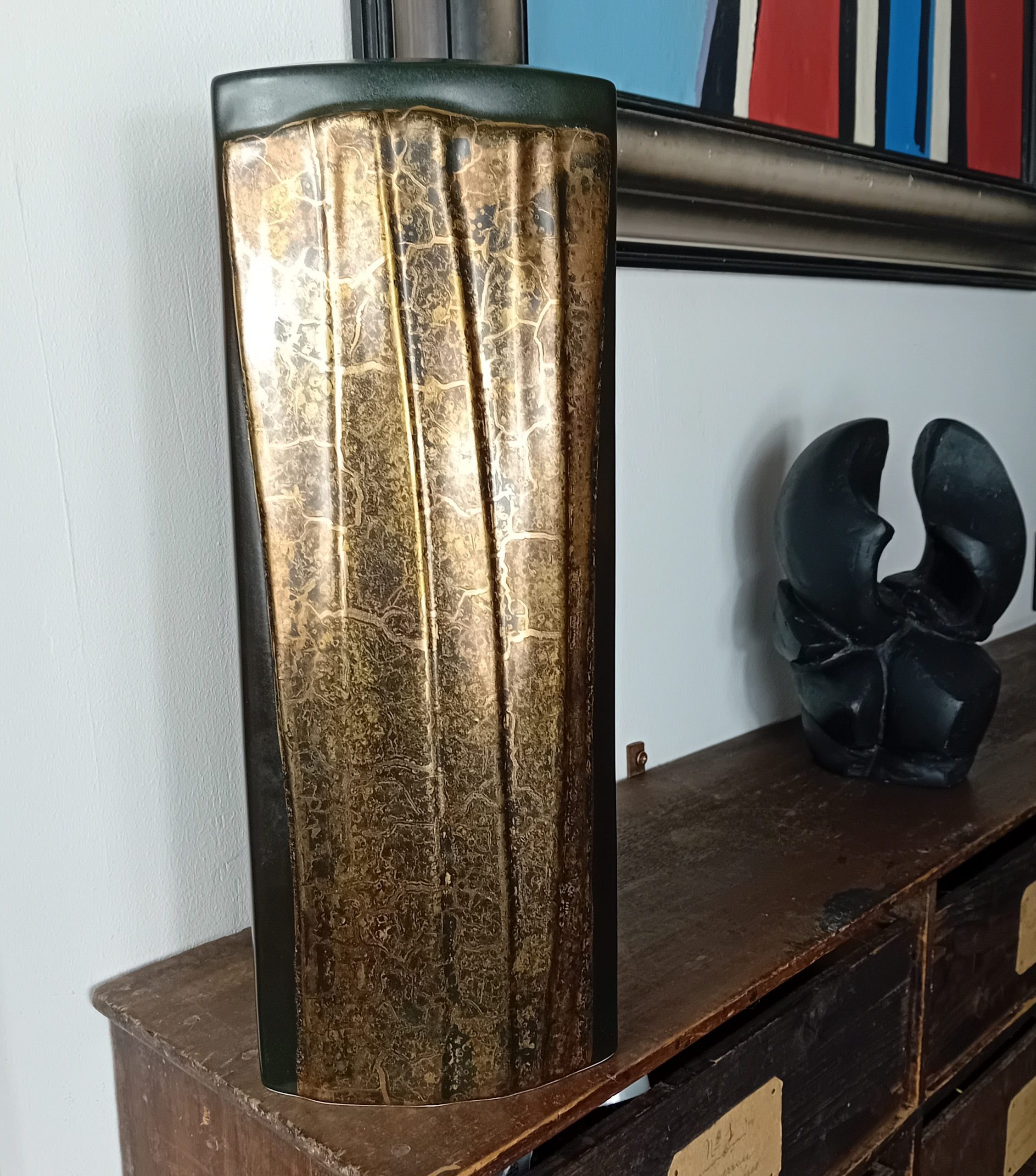 Un grand vase noir mat et or huilé de la céramiste Canadienne Pauline Pelletier.