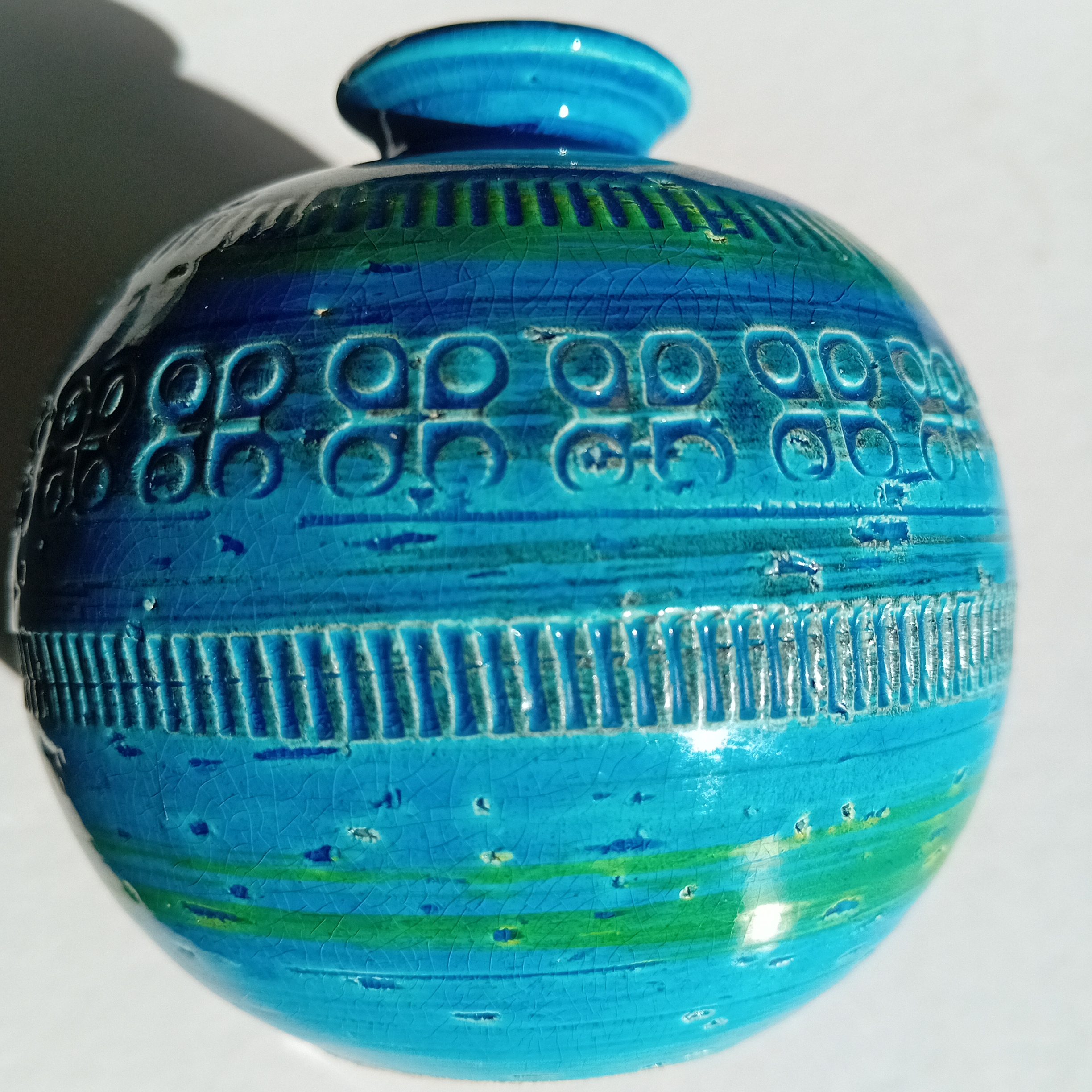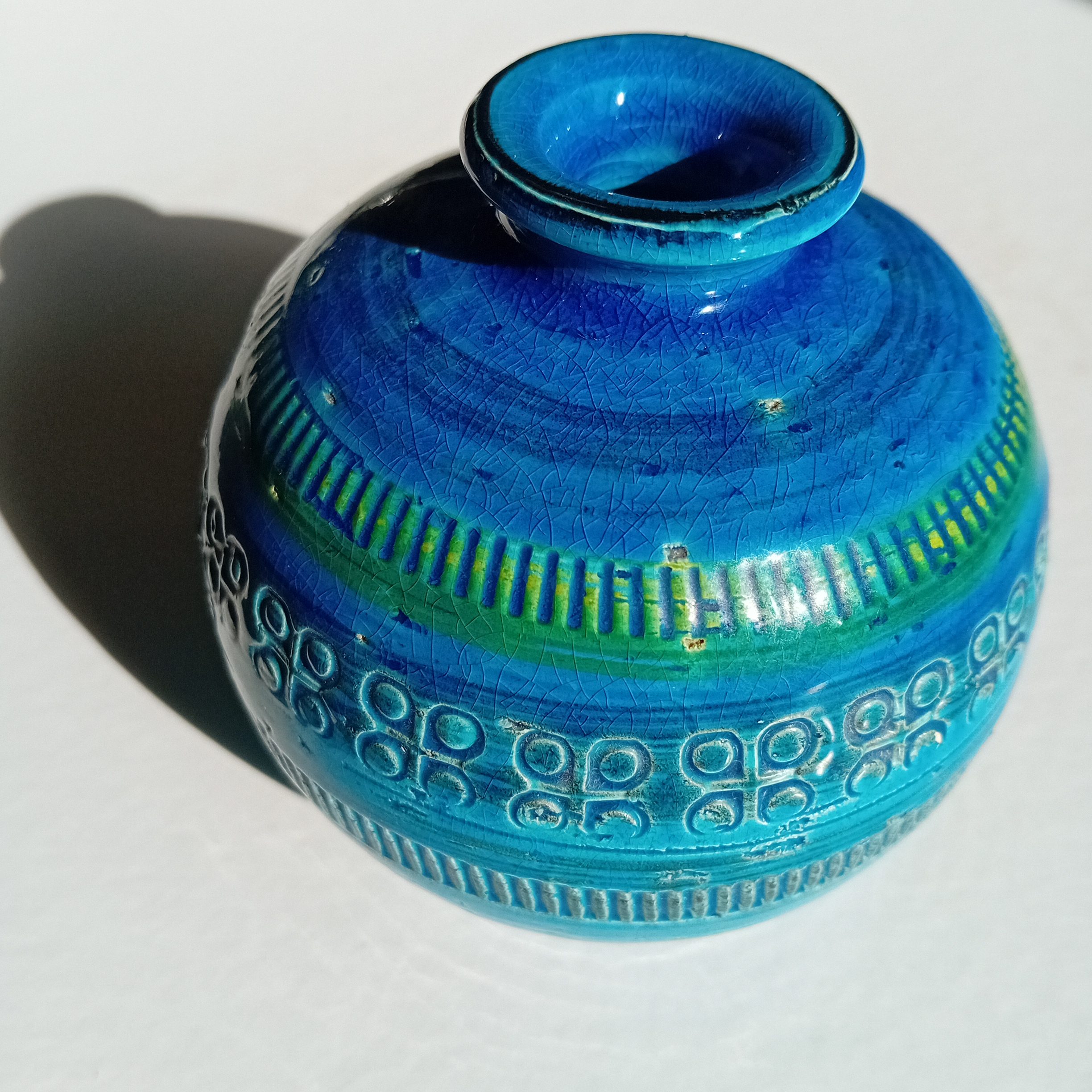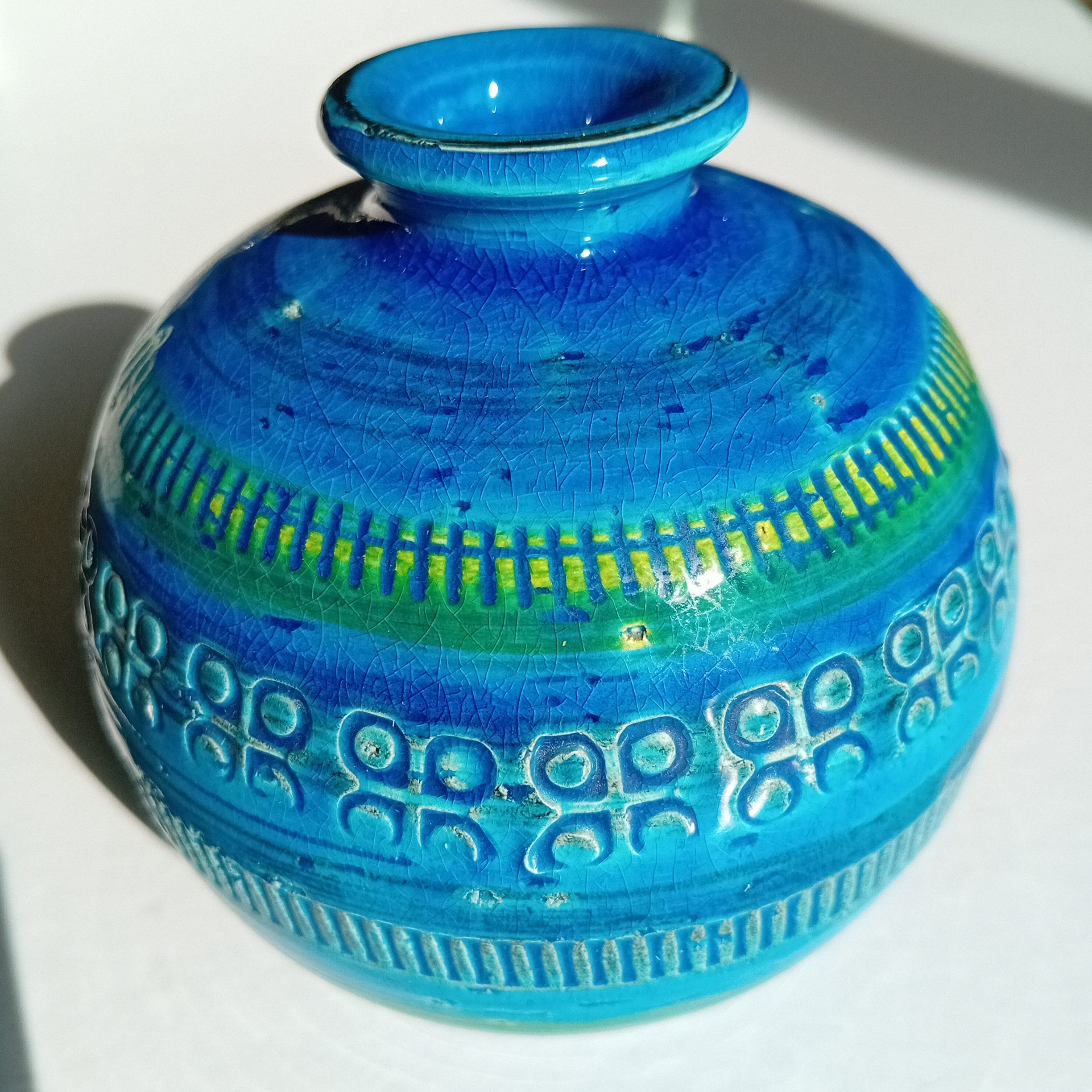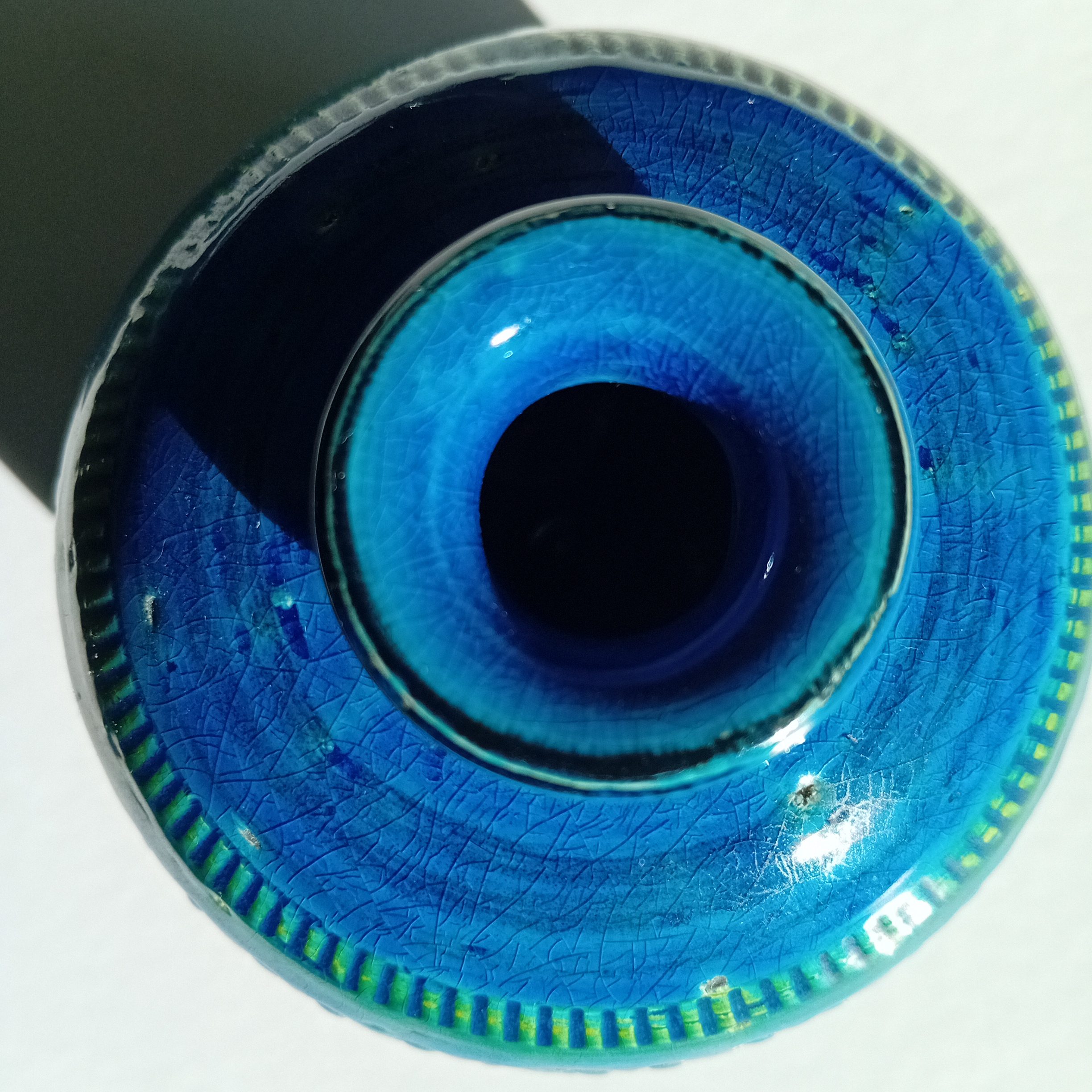 Ici, l’association du bleu profond, du turquoise et de touches vertes crée un effet visuel vivant, qui évolue selon la lumière. Par ailleurs, le réseau naturel de craquelures témoigne de la qualité de l’émail.