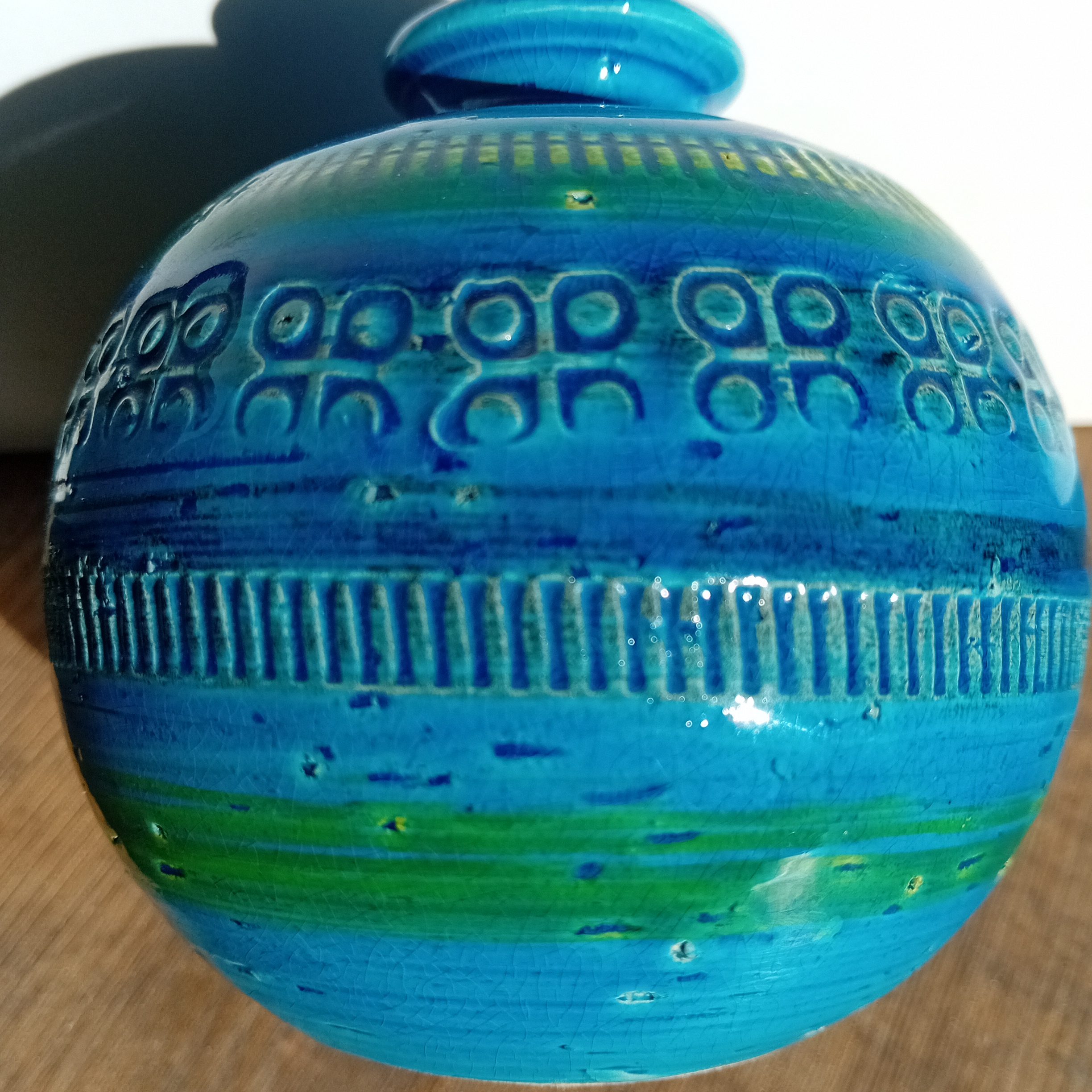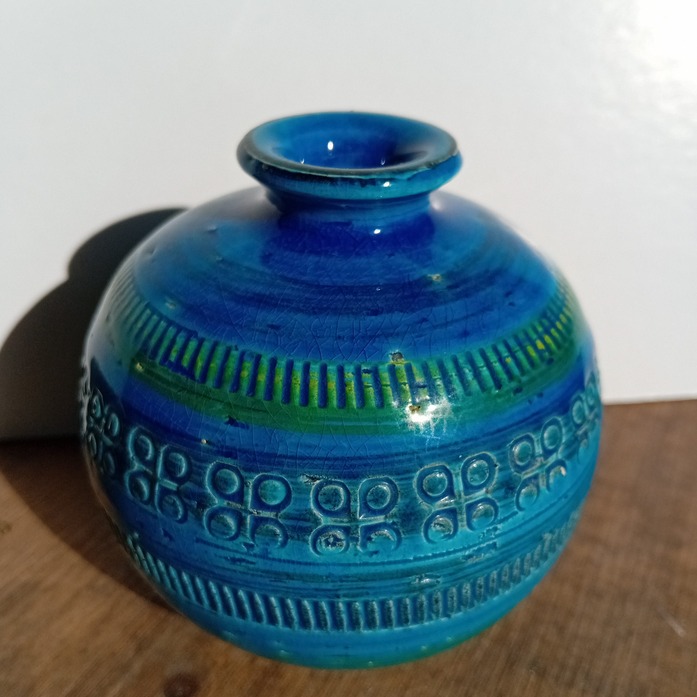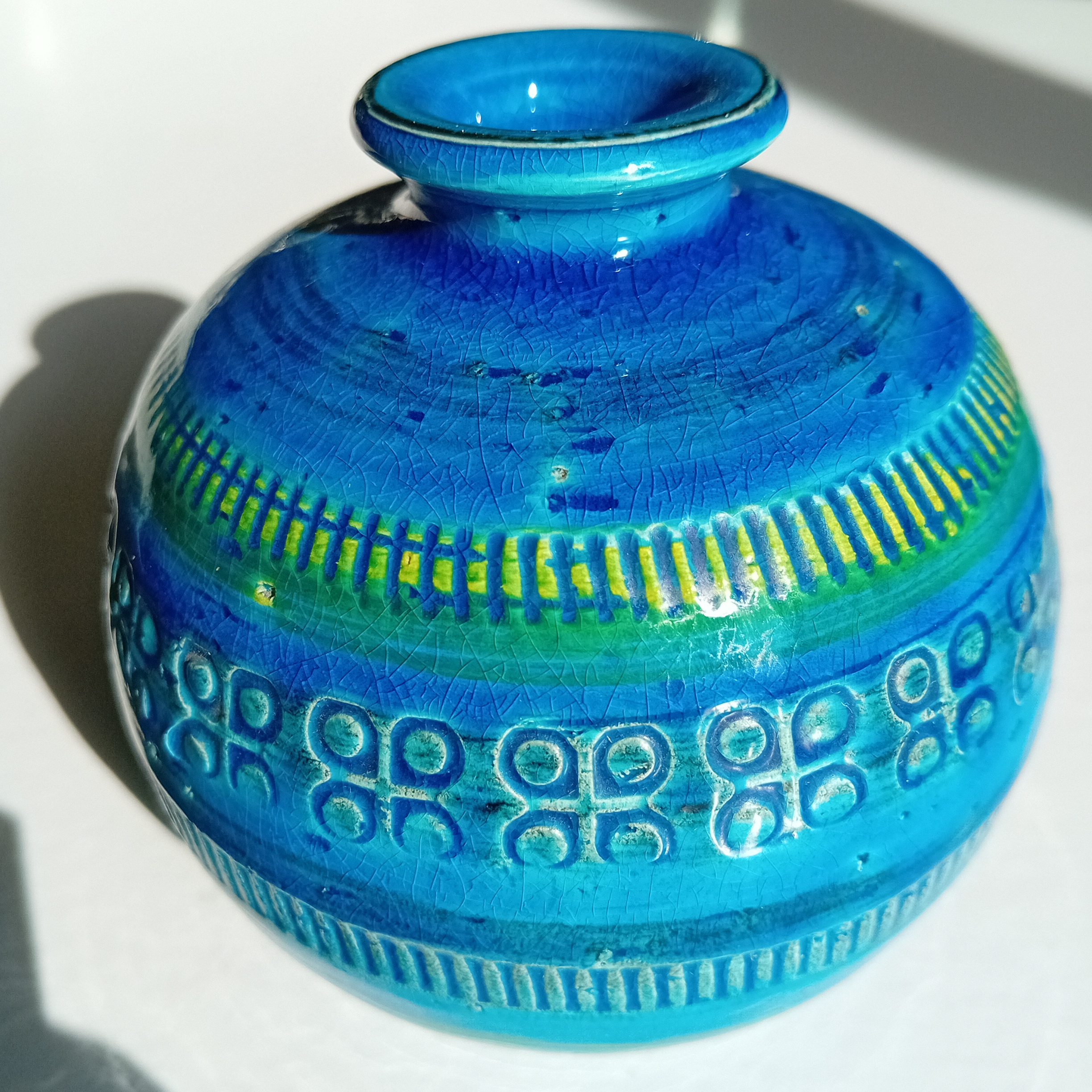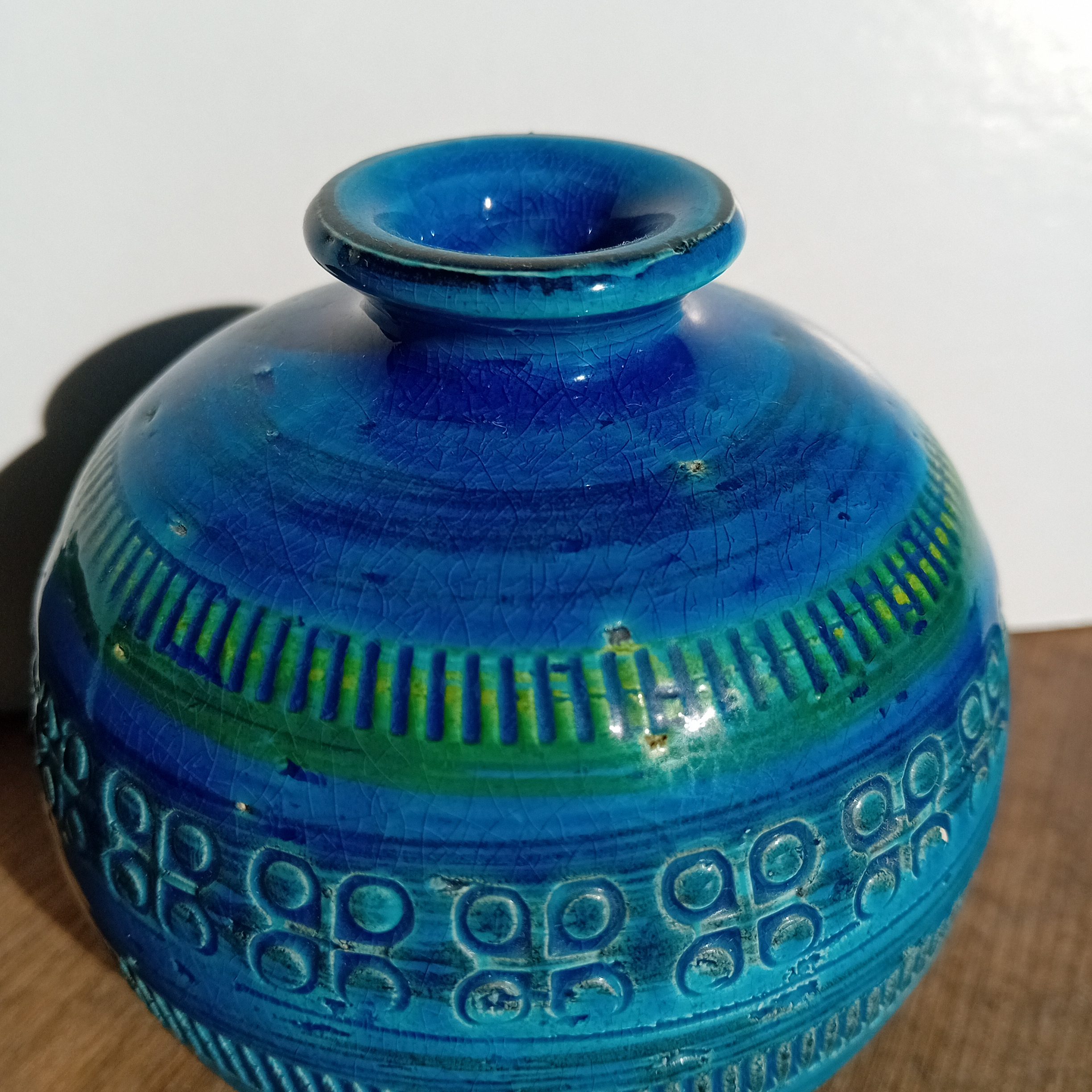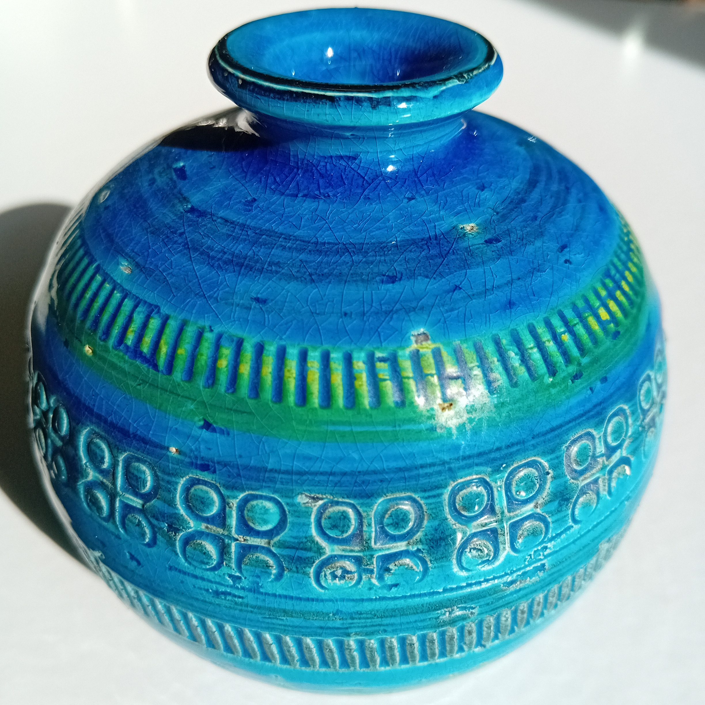 Ici, l’association du bleu profond, du turquoise et de touches vertes crée un effet visuel vivant, qui évolue selon la lumière. Par ailleurs, le réseau naturel de craquelures témoigne de la qualité de l’émail.