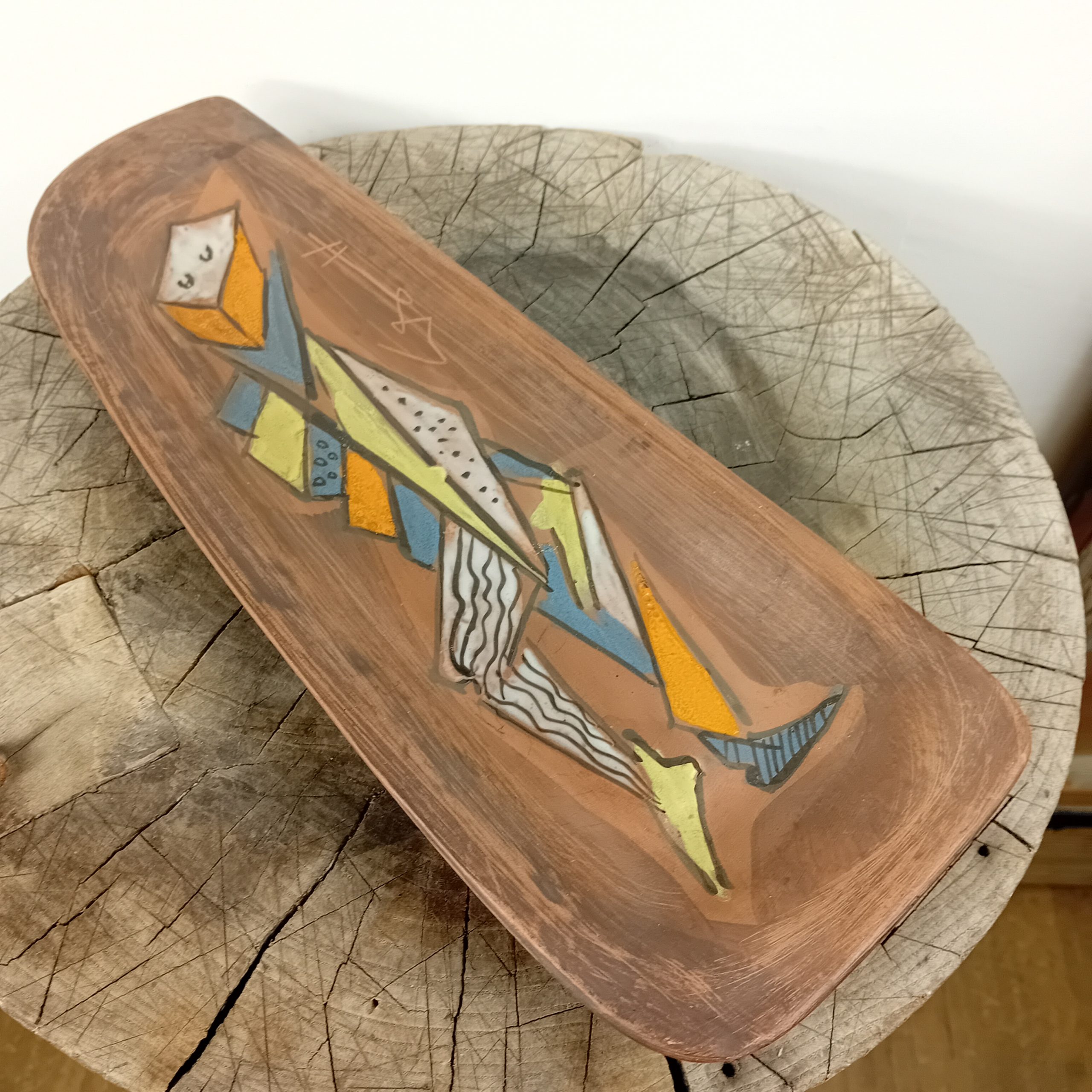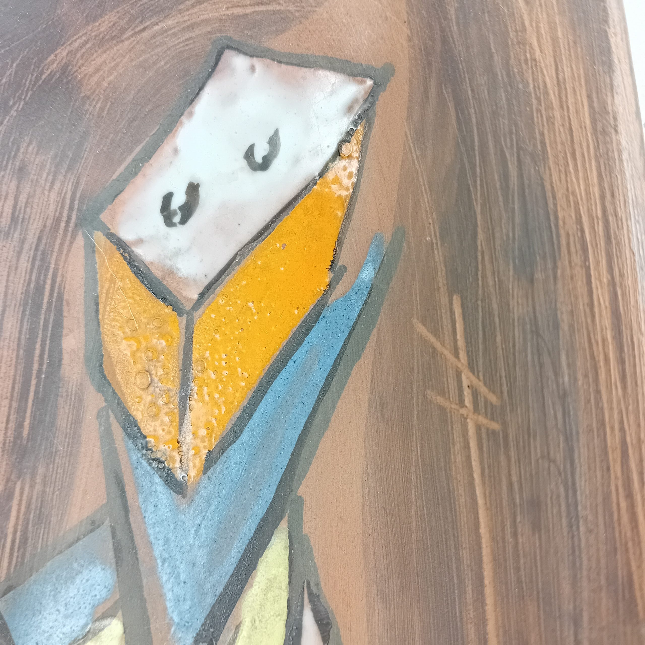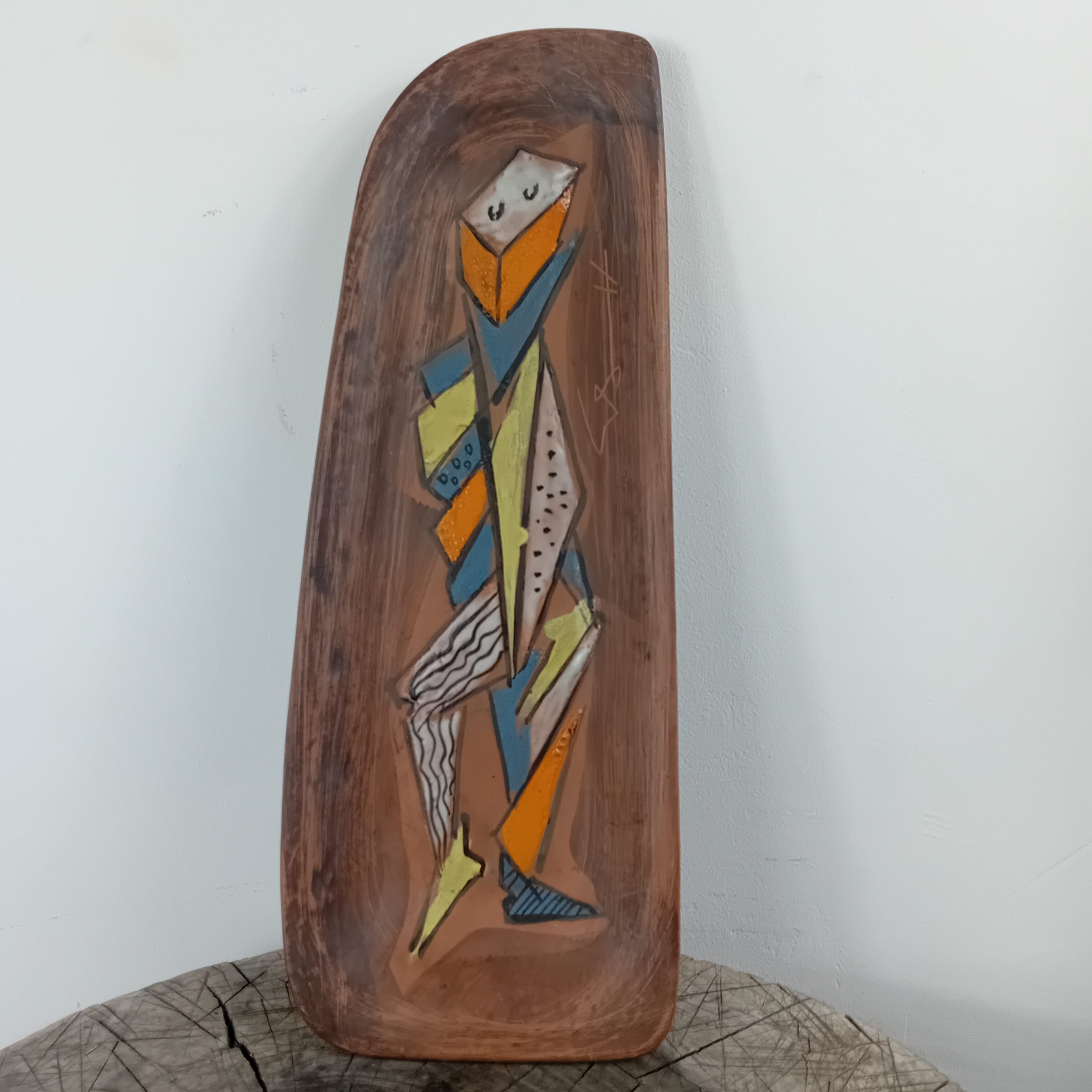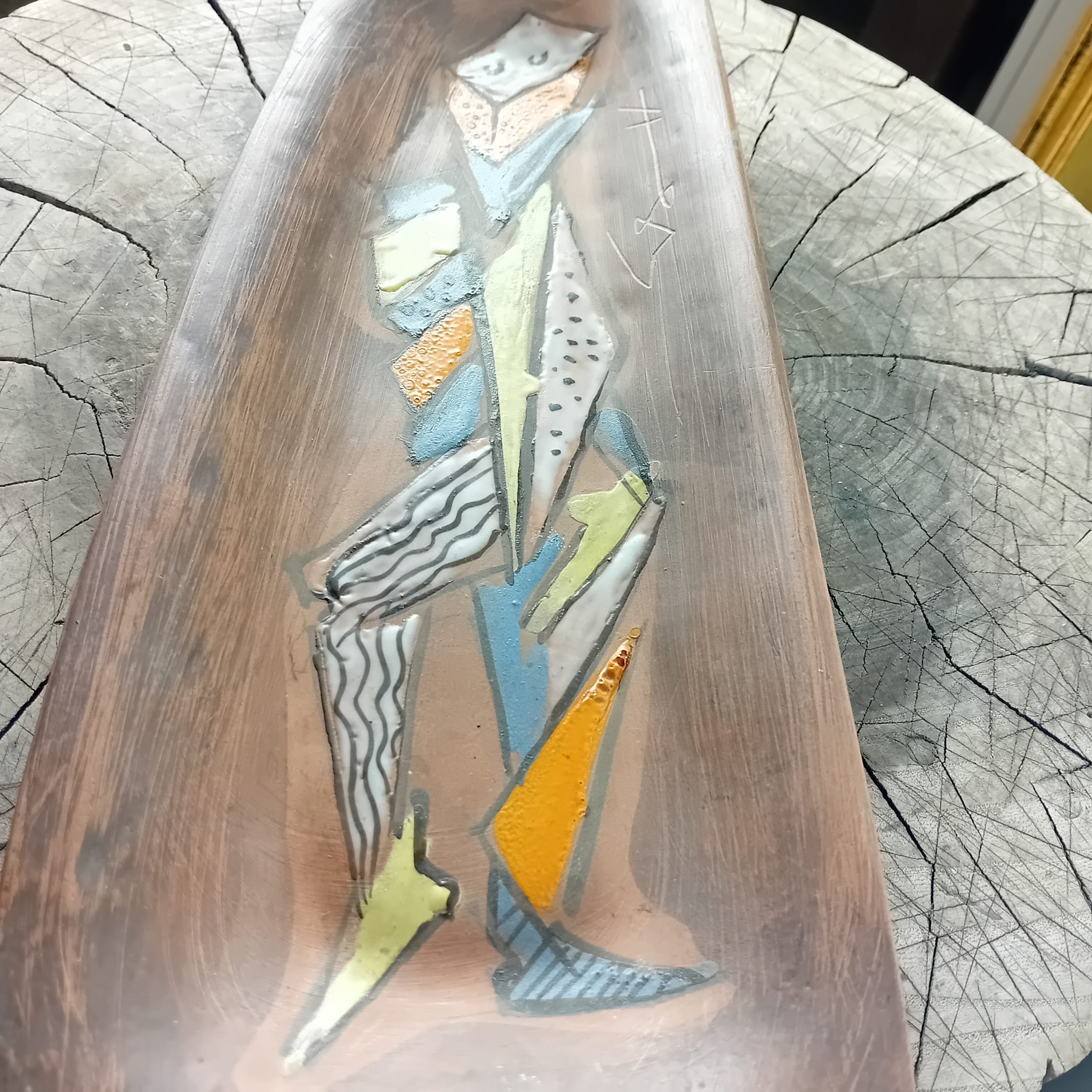 Un long vide poche en céramique avec décor de personnage cubiste émaillé.
