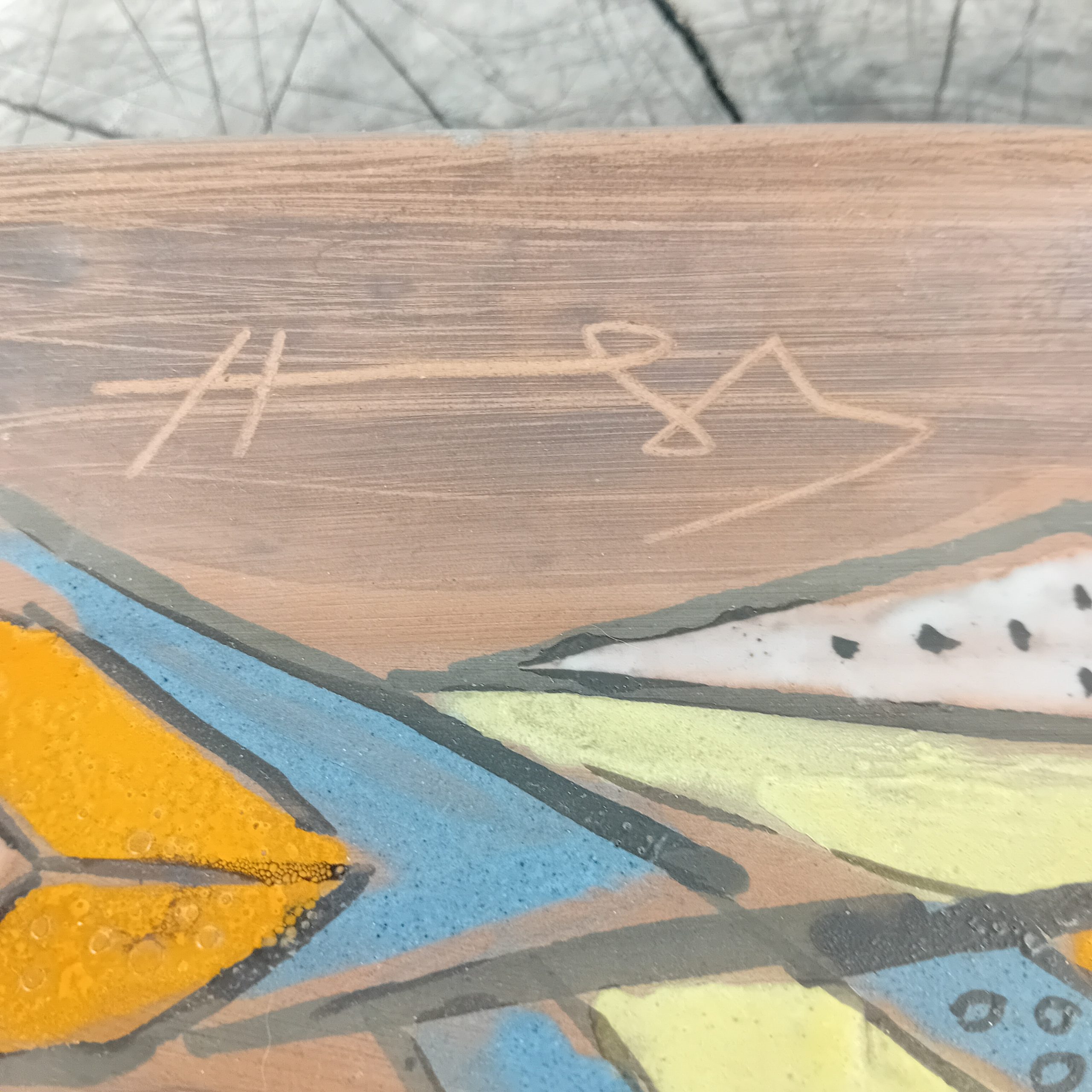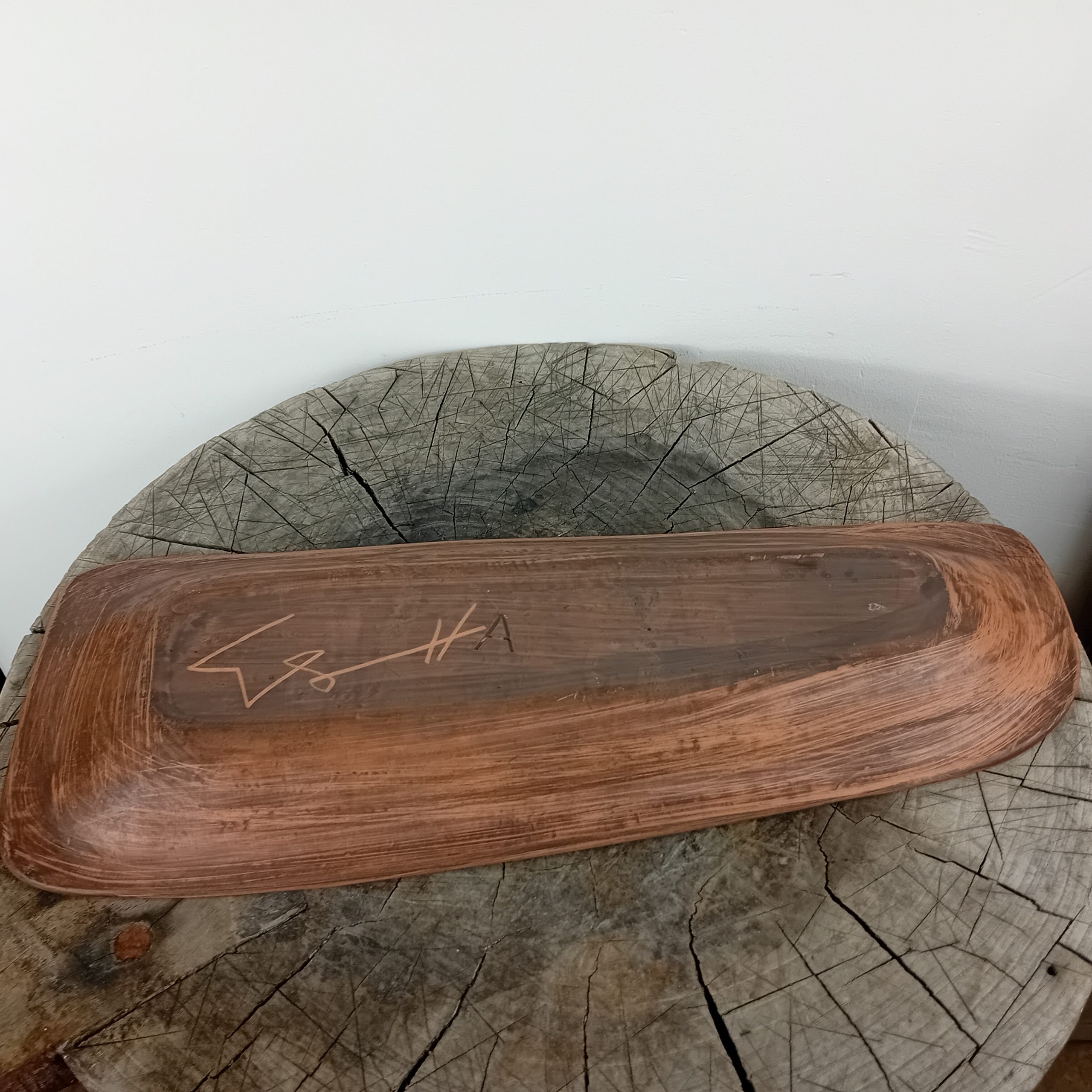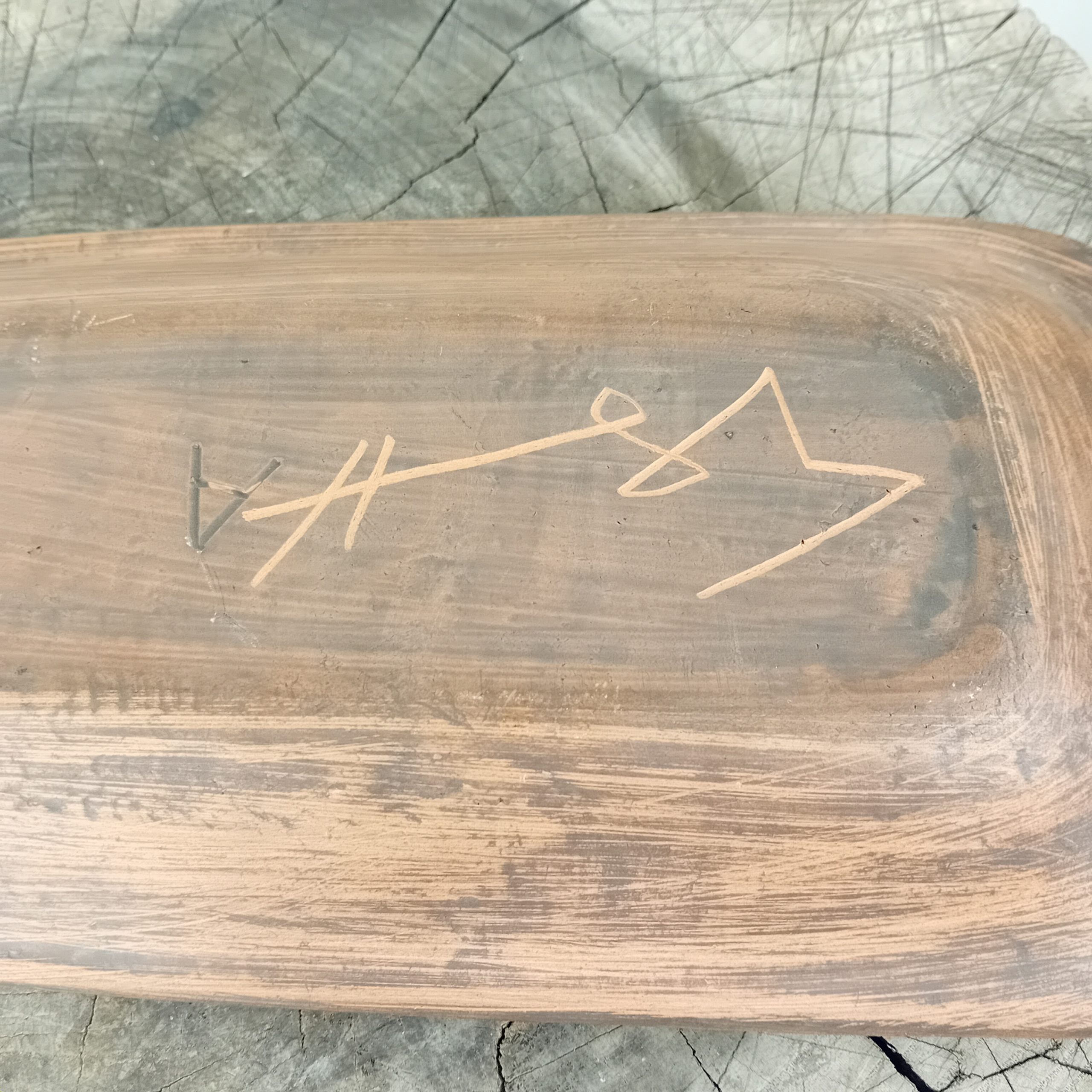 Signature incisée dans le décor et au dos avec la lettre A estampée en creux.
